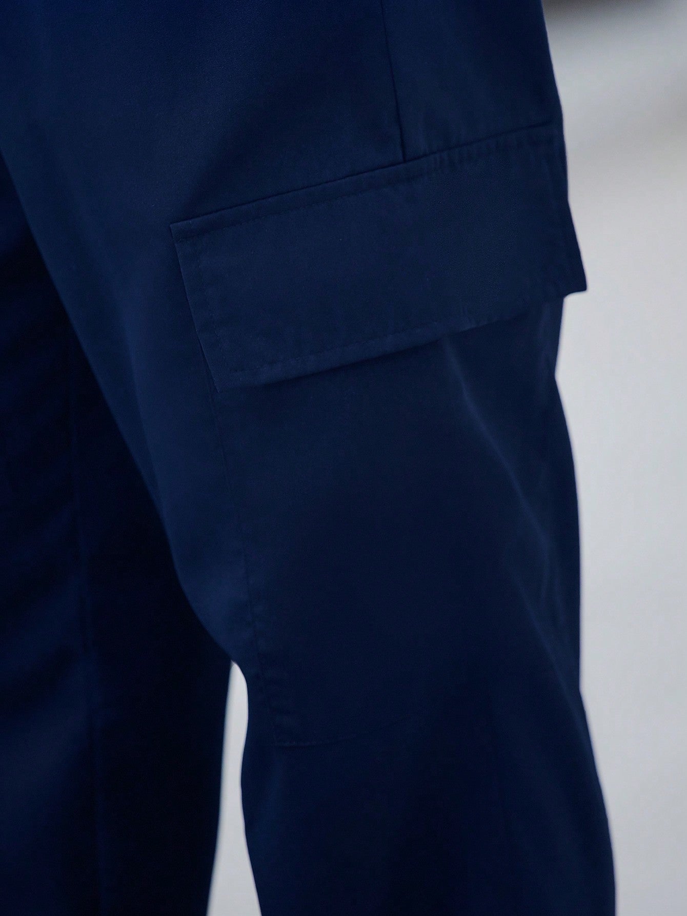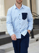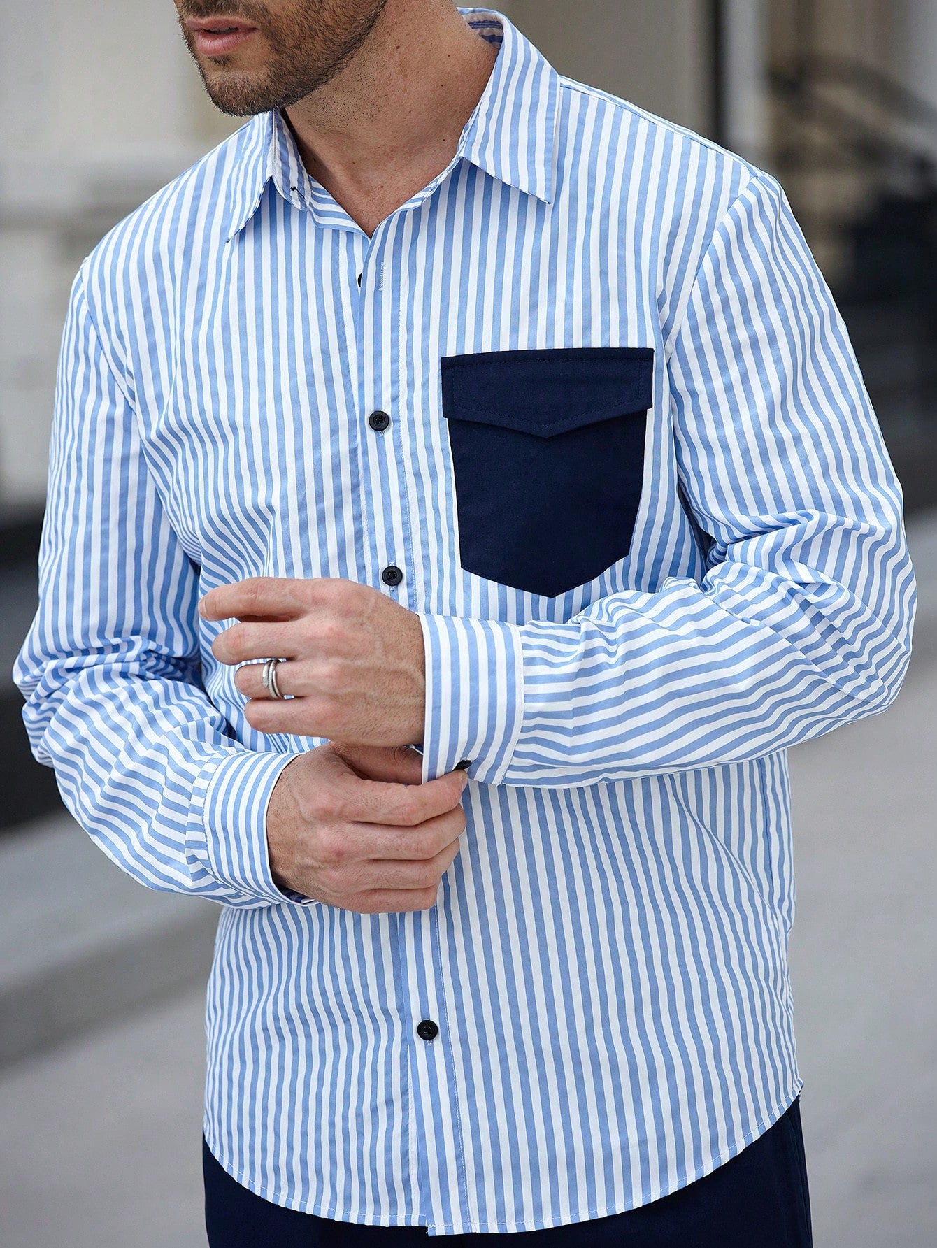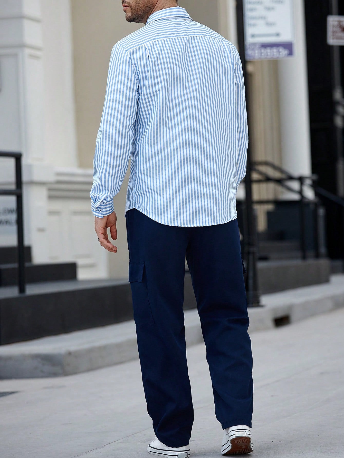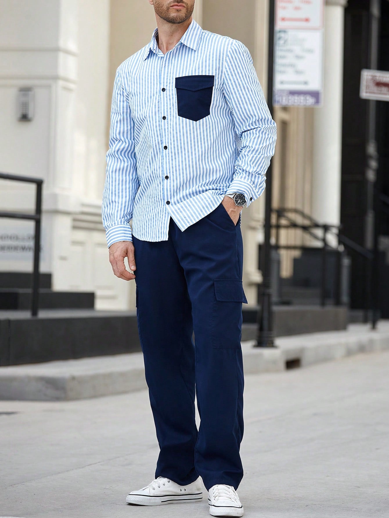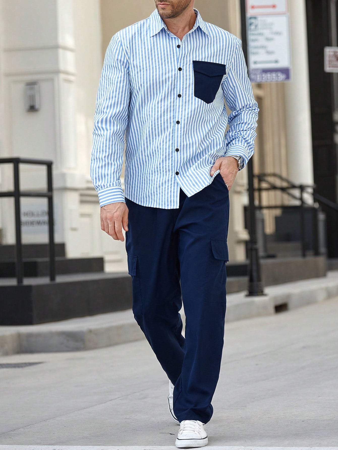 men Manfinity Homme 2pcs/Set Men's Casual Striped Print Contrast Color Flap Pocket Long Sleeve Shirt & Cargo Pants