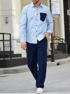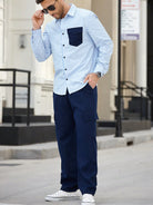 طقم من قطعتين من قميص رجالي كاجوال مخطط بطباعة متباينة الألوان وجيوب بغطاء وأكمام طويلة وبنطلون كارغو من مانفينيتي هوم