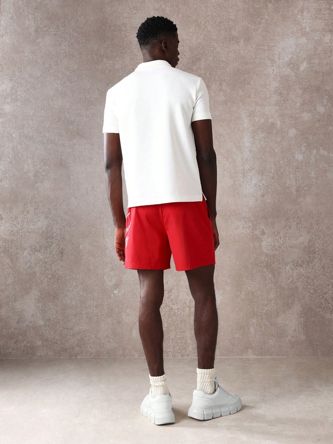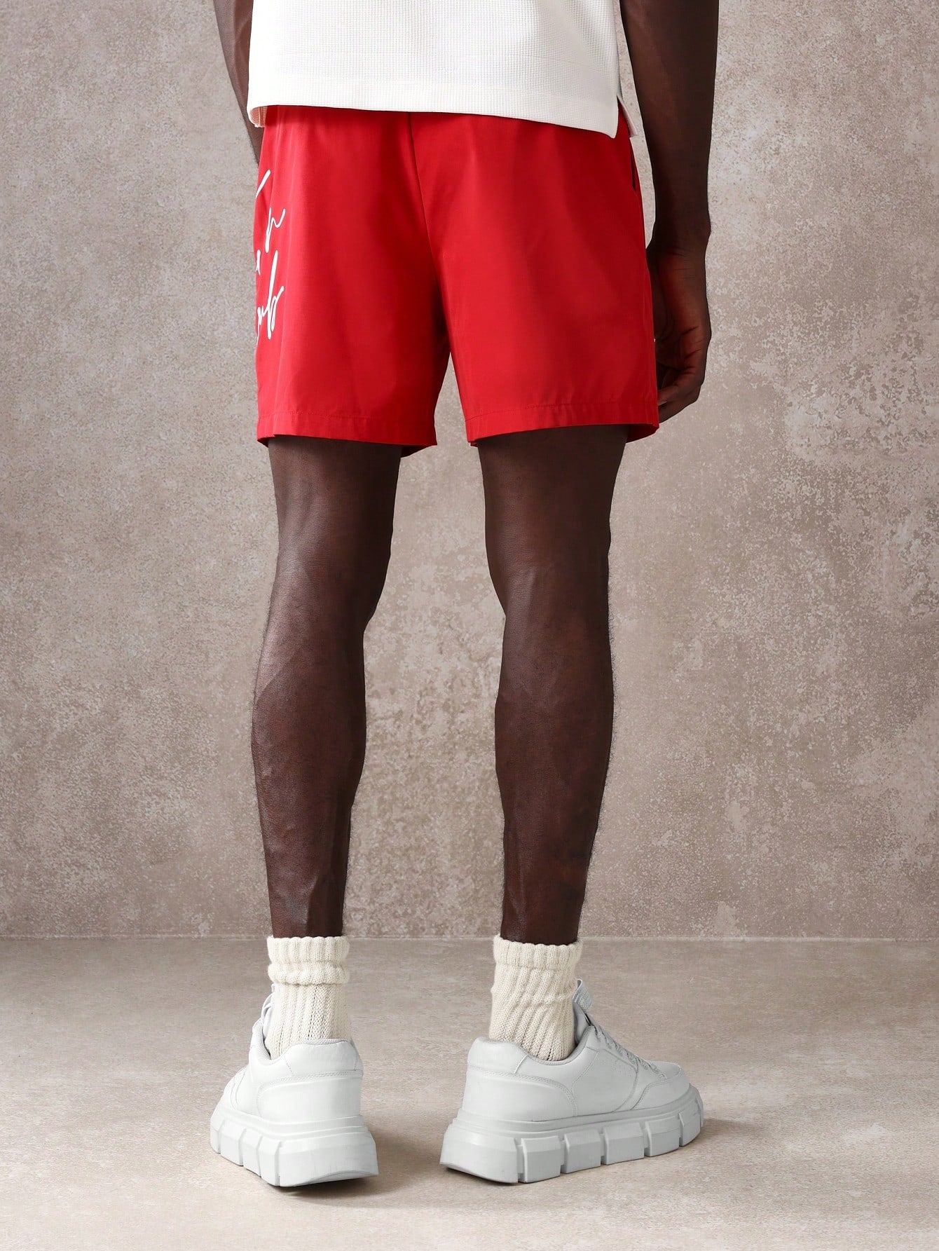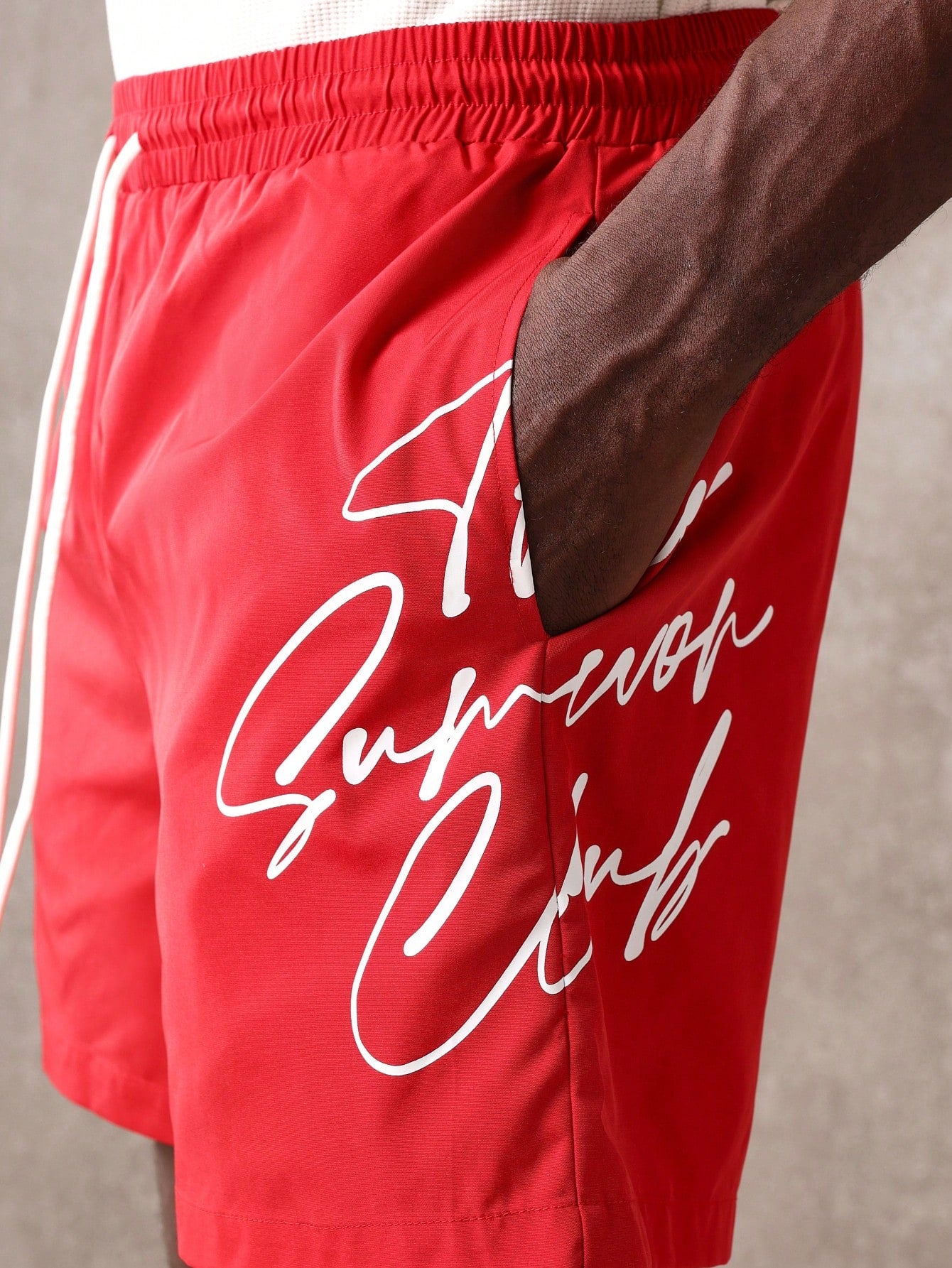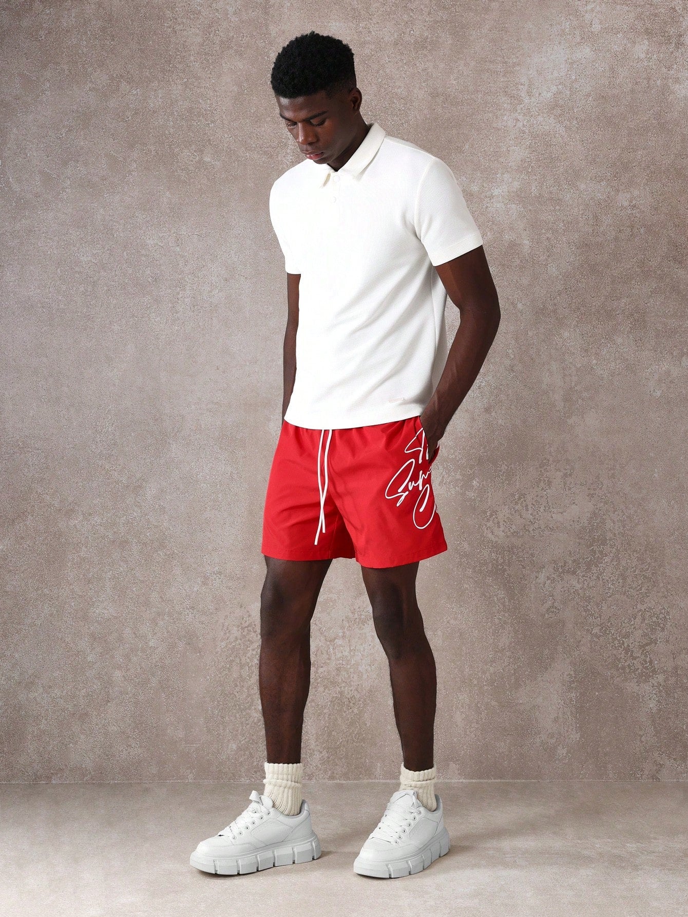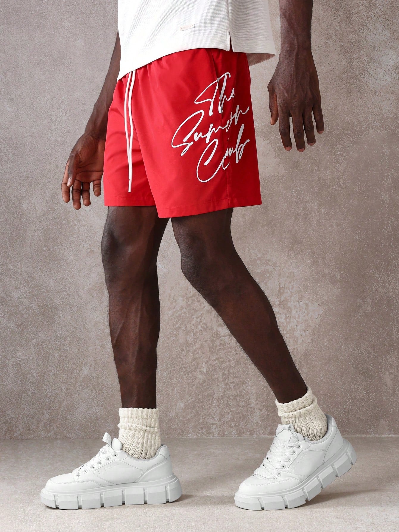 men SUMWON Athletic Performance Quick-Wicking Nylon Shorts Summer Relaxed Fit Workout Running Training Beach Exercise Drawstring Waistband Active Lifestyle Sports Shorts With Side Script Logo Print