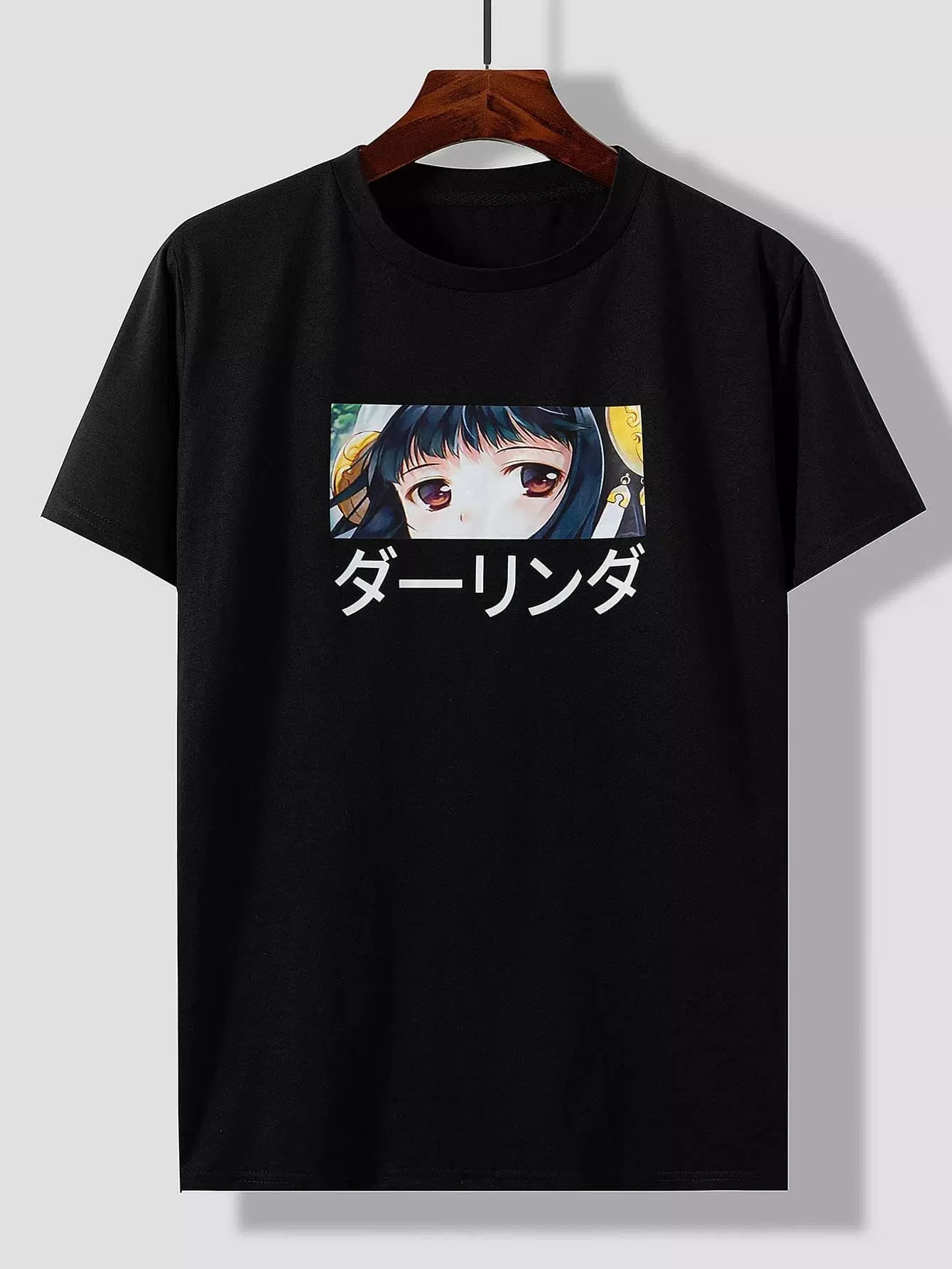 تيشيرت رجالي ياباني بطبعة يابانية وكرتون فتاة
