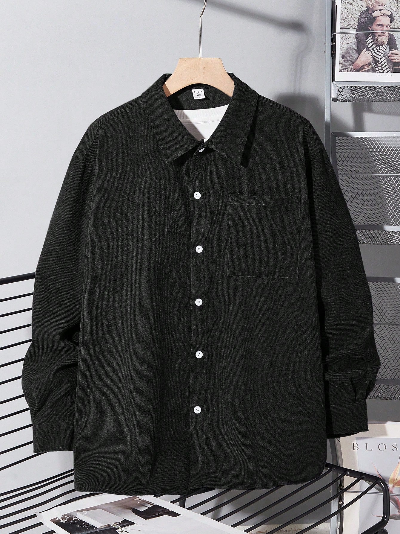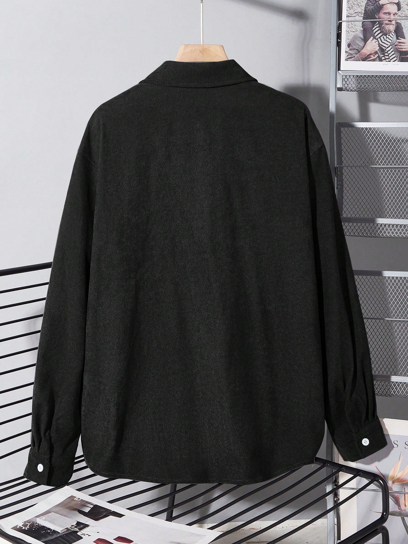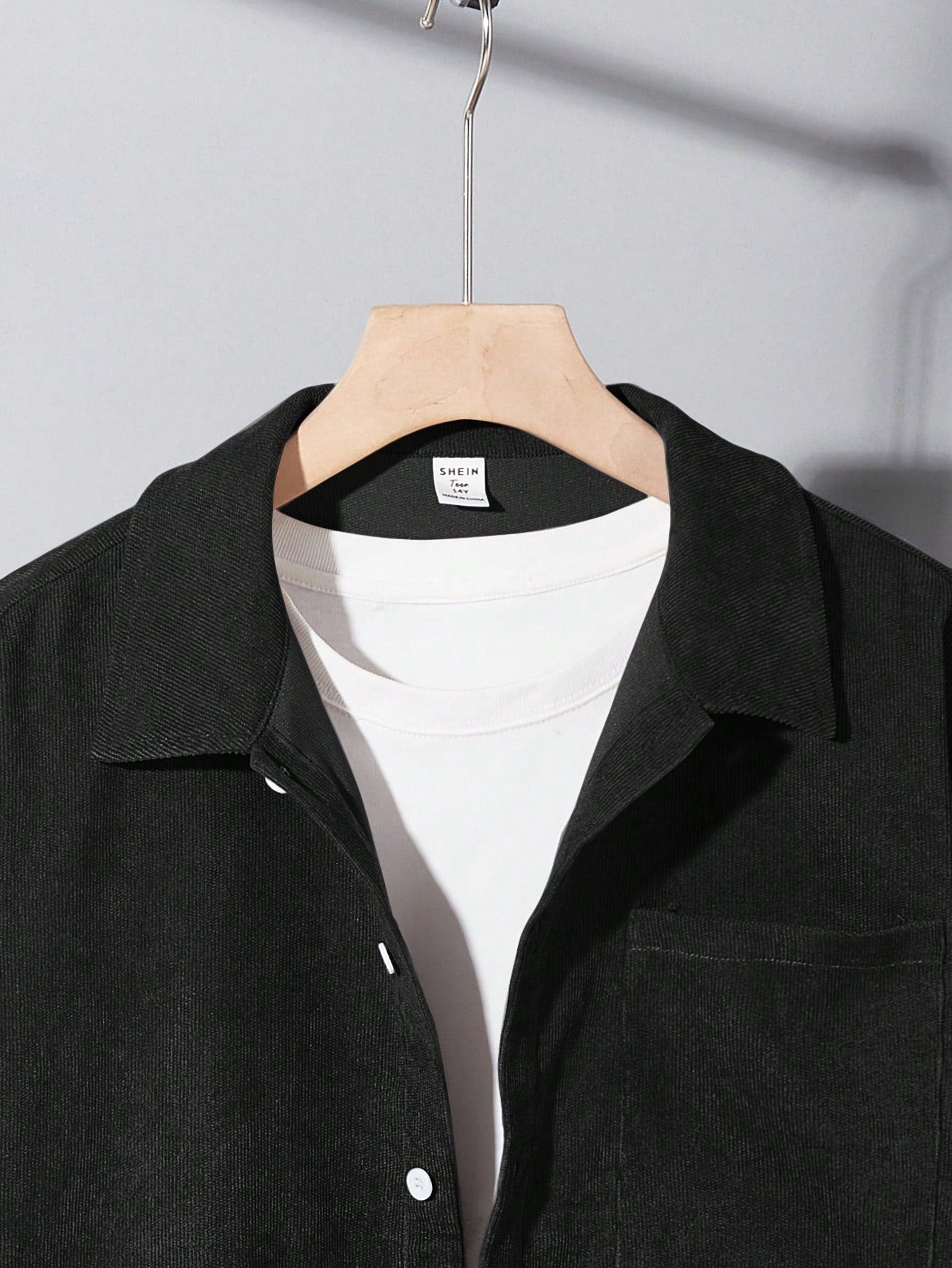 men SHEIN Teen Boys Casual Corduroy Striped Textured Long Sleeve Shirt With Pockets & Turndown Collar
