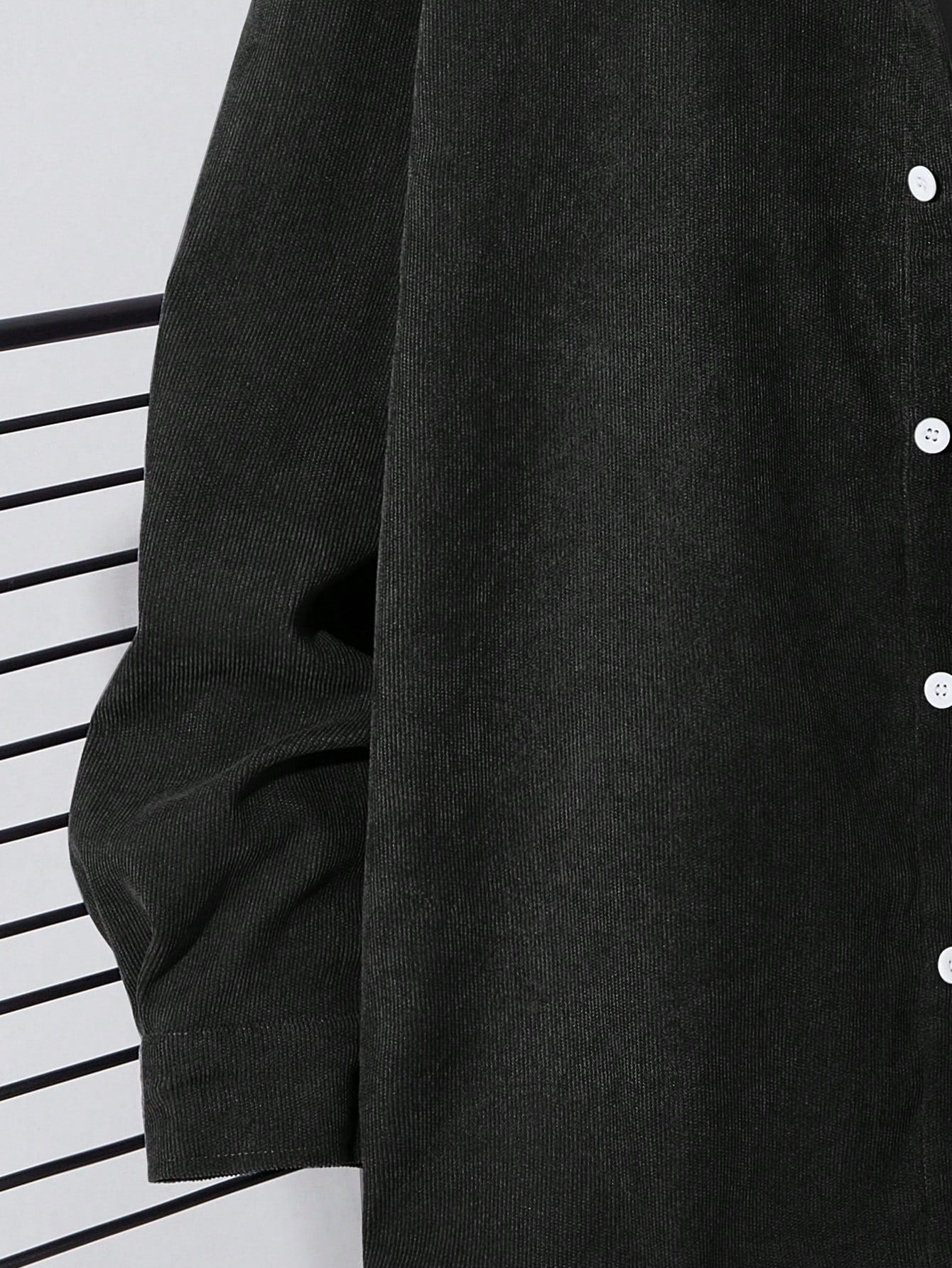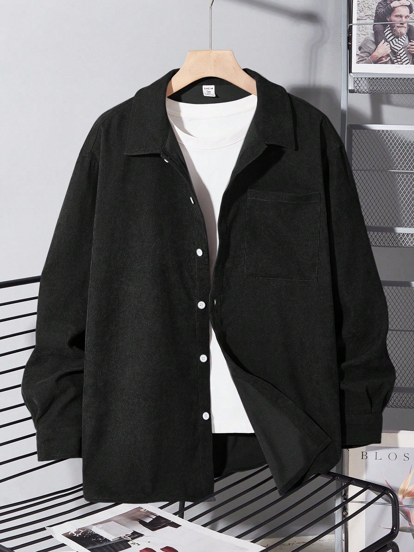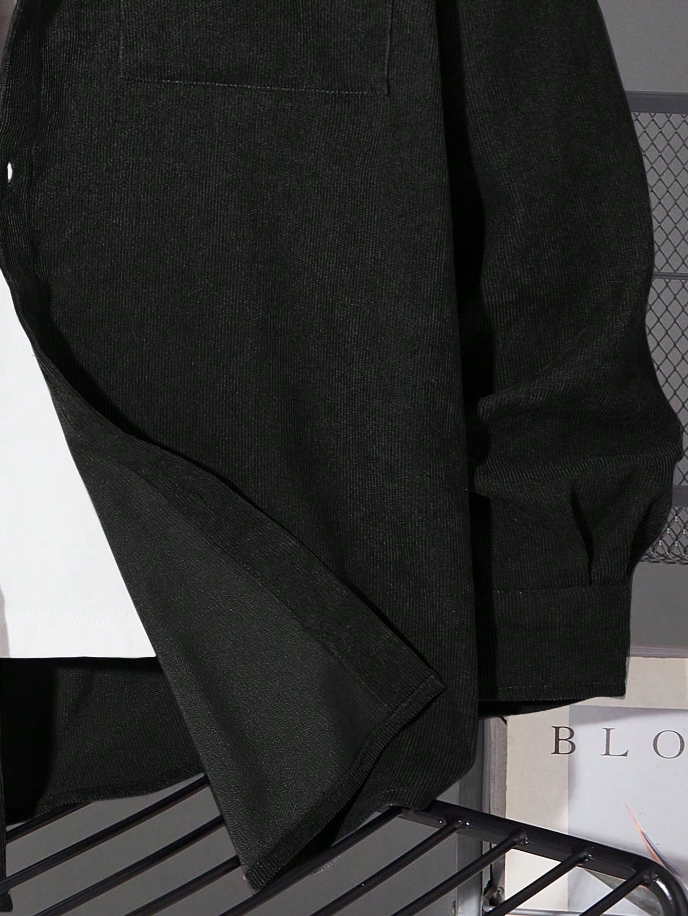 men SHEIN Teen Boys Casual Corduroy Striped Textured Long Sleeve Shirt With Pockets & Turndown Collar