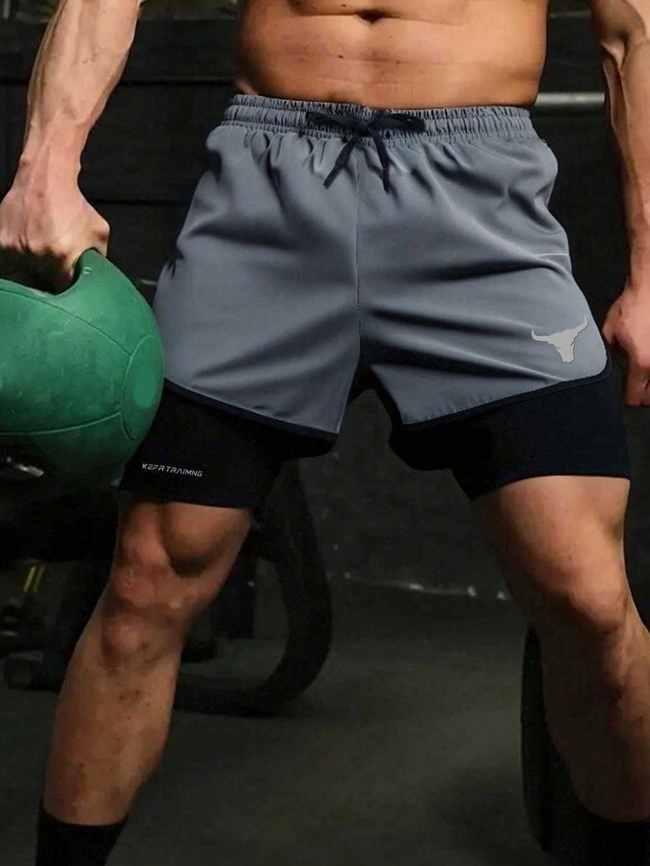 شورت رجالي 2 في 1 سريع الجفاف وجيد التهوية، مزدوج الطبقات، خصر مطاطي مطبوع عليه رأس ثور عصري للرجال