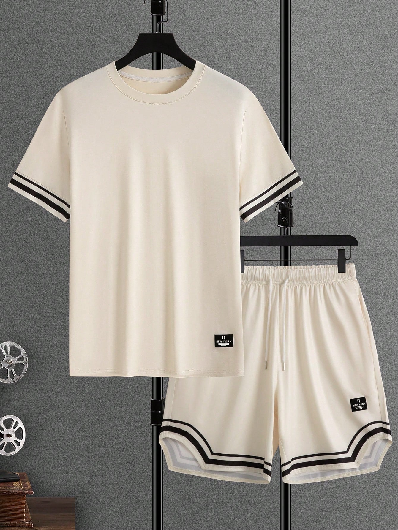 تيشيرت رجالي مخطط مطبوع برقبة دائرية وأكمام قصيرة من مانفينيتي هوم، مع شورت قصير بخصر برباط.