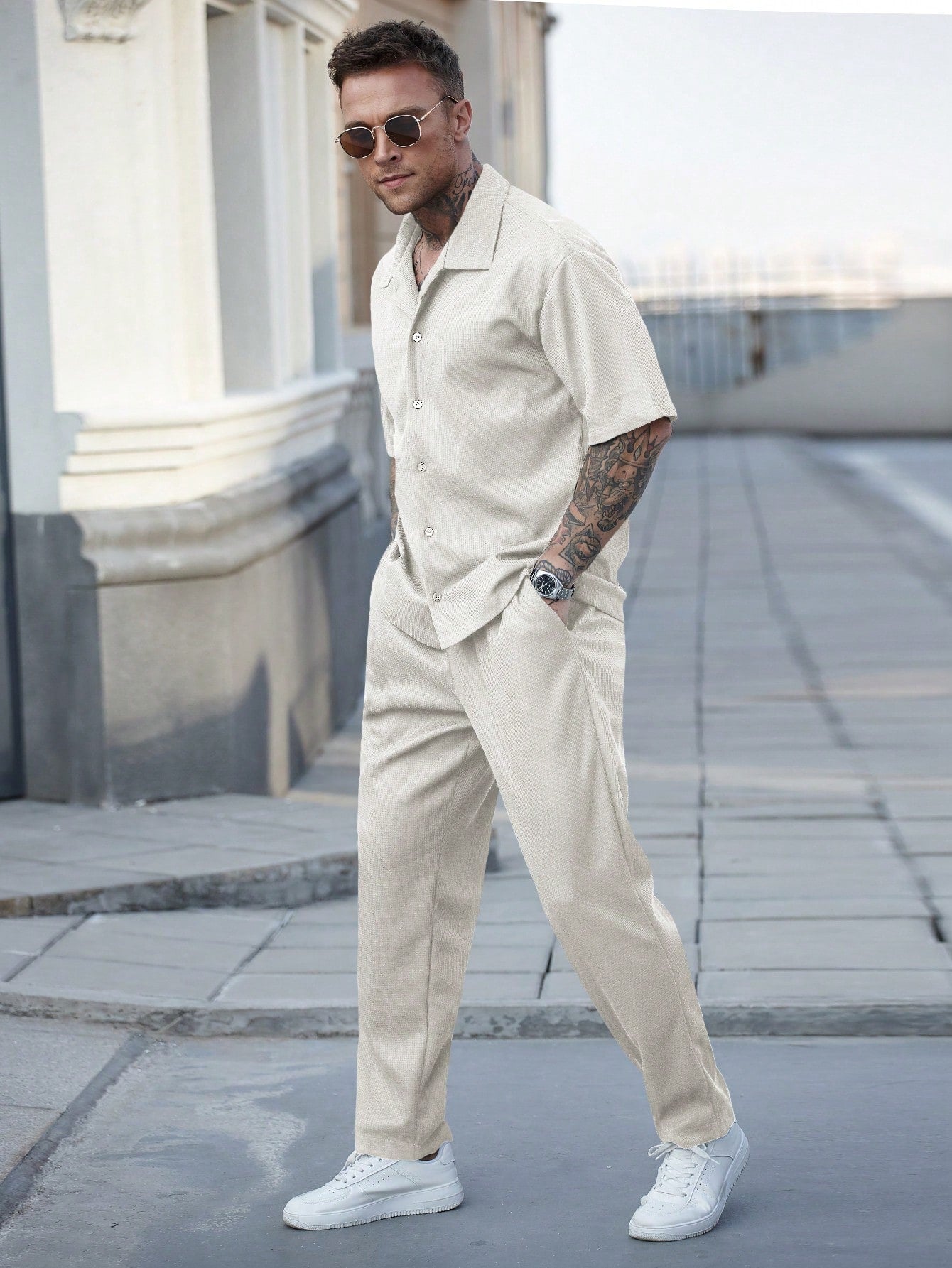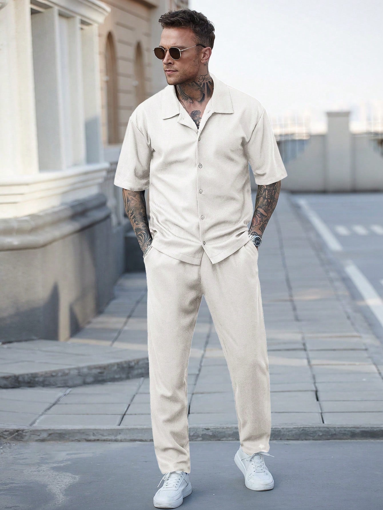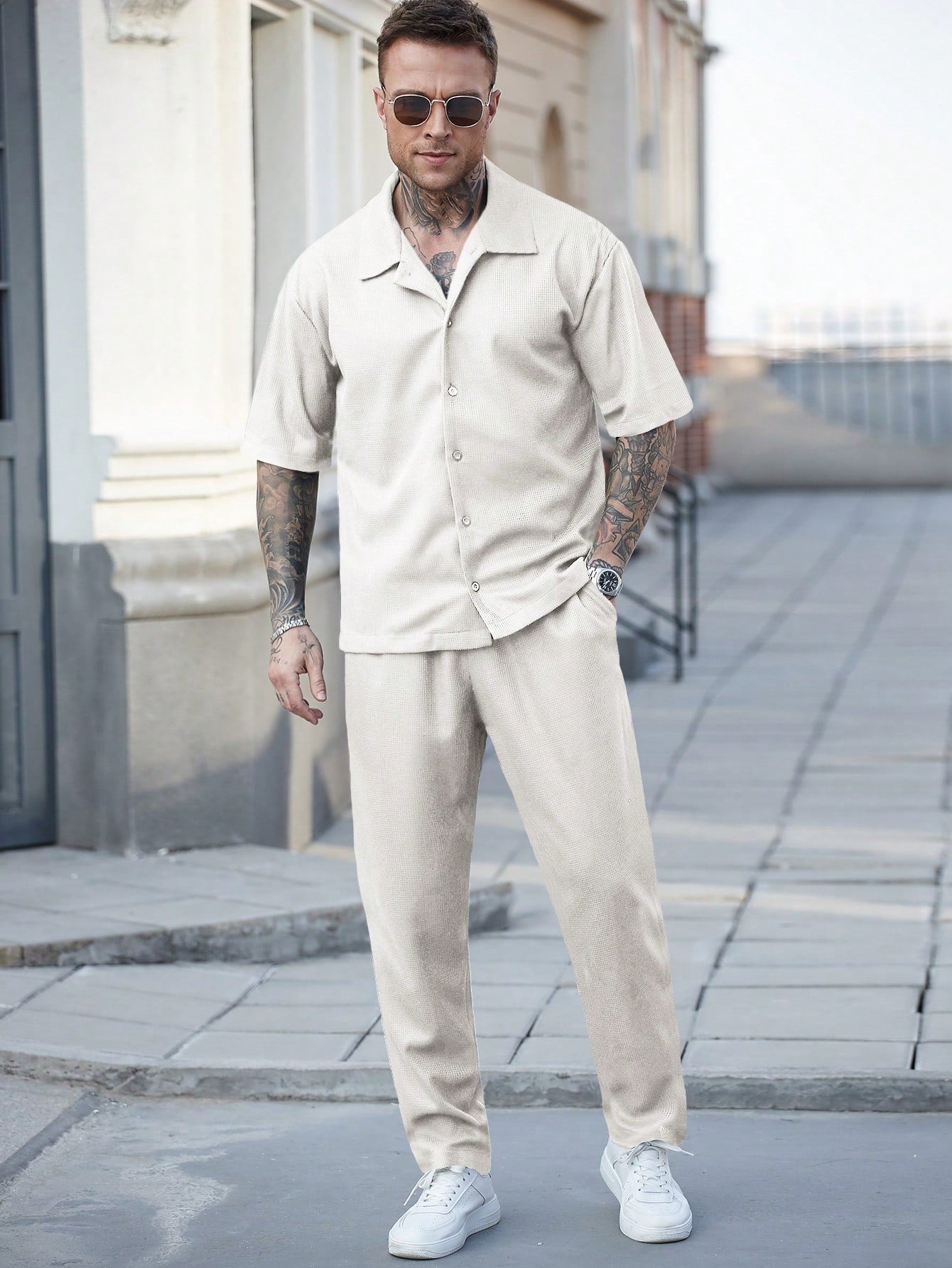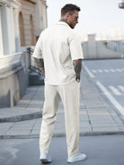 طقم رجالي كاجوال من مانفينيتي هوم، قميص وبنطال بنسيج الوافل