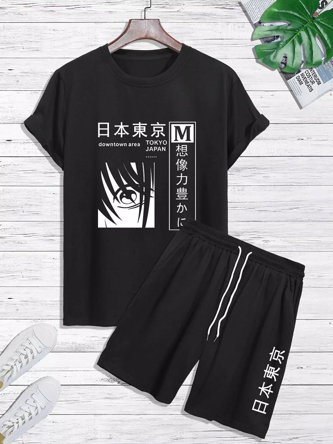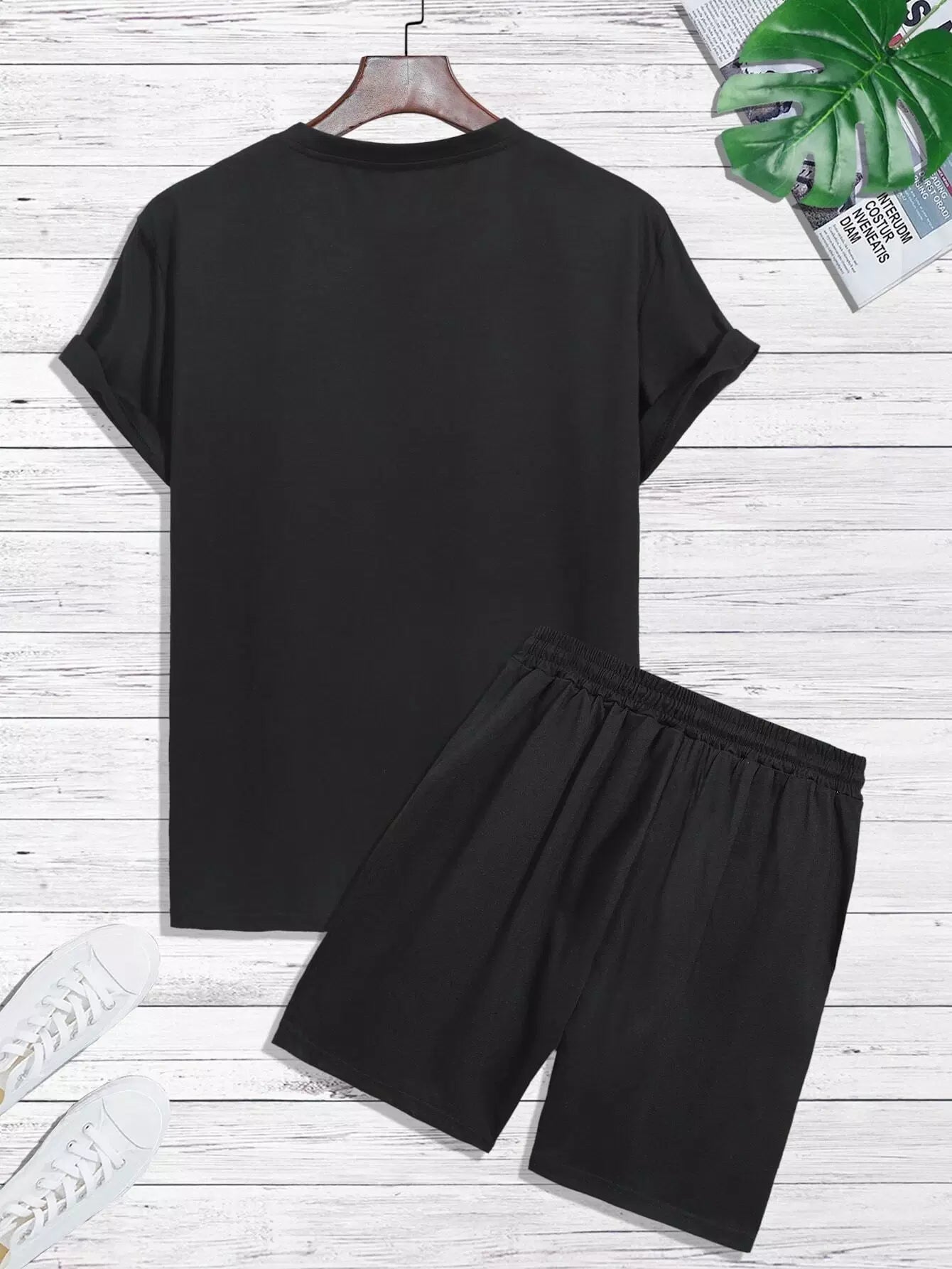 تيشيرت رجالي برسومات كارتونية ورسومات حروف وشورت بخصر مربوط