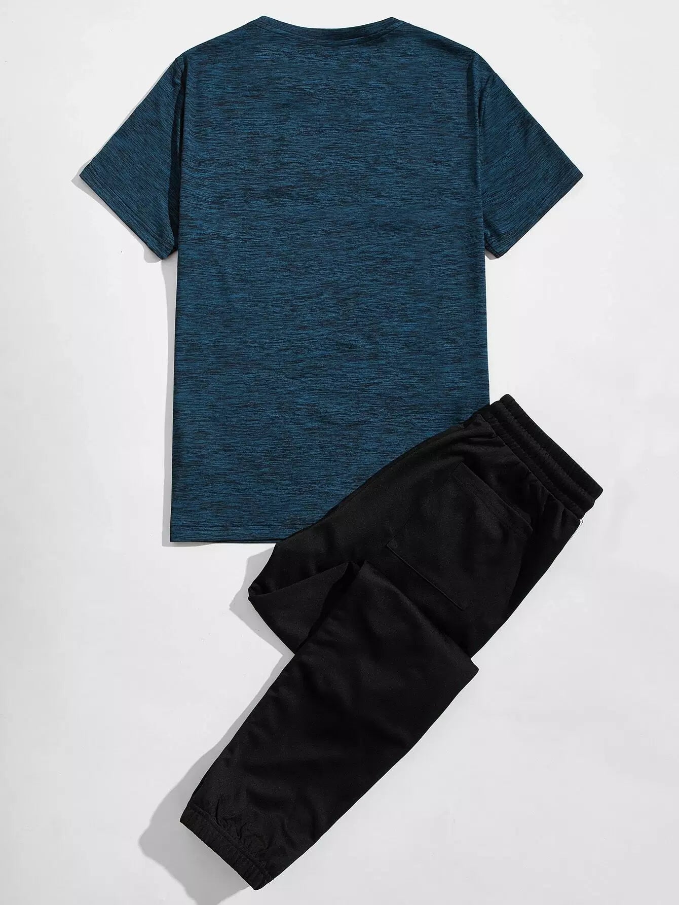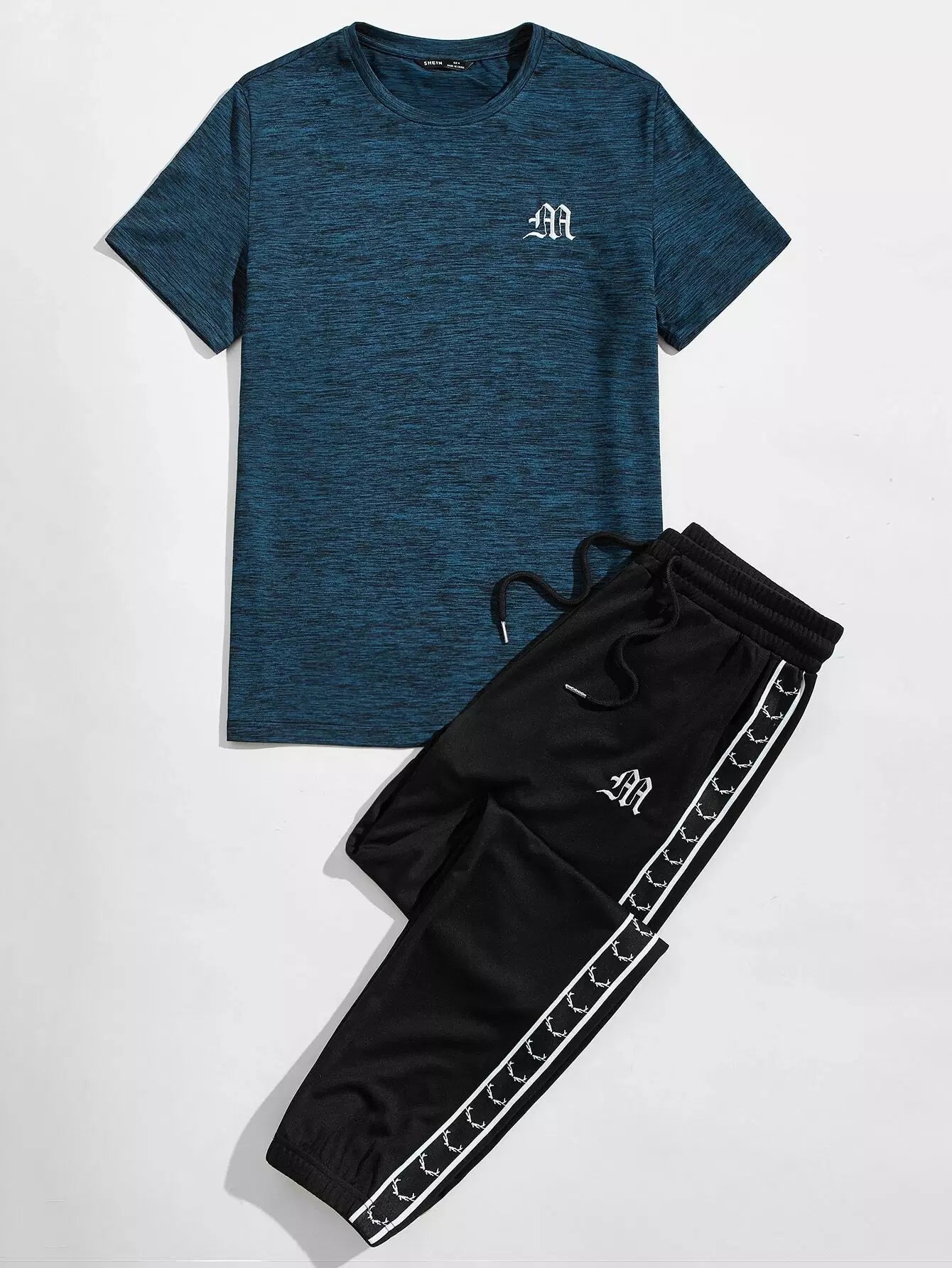 طقم تي شيرت رجالي محبوك برسومات حروف للرجال وبنطال رياضي مخطط جانبي
