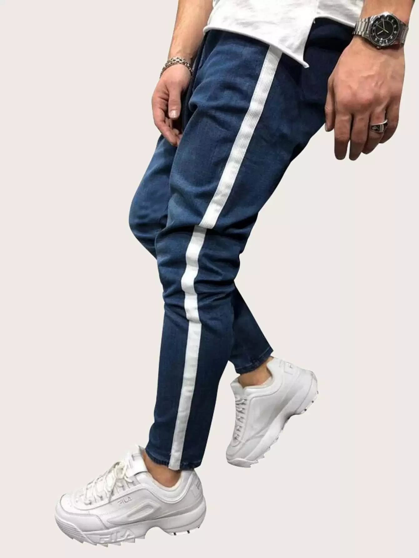 الرجال - بنطال جينز للرجال برباط جانبي وشريط جانبي متباين