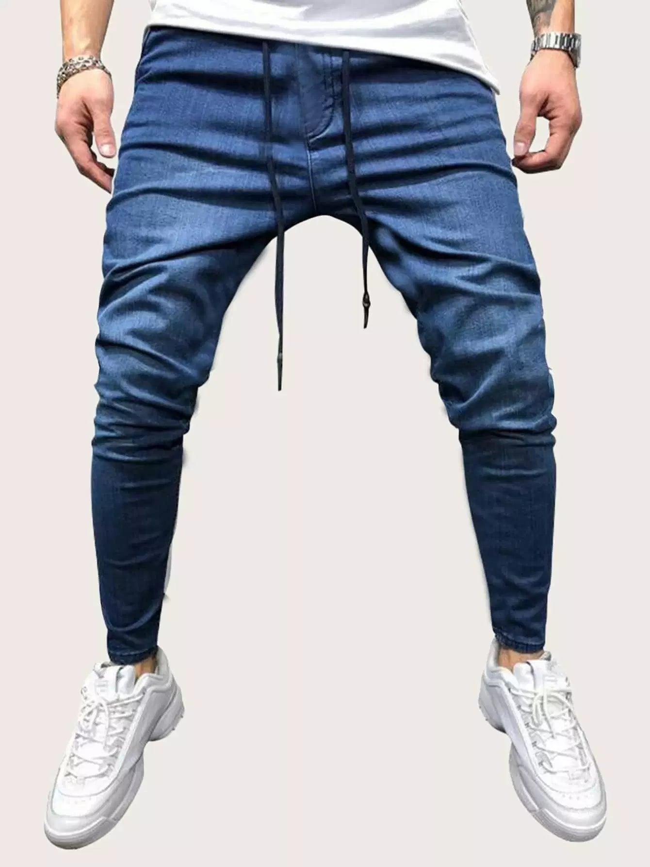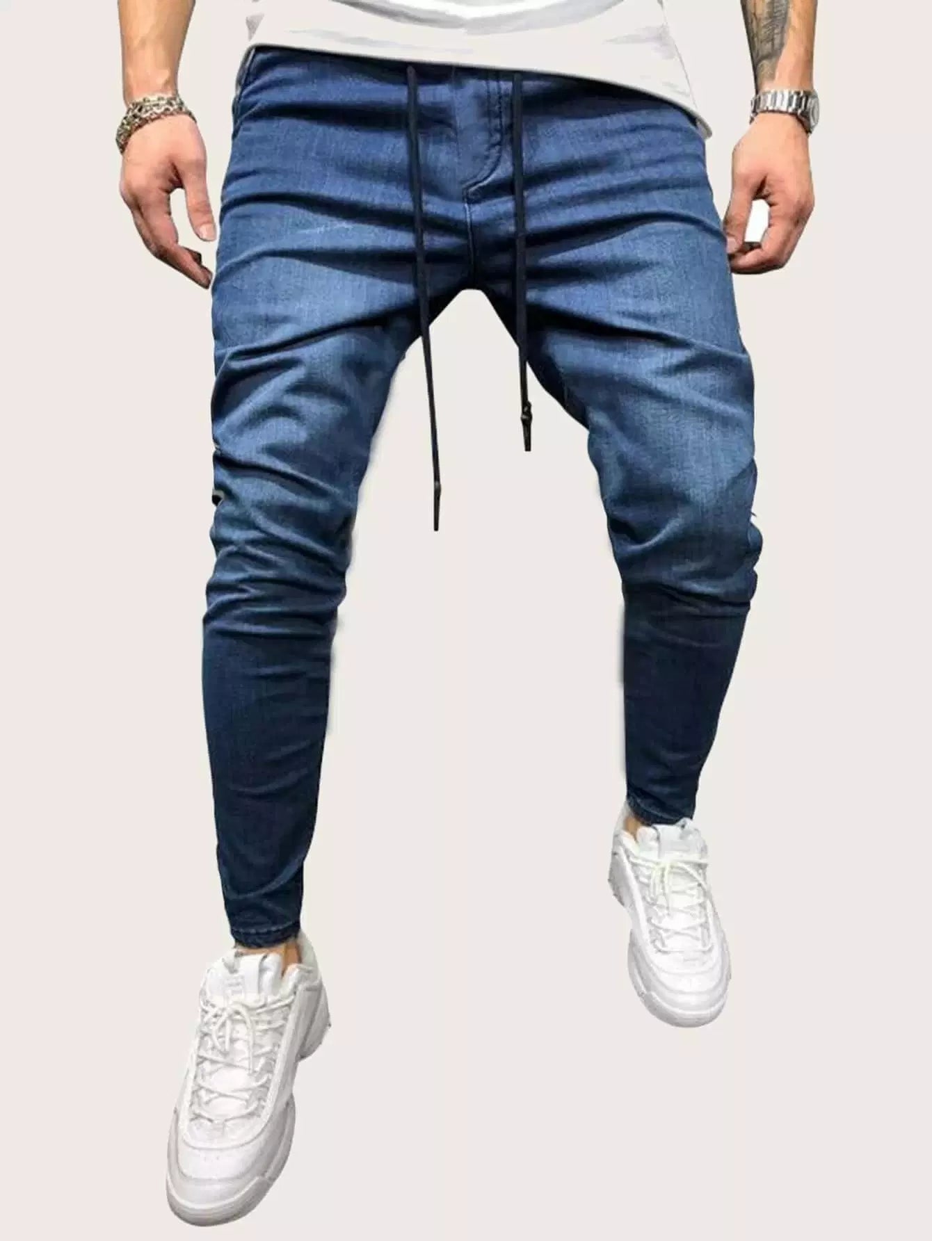 بنطلون جينز بخصر برباط جانبي بلون مغاير للرجال