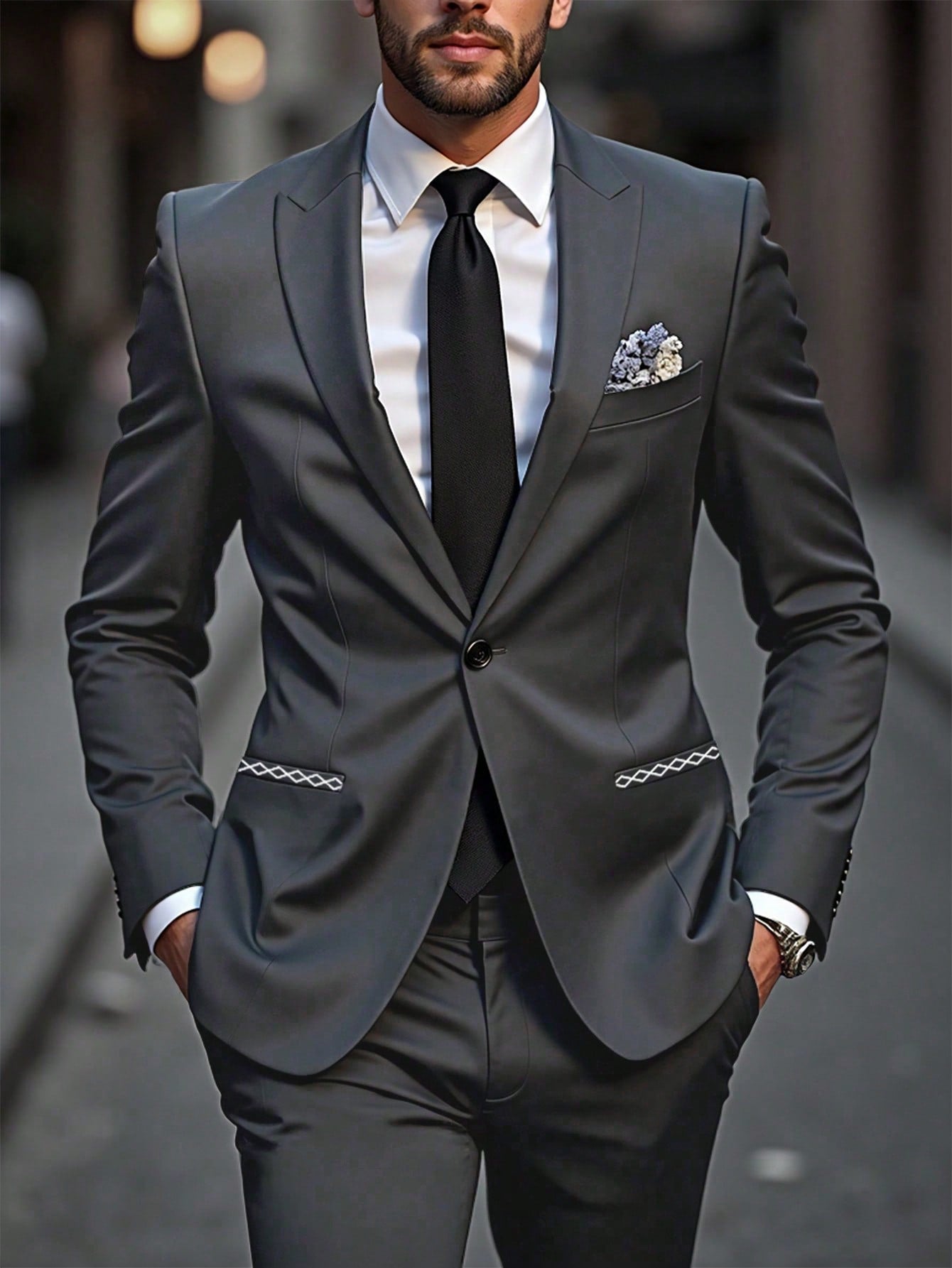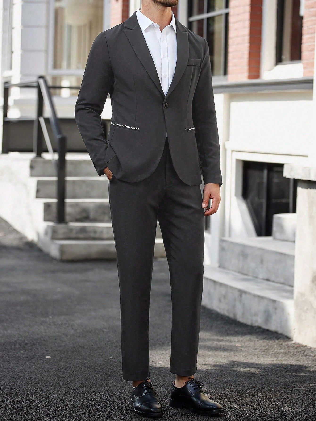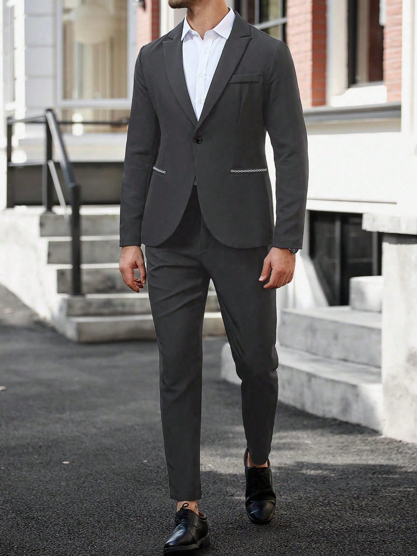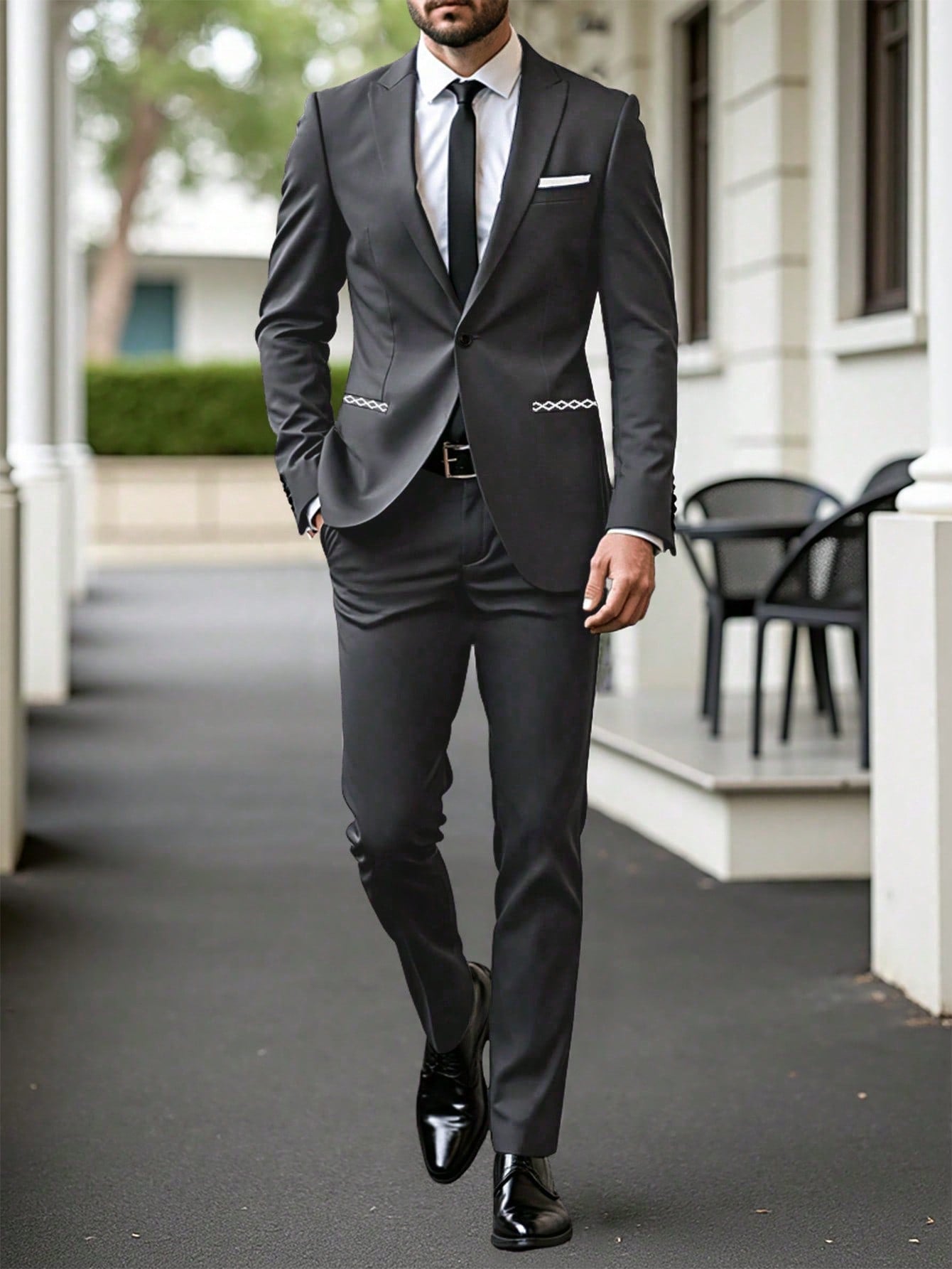 طقم بدلة رجالية من مانفينيتي مود، مكون من جاكيت وبنطال بأكمام طويلة وياقة مطوية، مناسب للعمل والمناسبات الرسمية وحفلات الزفاف.