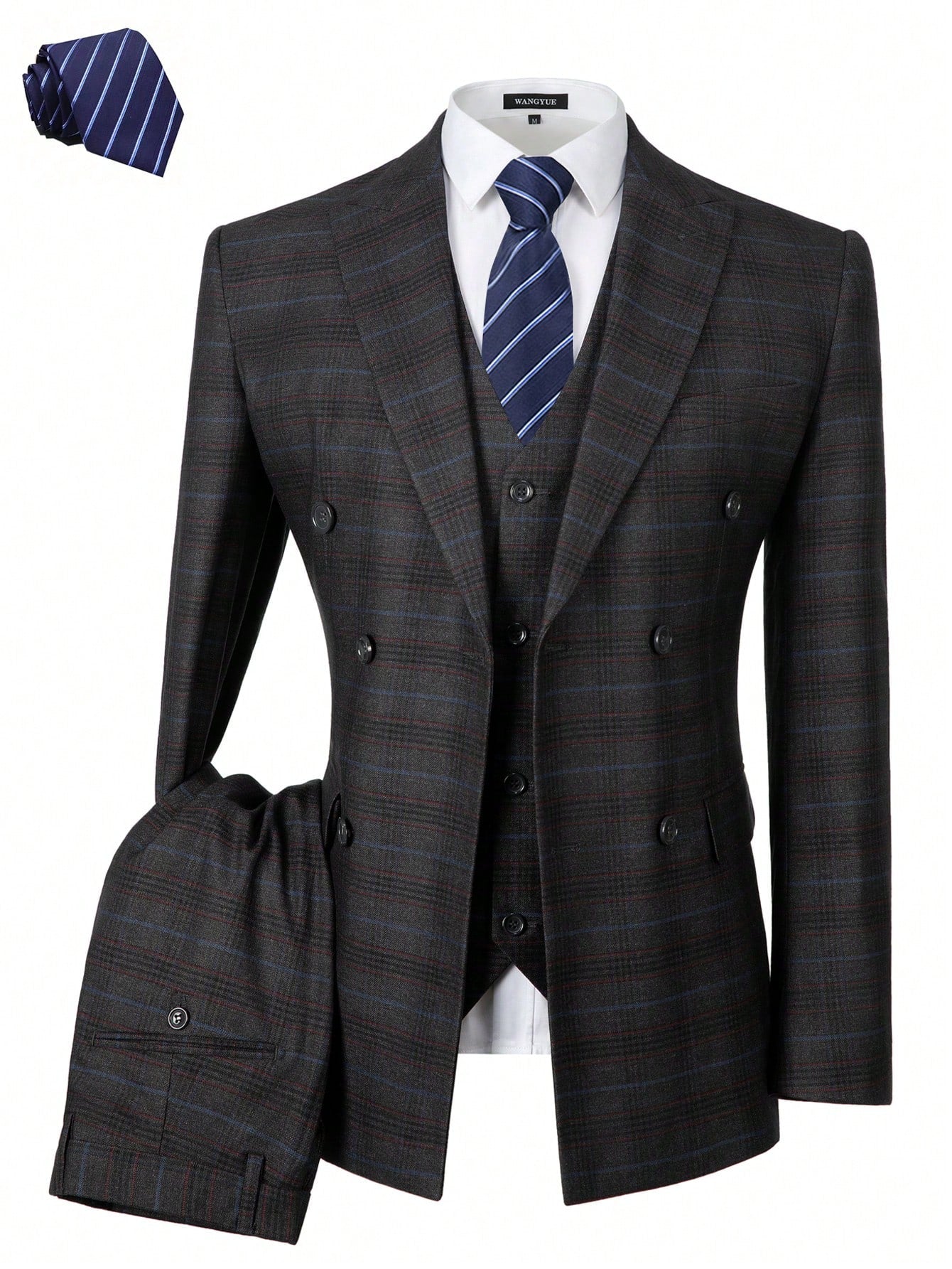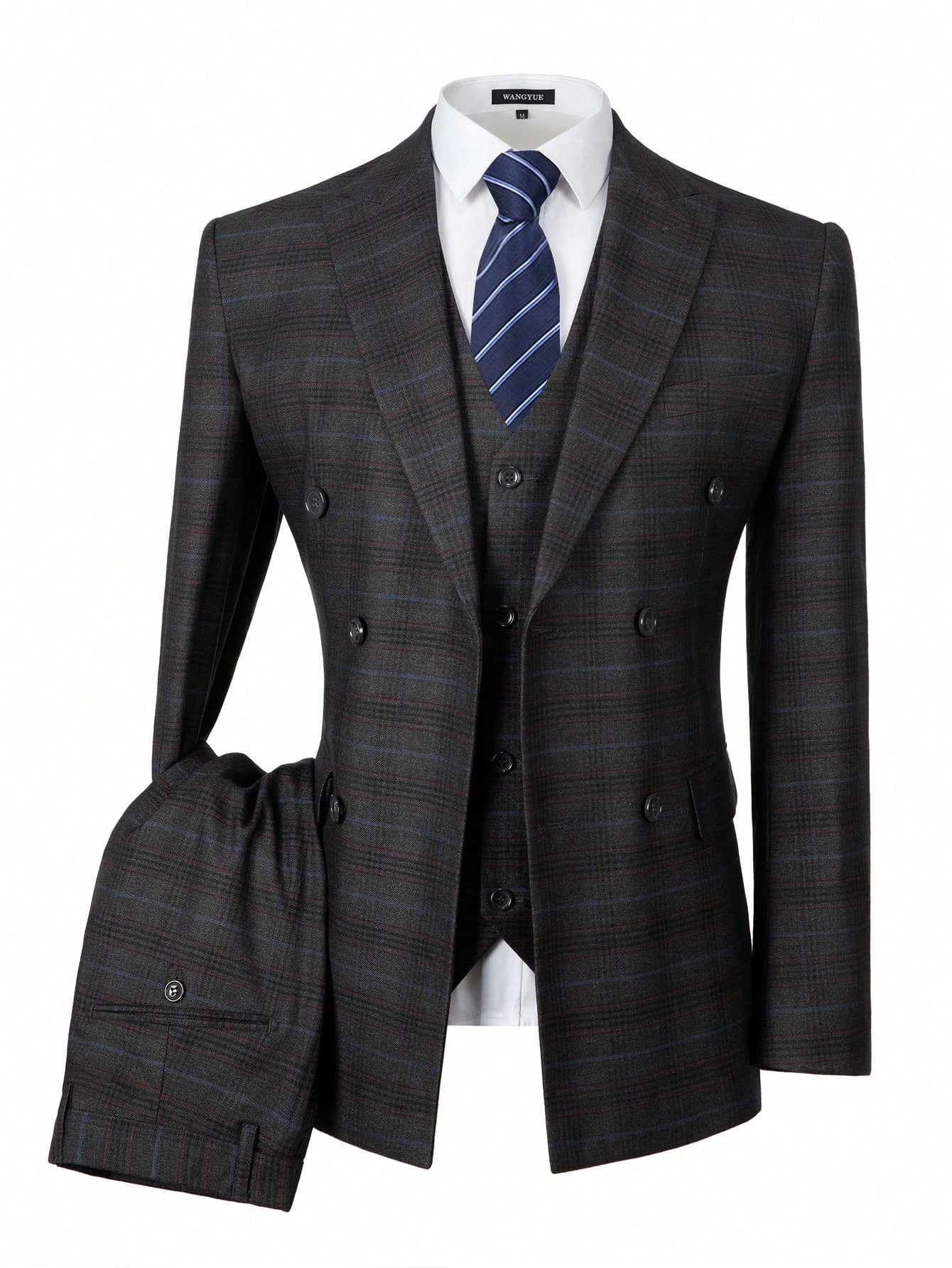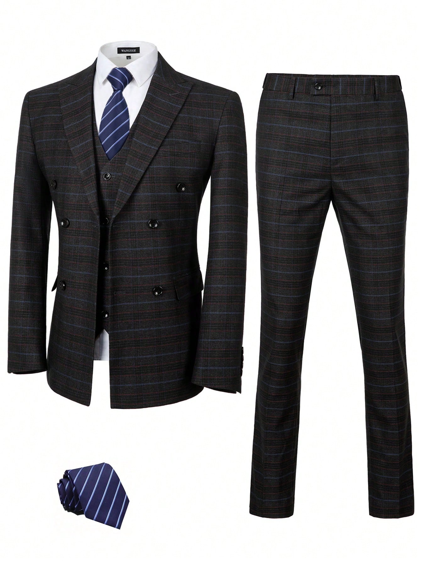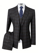 Furuyal Men's Suits Plaid Elegance Slim Fit Double Breasted Party 3 Pieces Suit For Men Blazer Vest Pants