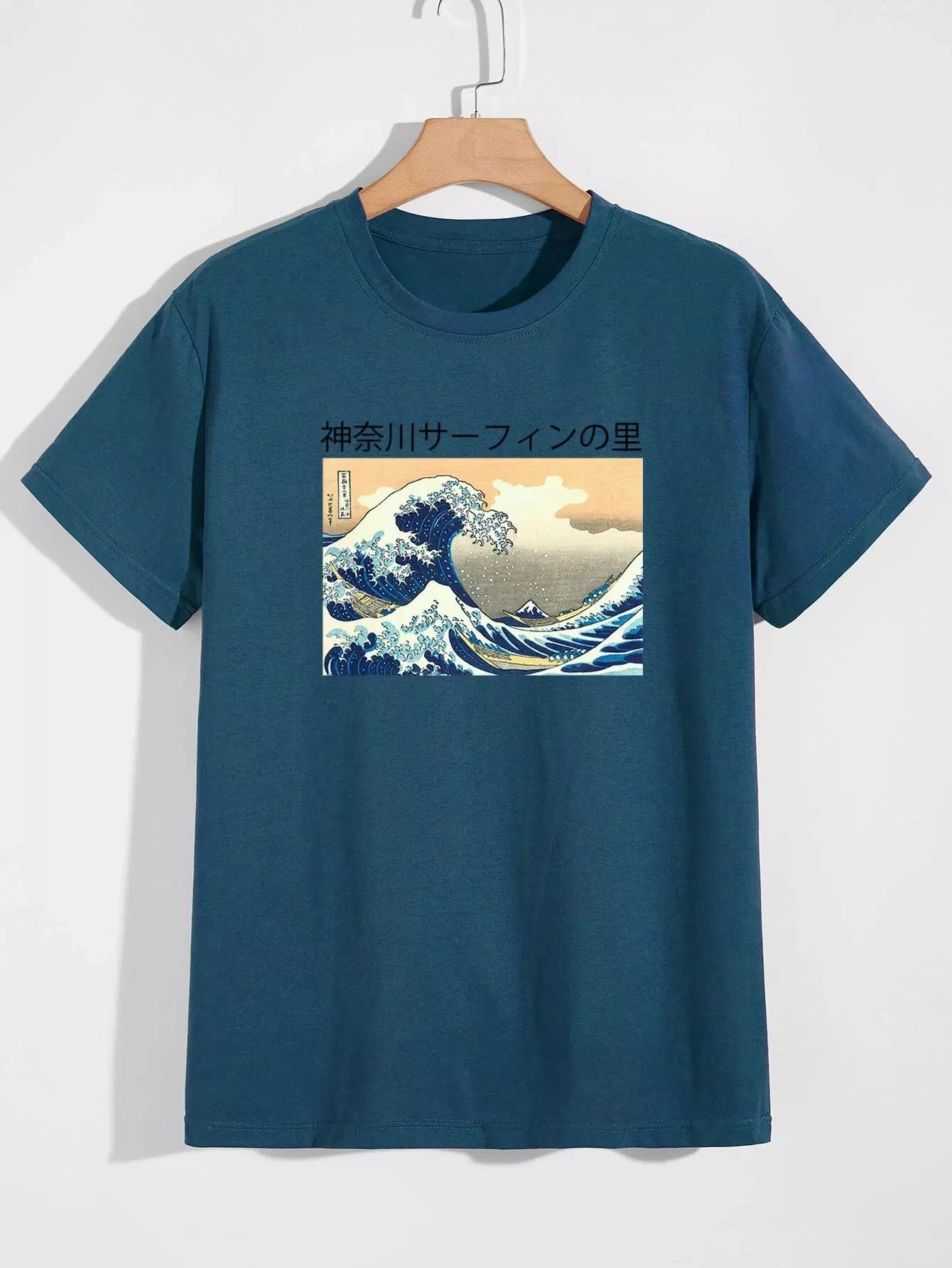 تي شيرت بطبعة حروف وأمواج يابانية للرجال