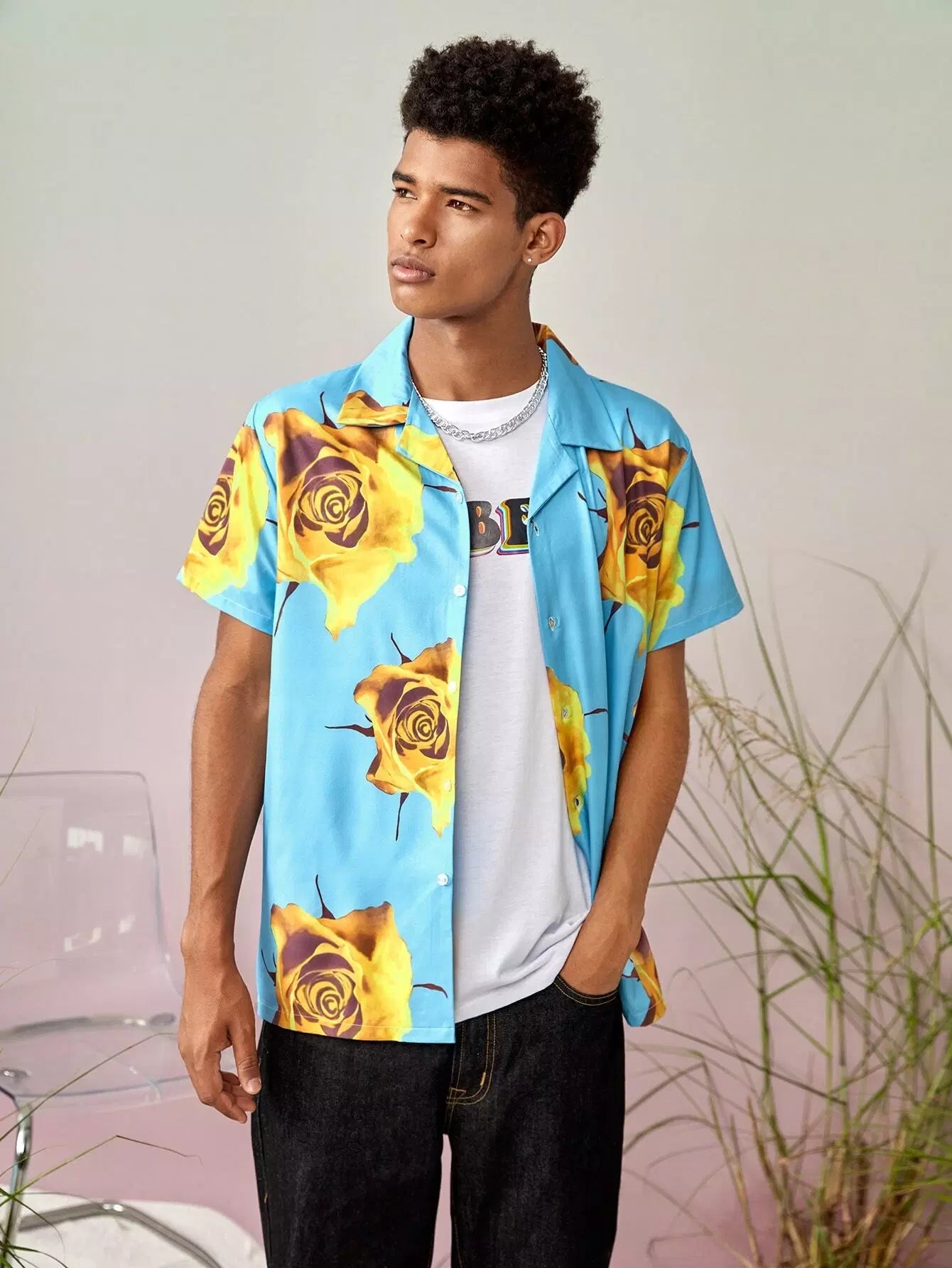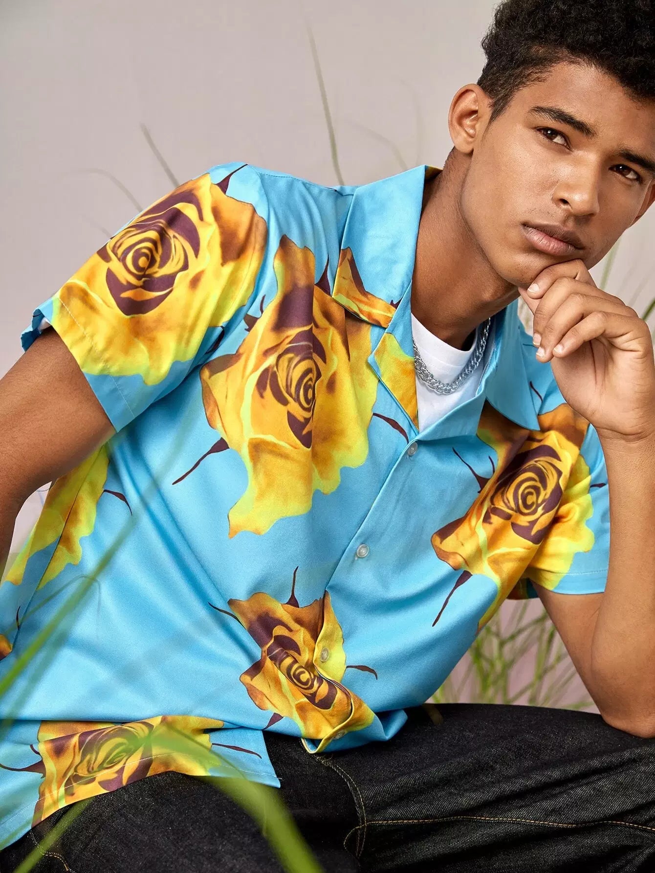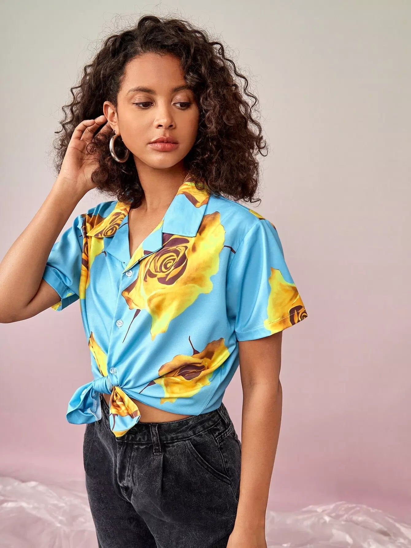1 قطعة قميص مطبوع عليه أزرار مطبوع عليها وردة