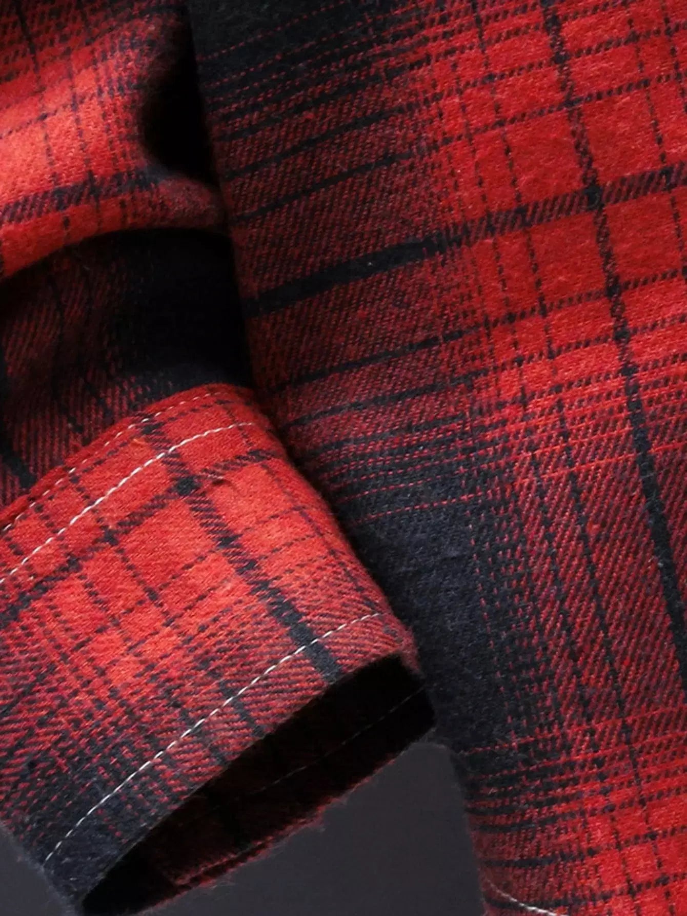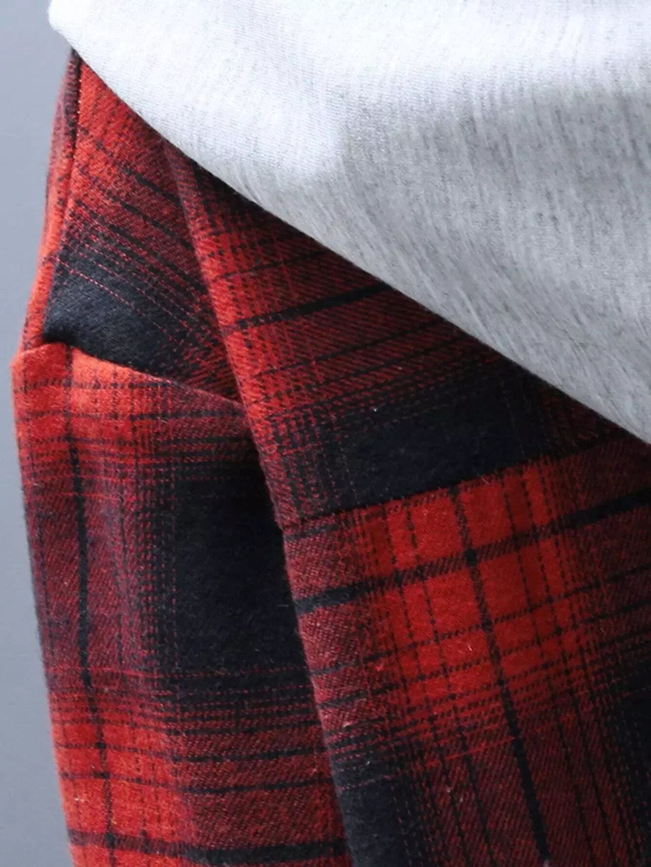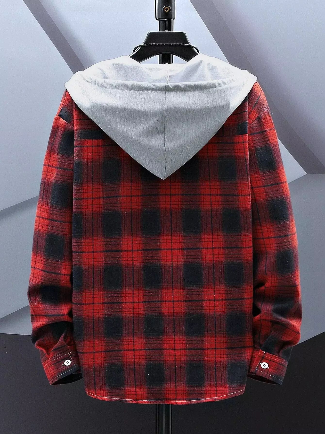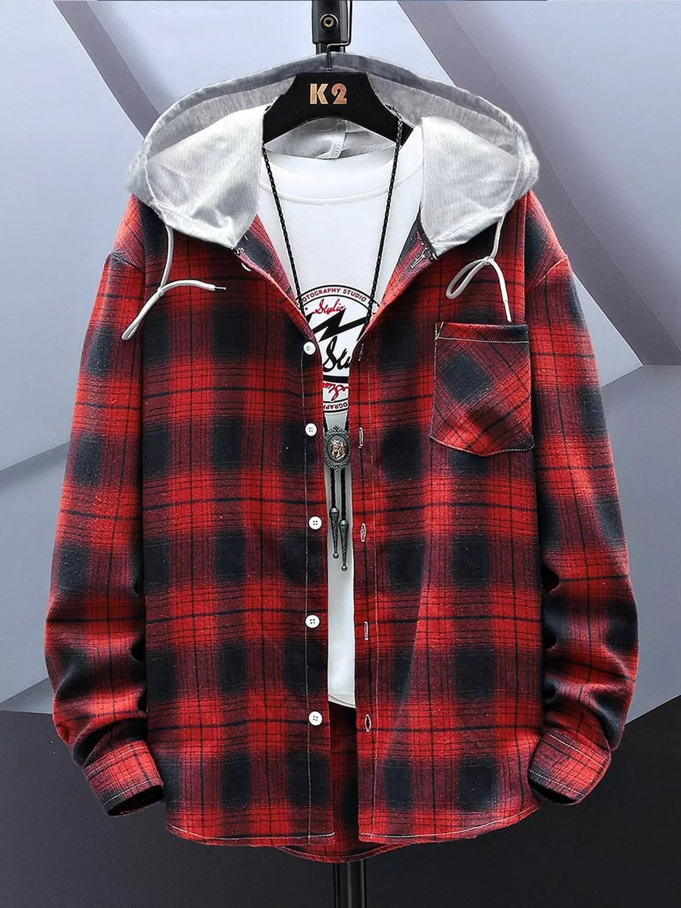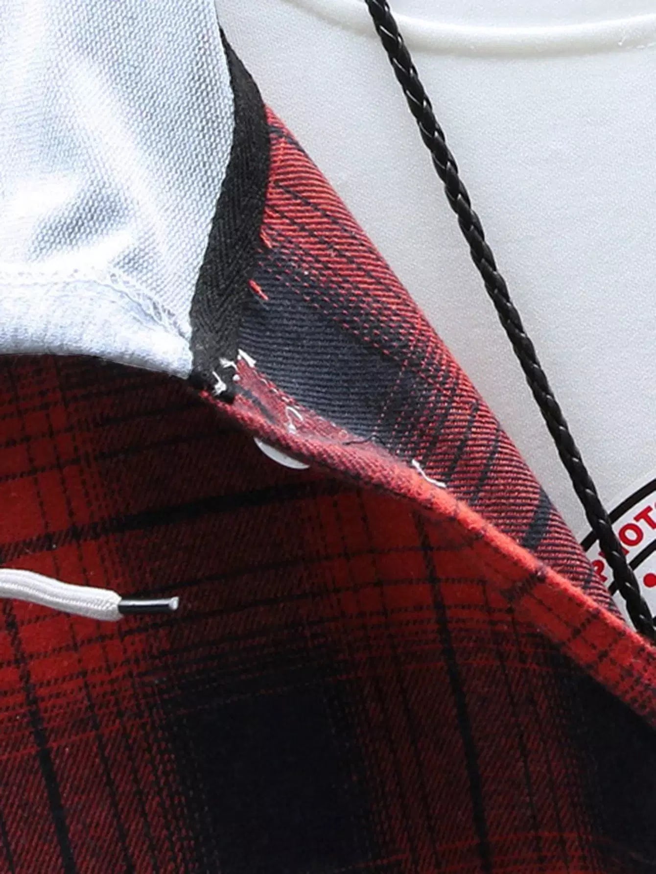 قميص رجالي بغطاء رأس وسحّاب بطبعة مربعات بدون تي شيرت