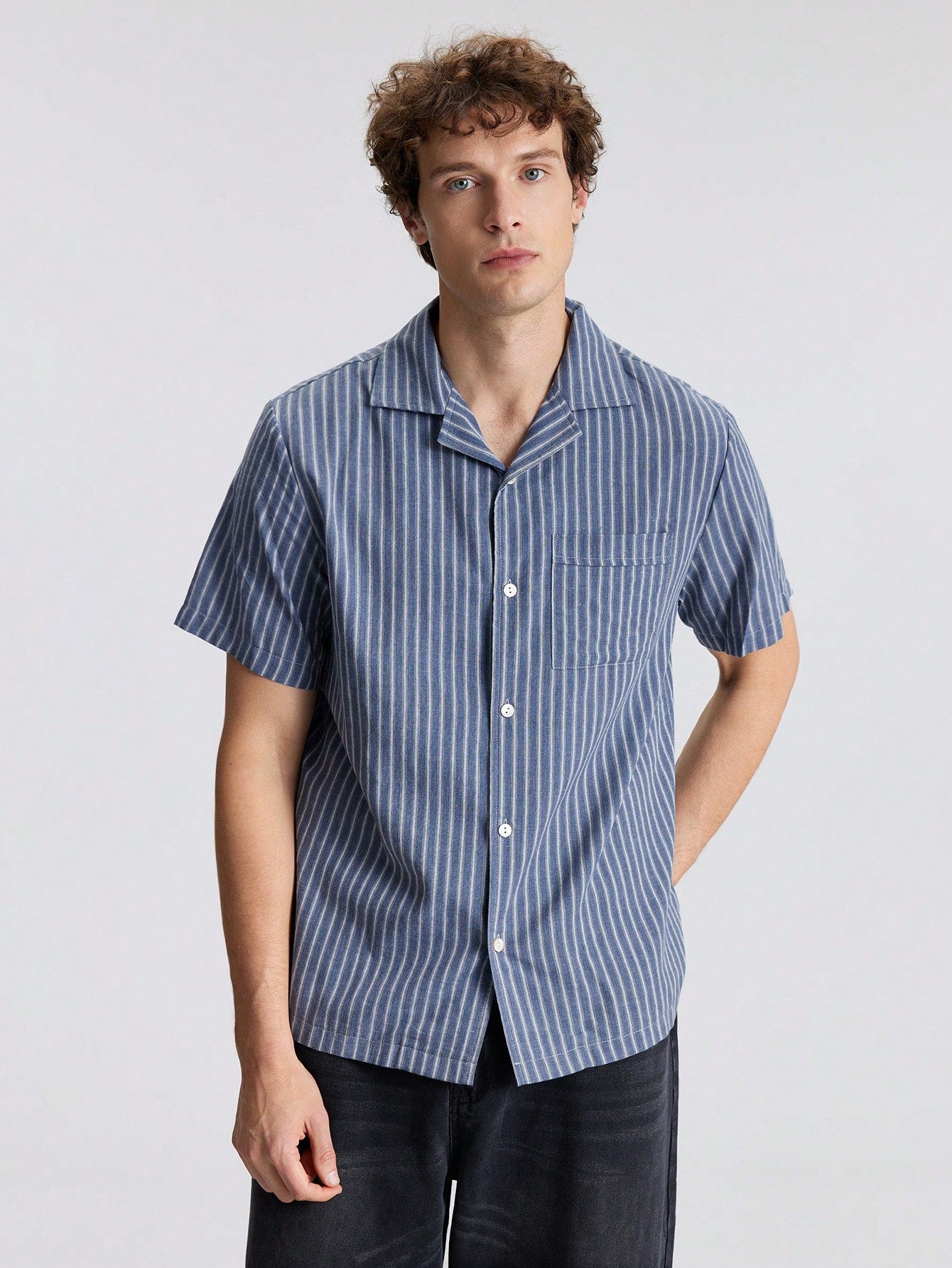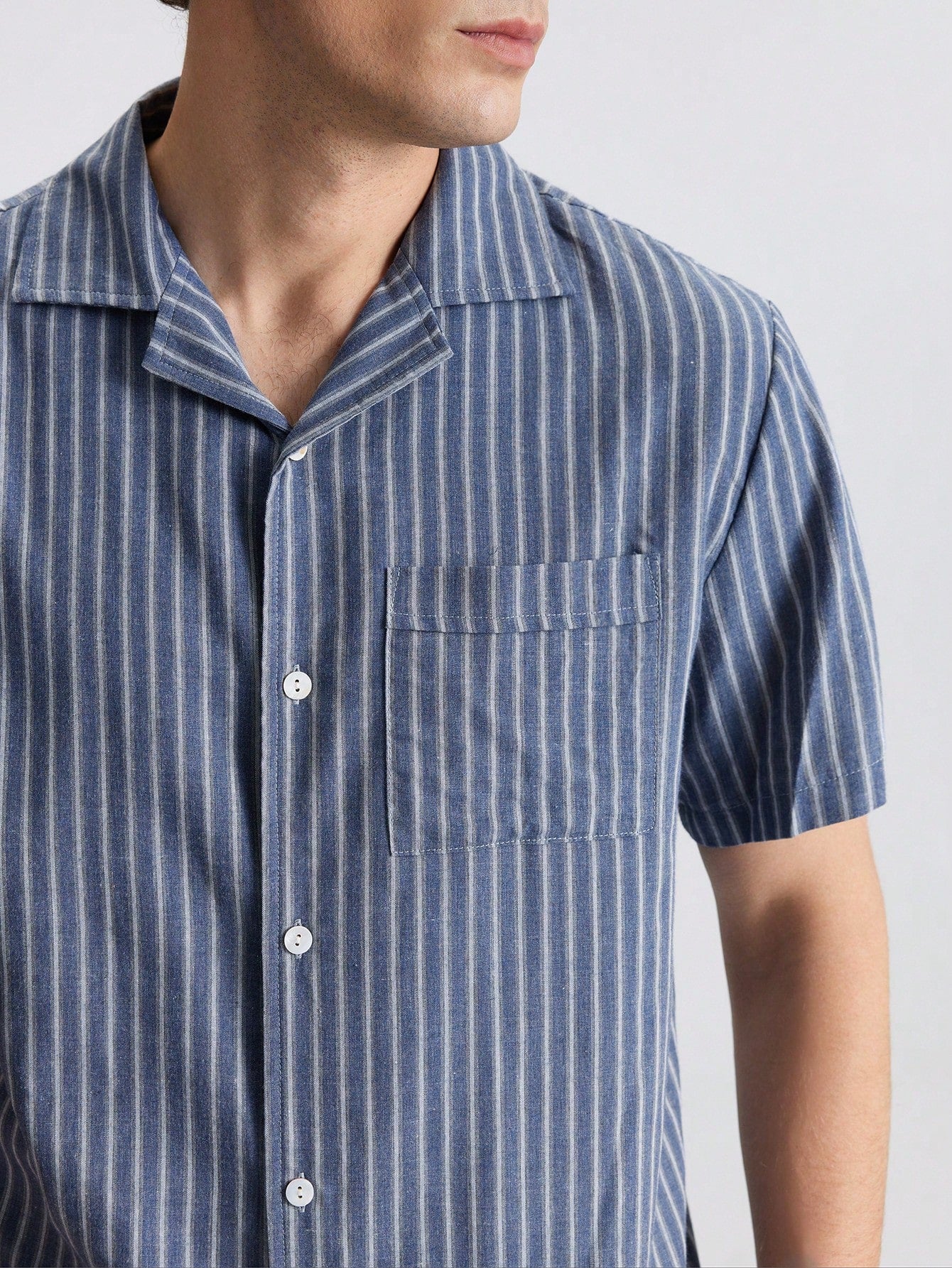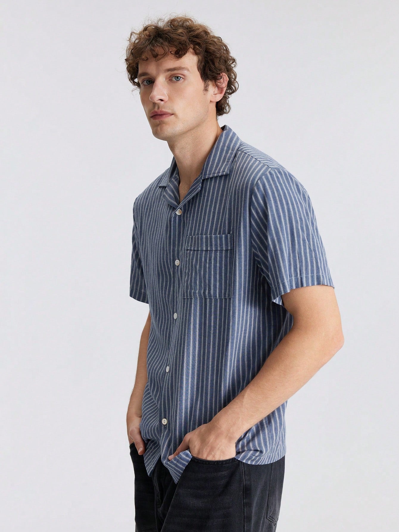 Ontre Men's Front Button Short Sleeve Pocket Striped Linen Simple Casual Shirt Outing Clothes, New Styles