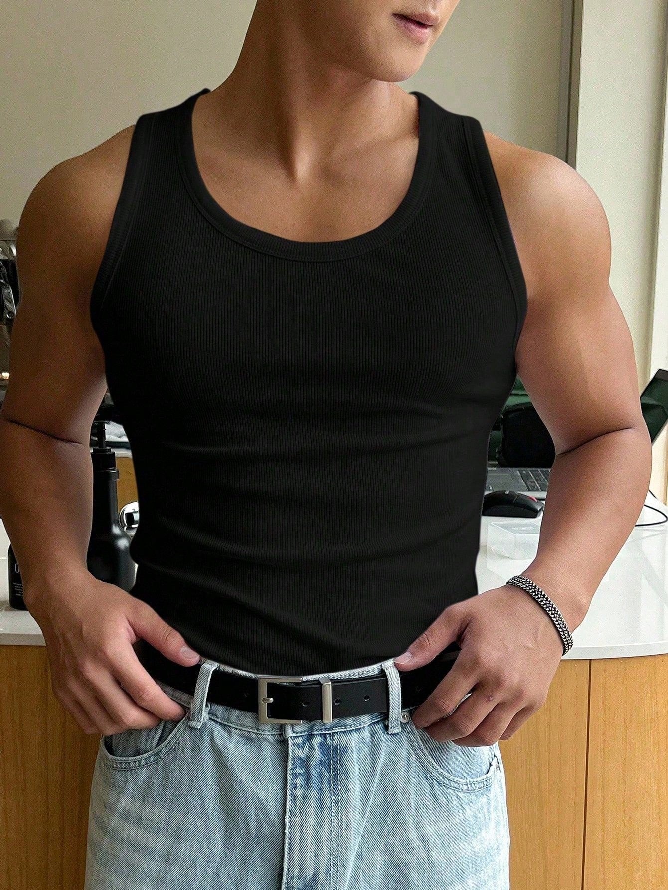تيشيرت رجالي بدون أكمام من DAZY، دافئ، بياقة دائرية مضلعة