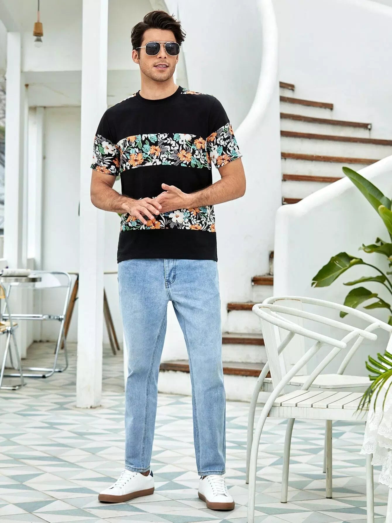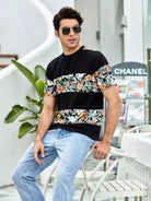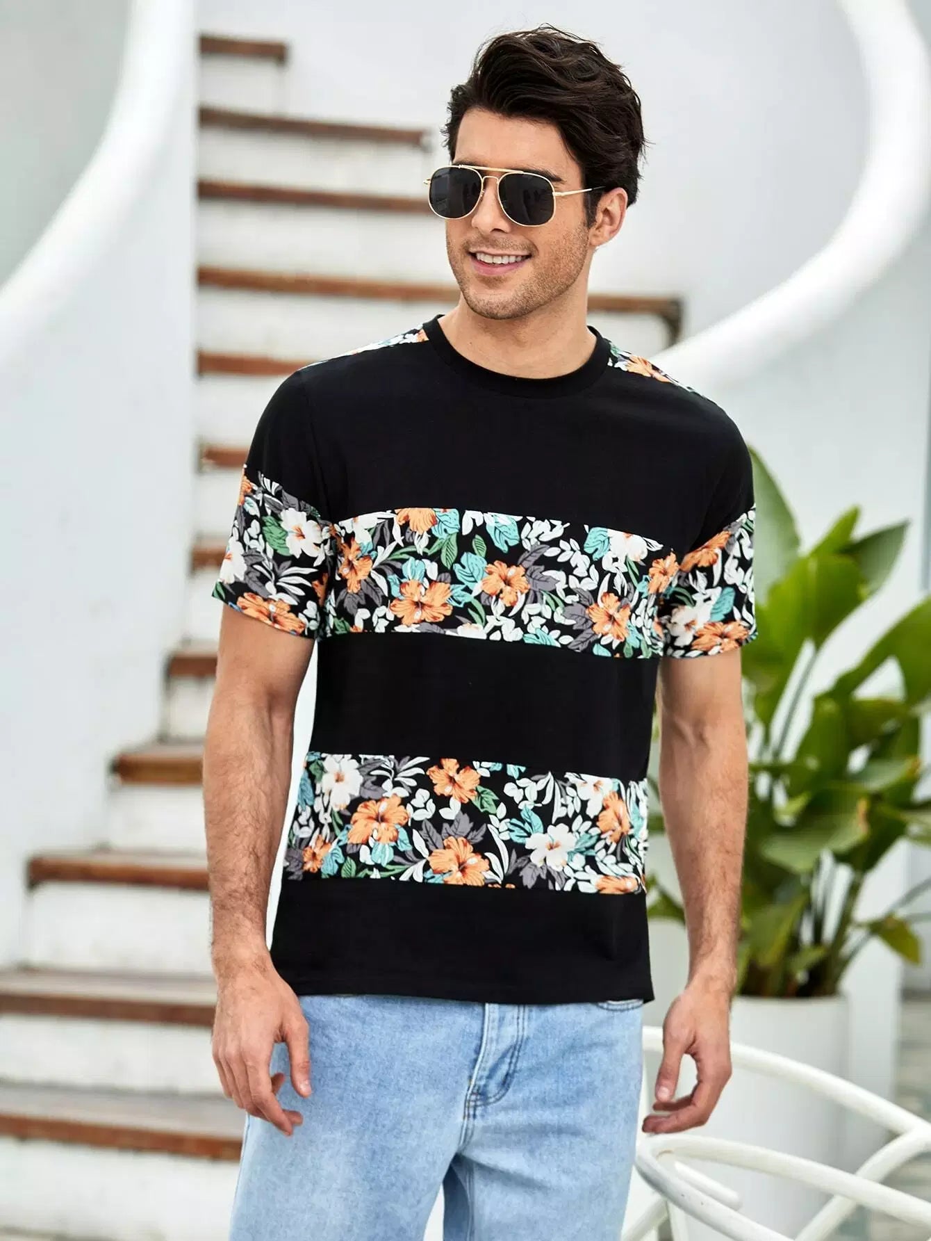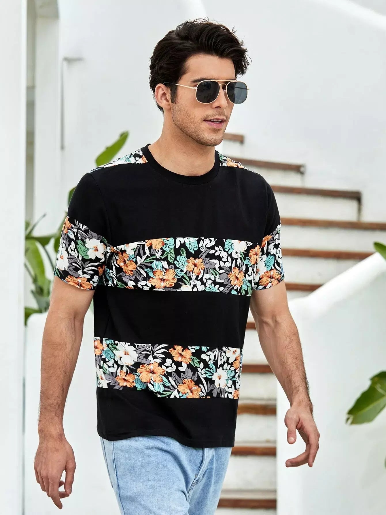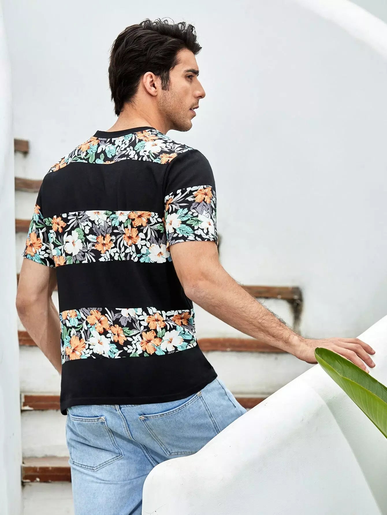 تي شيرت رجالي بأكمام قصيرة وطبعة زهور متباينة