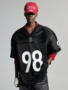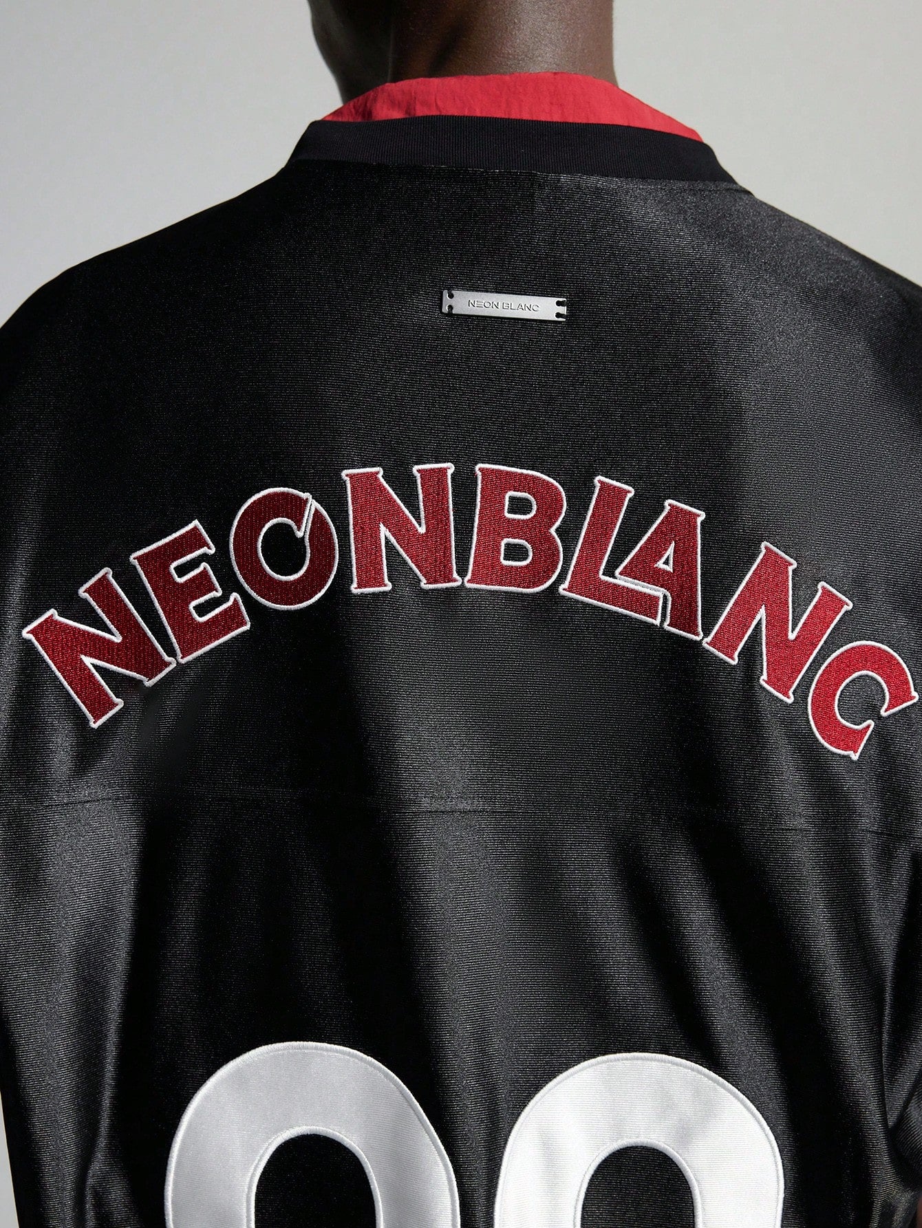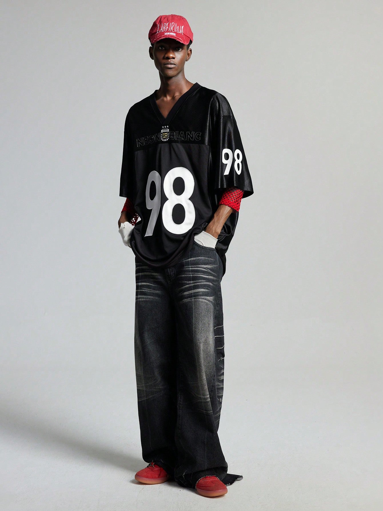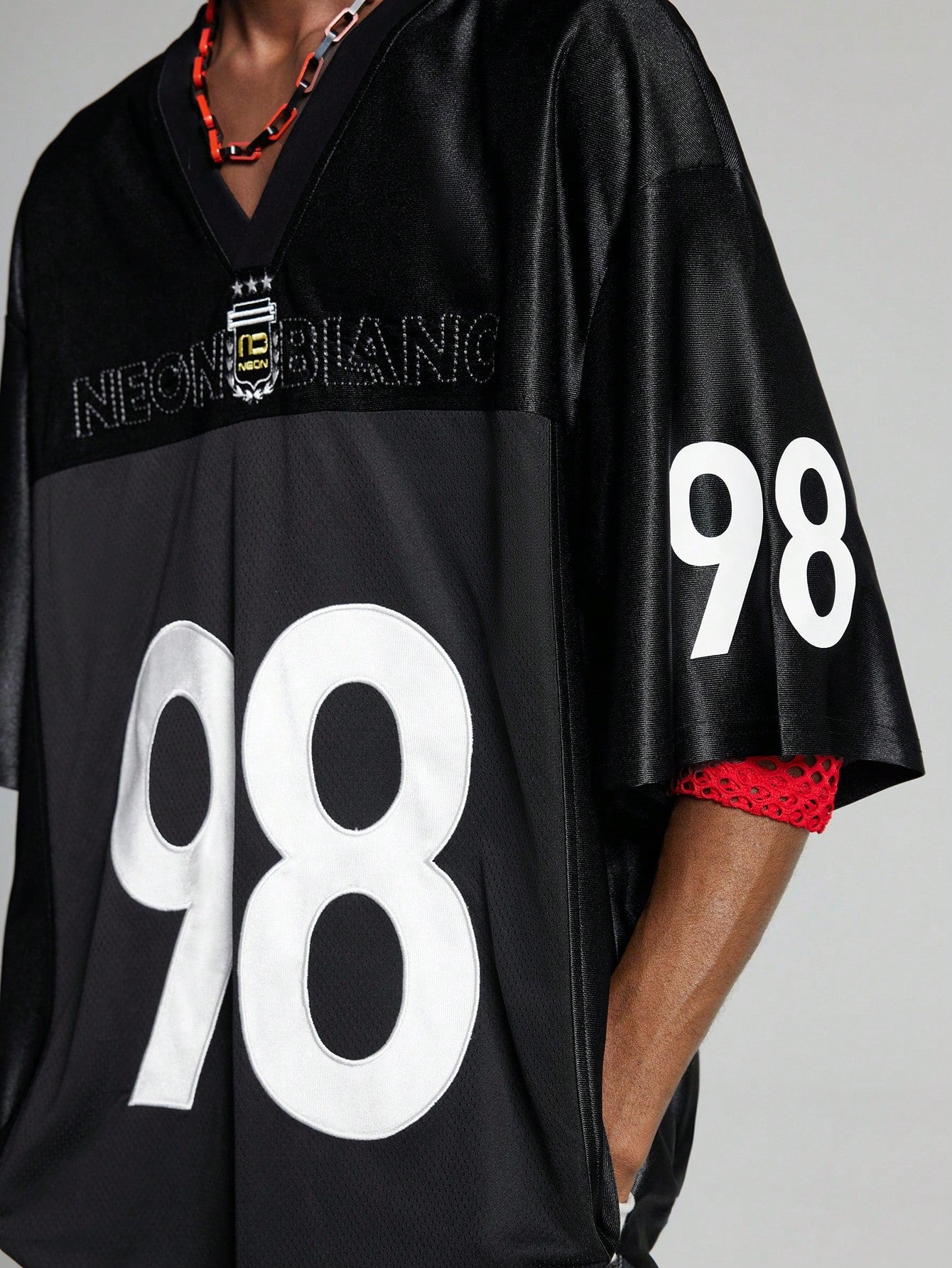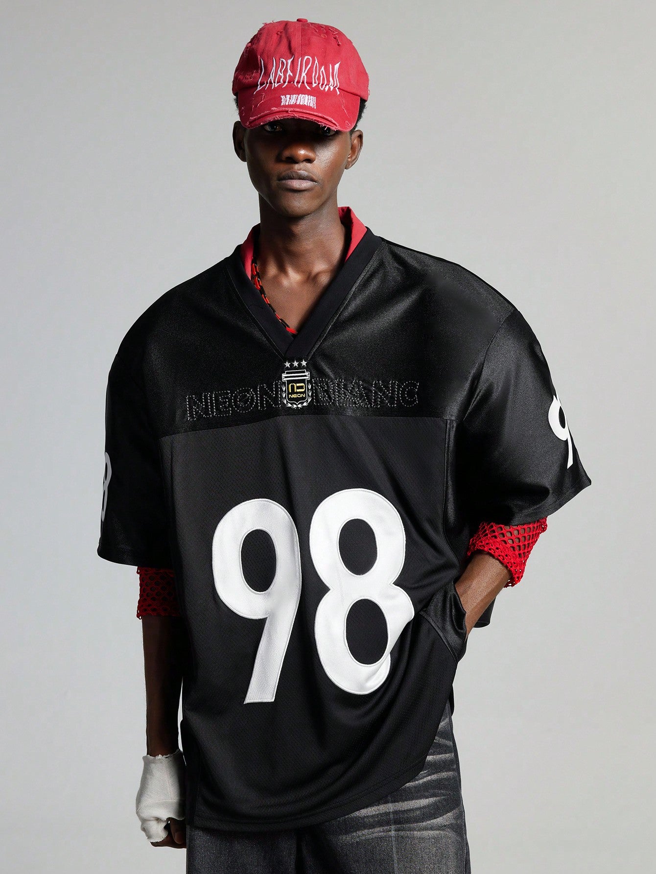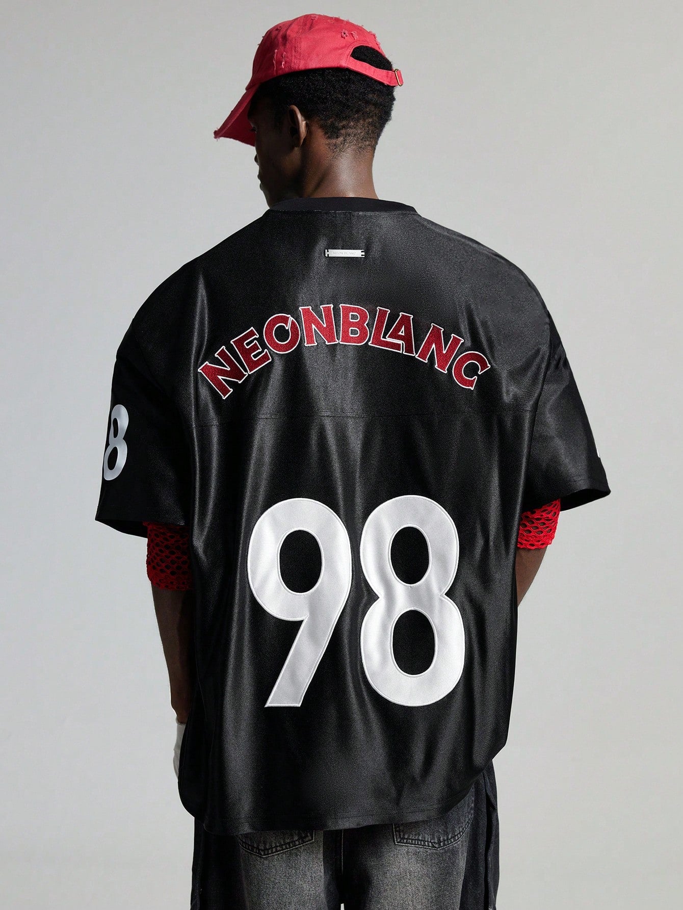 تي شيرت بيسبول رياضي رجالي من NEON BLANC، أسود اللون، مطبوع عليه أرقام، برقبة على شكل حرف V، ومطرز، ومحبوك