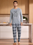 طقم ملابس نوم رجالي كاجوال مطبوع عليه دب بأكمام طويلة ورقبة دائرية وبنطلون قطعتين