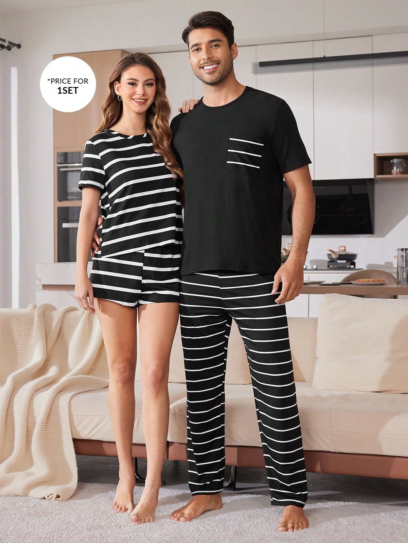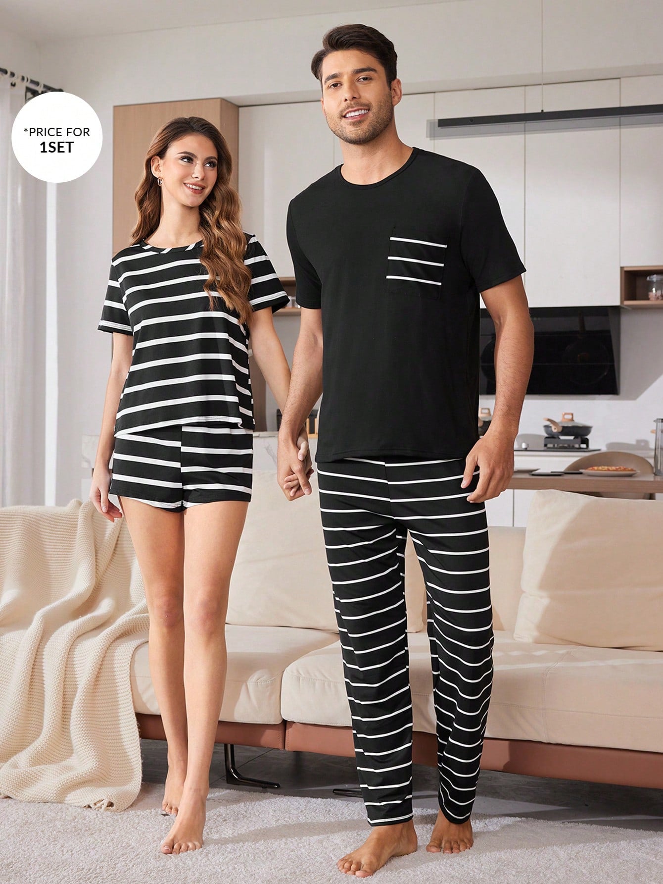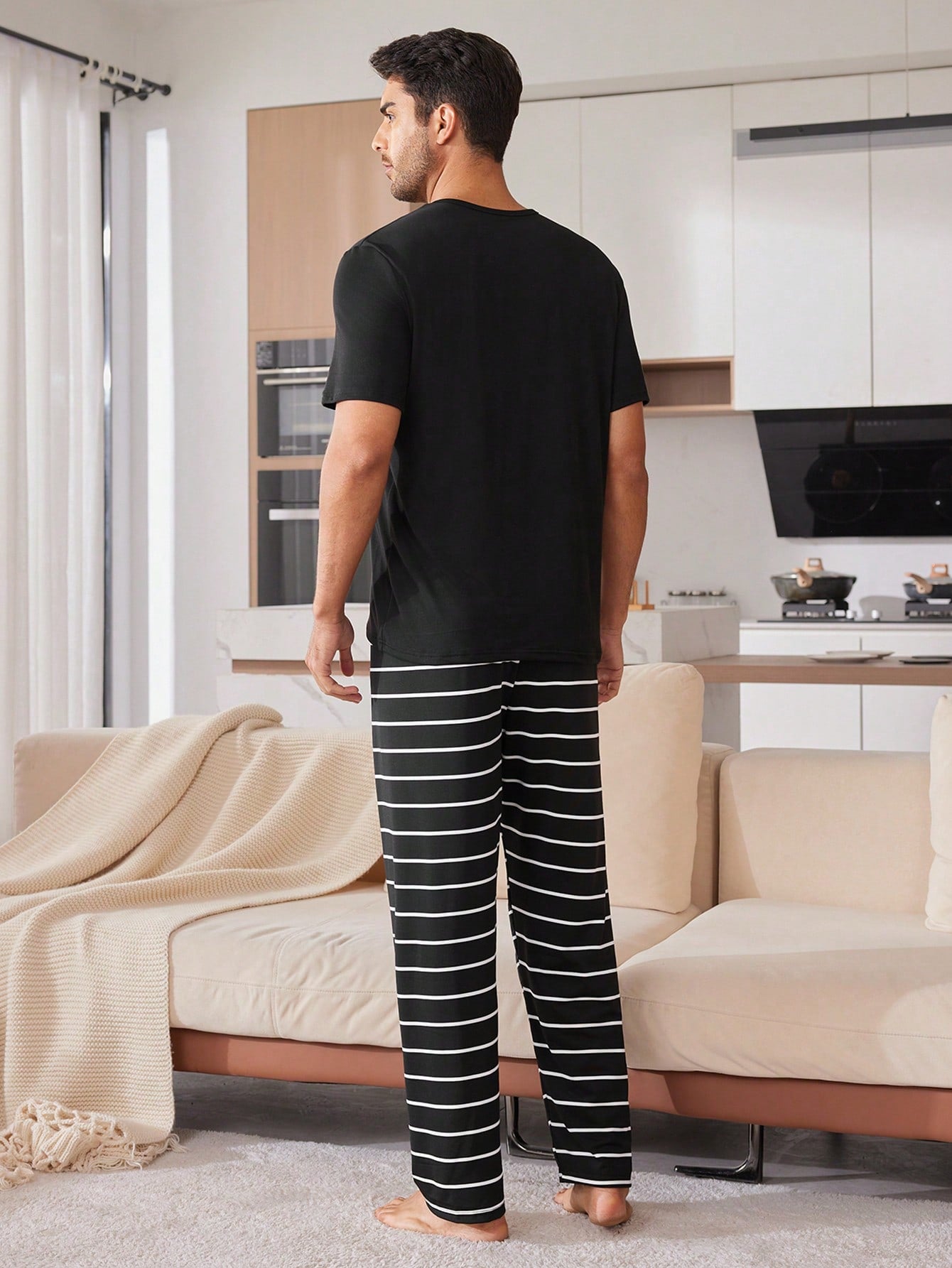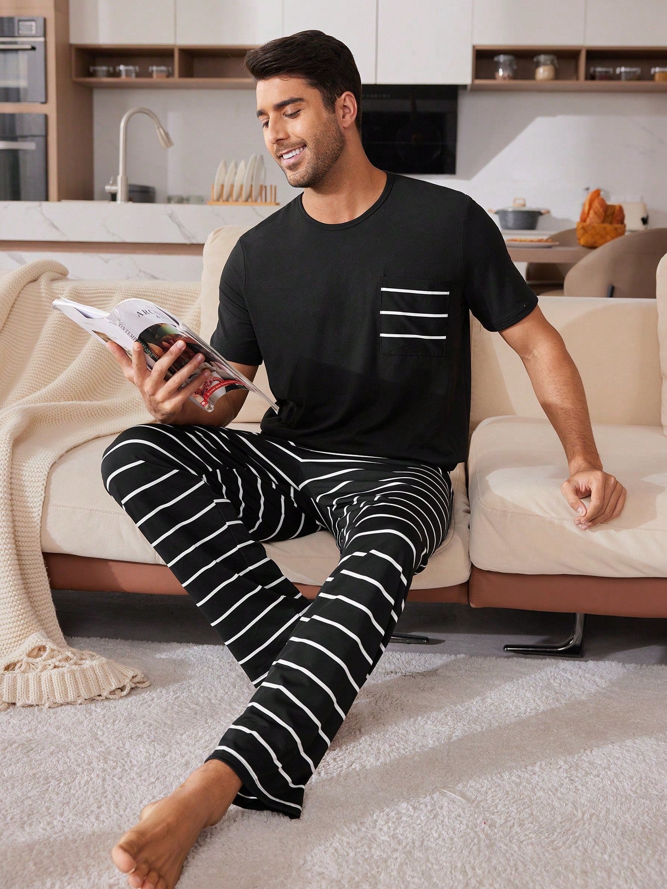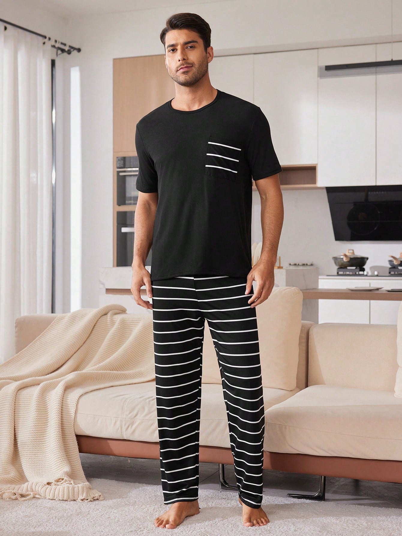 men Manfinity CoupledUp Men's Knitted Black Pocket Shirt And Striped Pants Loungewear Set