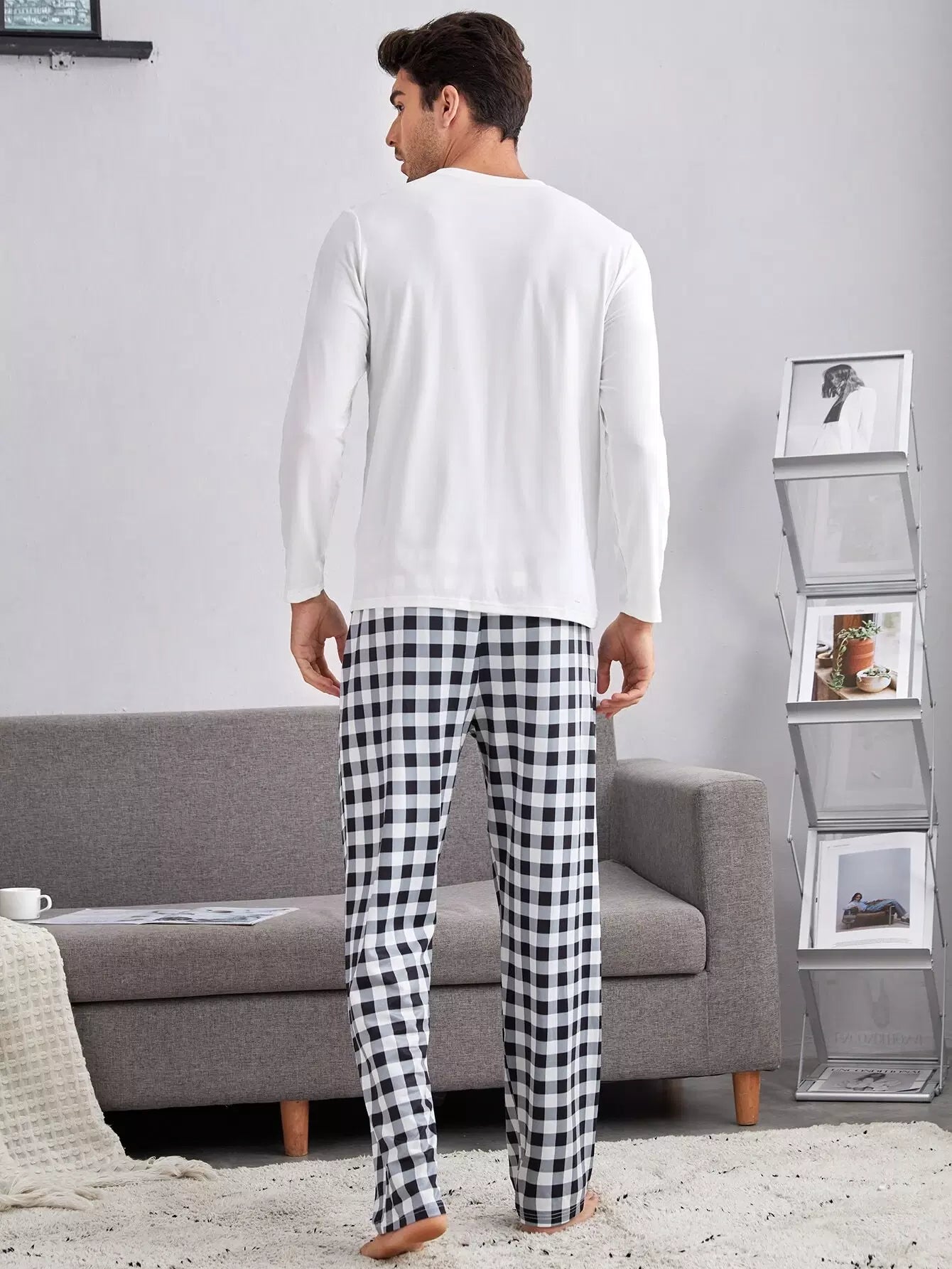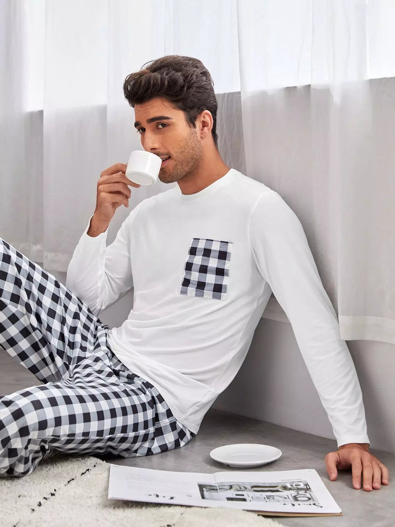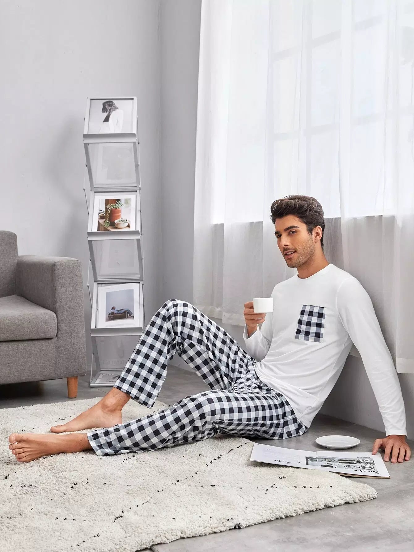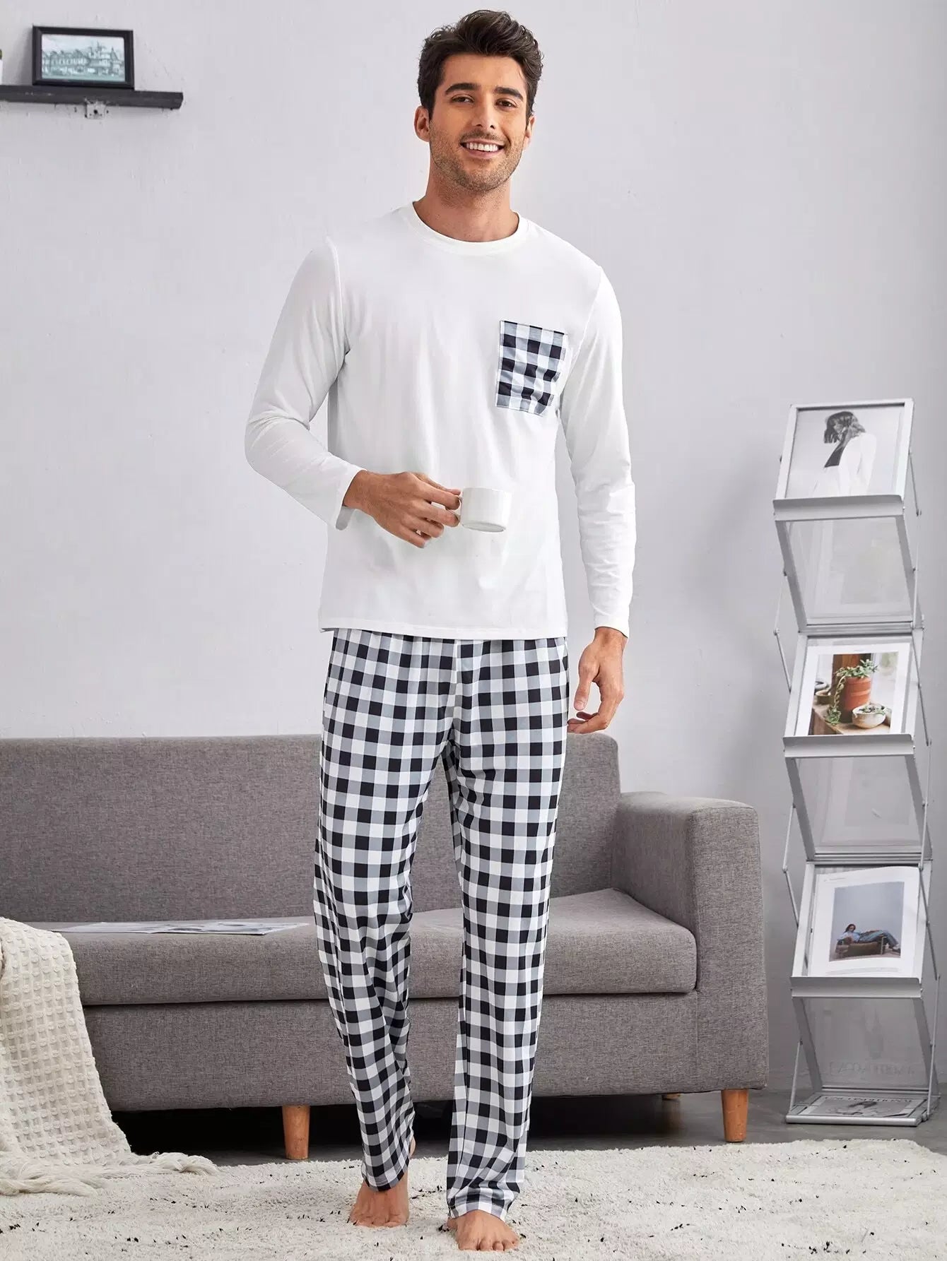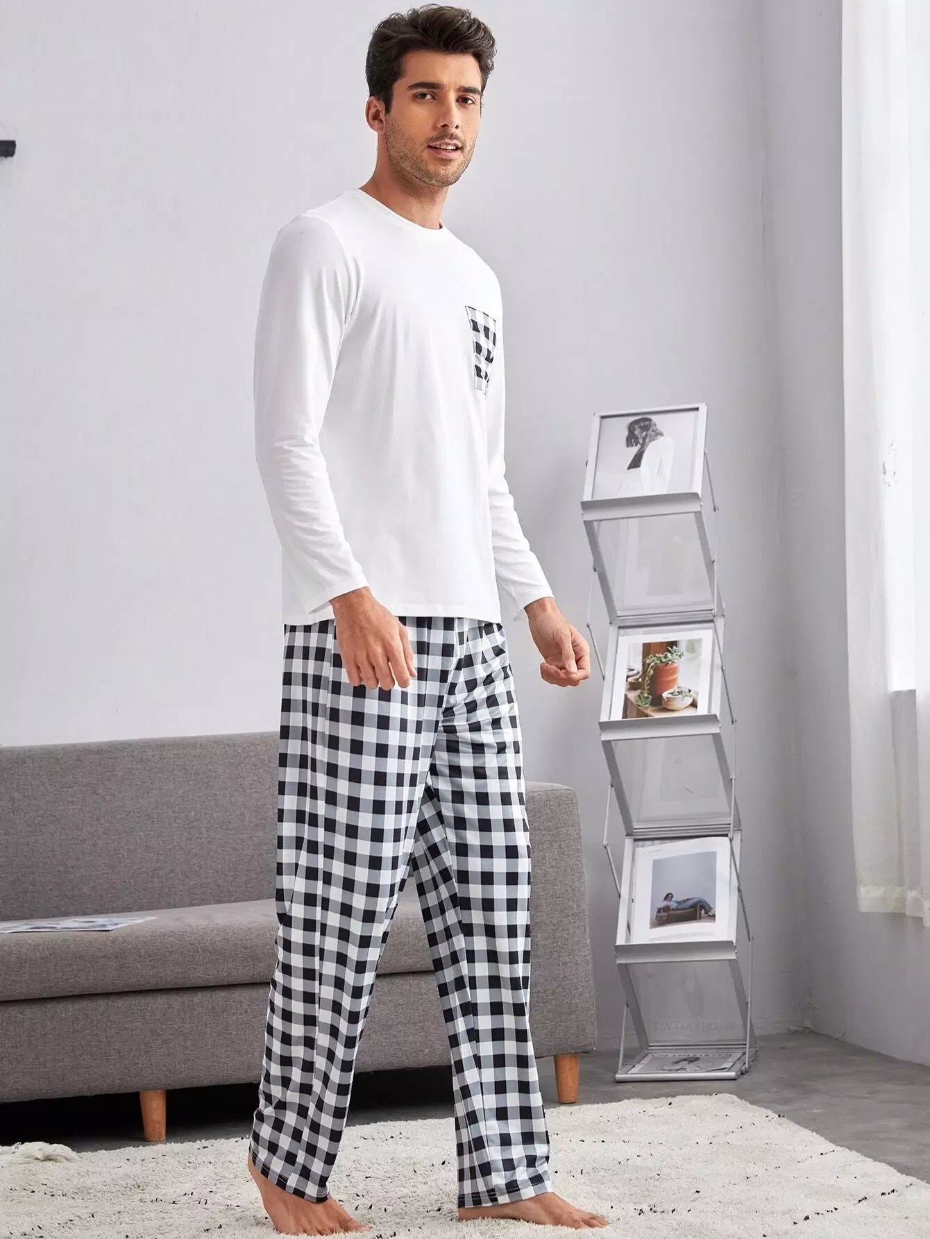 طقم بيجامة رجالي بطبعة مربعات وقميص برقعة جيب وبنطلون