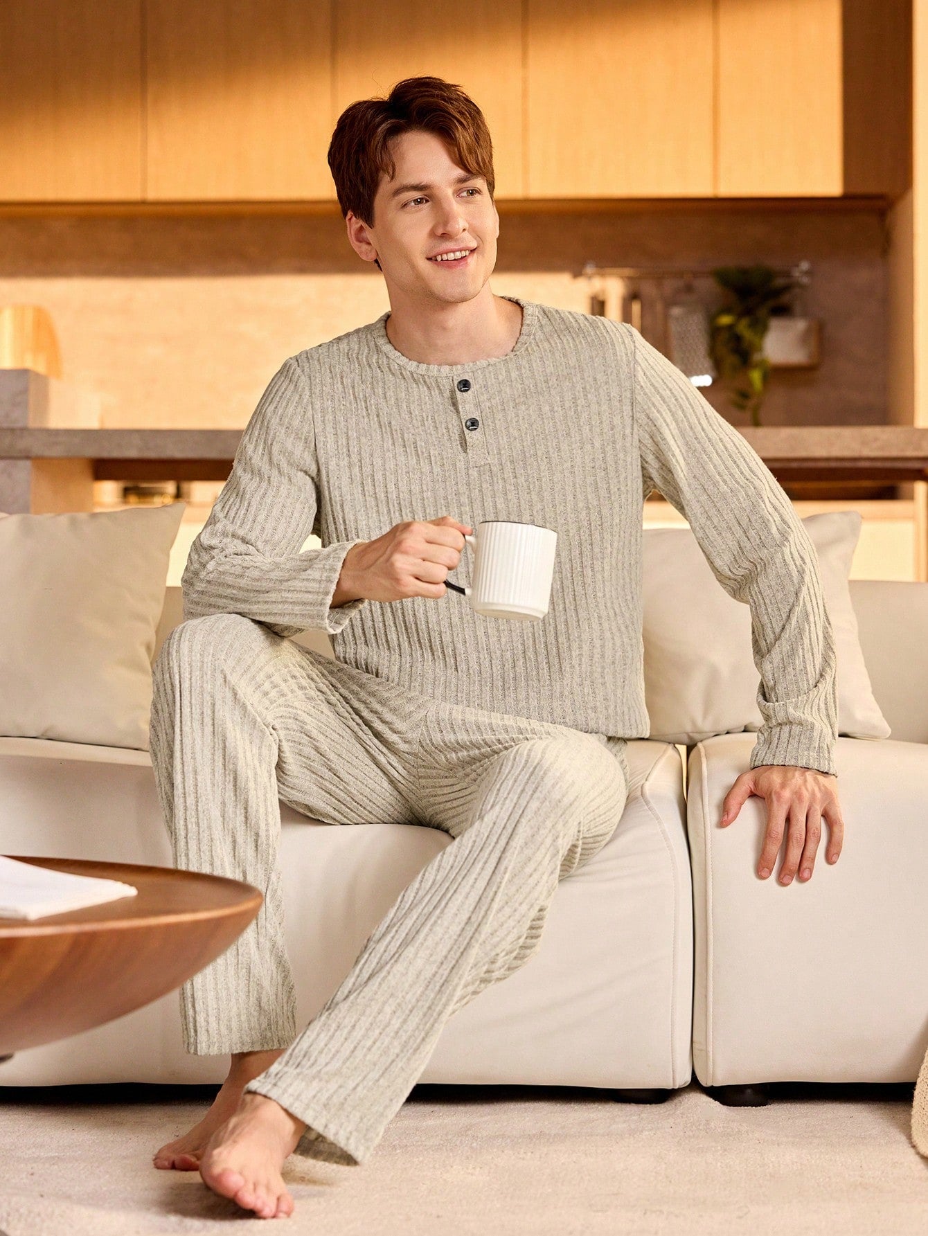 Manfinity Underwear&Sleepwear Basics Men's Autumn Comfortable Simple Rib Knit Long Sleeve Top And Pants