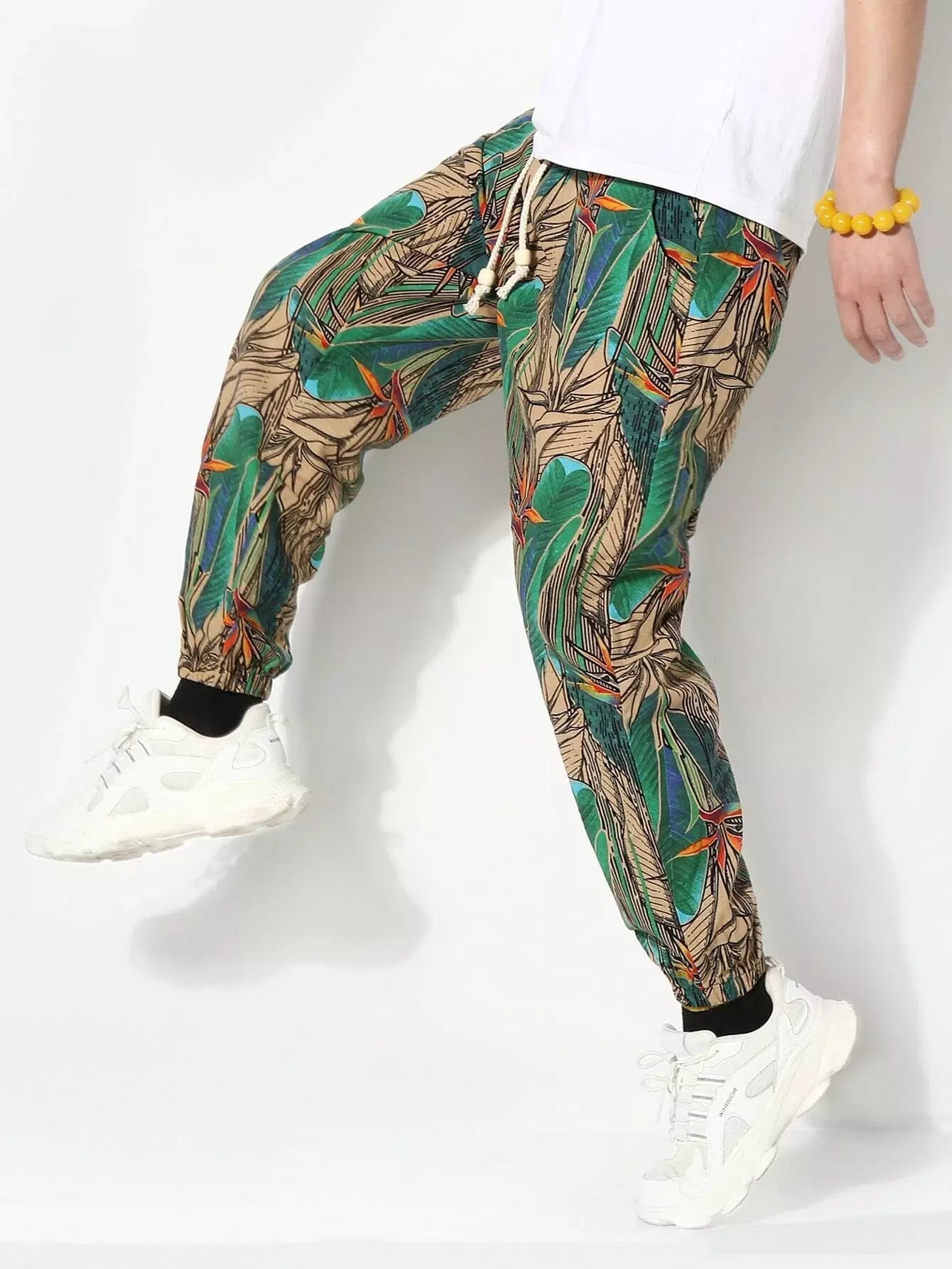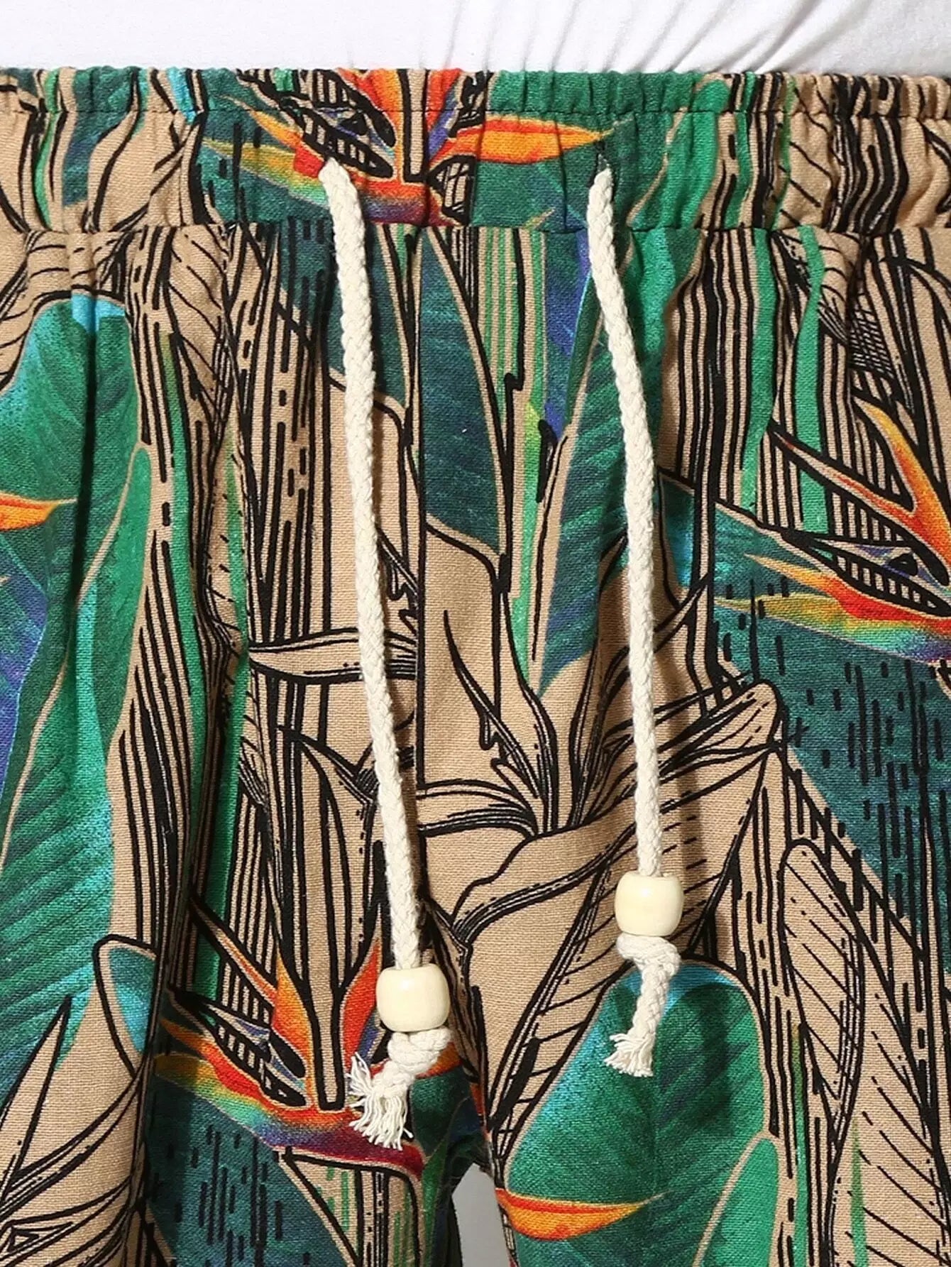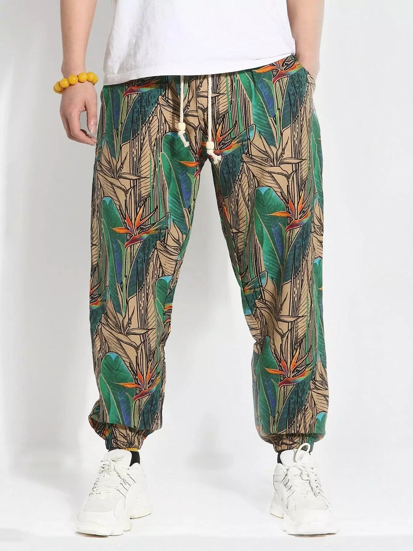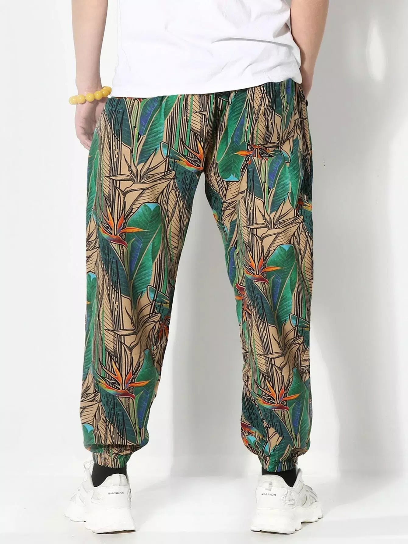بنطلون رجالي بطبعة استوائية برباط خصر ضيق للرجال