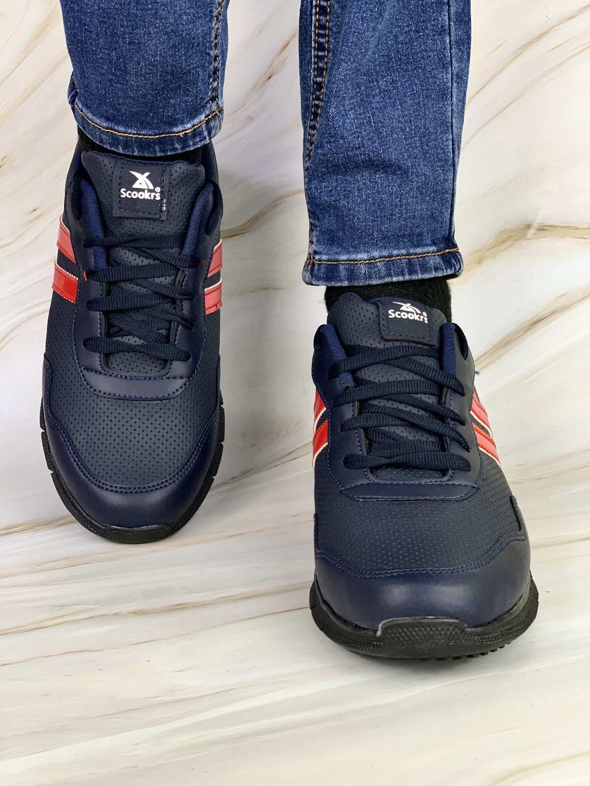 حذاء رياضي رجالي، كحلي وأحمر، بنعل أسود