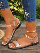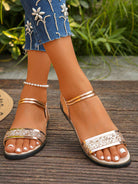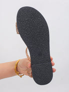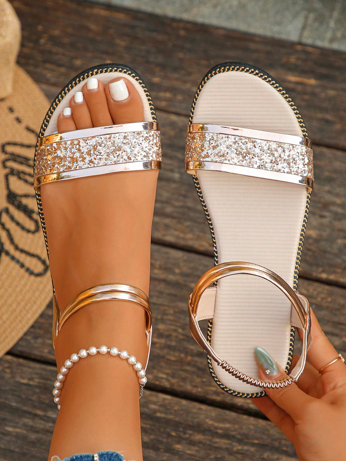 زوج واحد من الصنادل الصيفية المسطحة اللامعة سهلة الارتداء ذات المقدمة المفتوحة، مريحة وعملية ومتعددة الاستخدامات، مناسبة للمراهقين