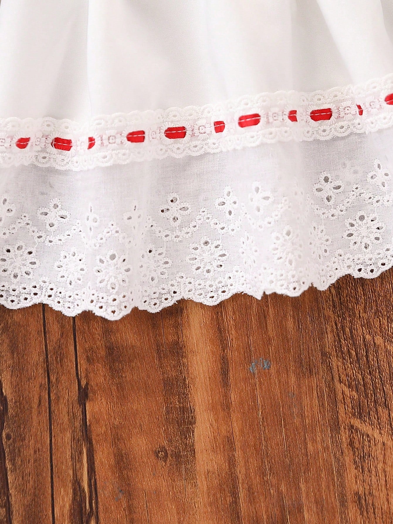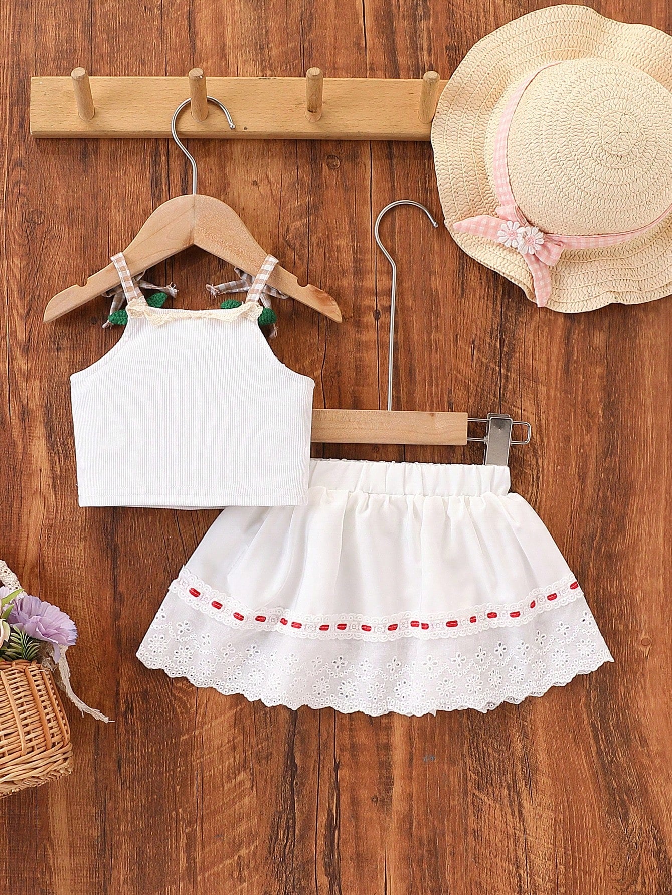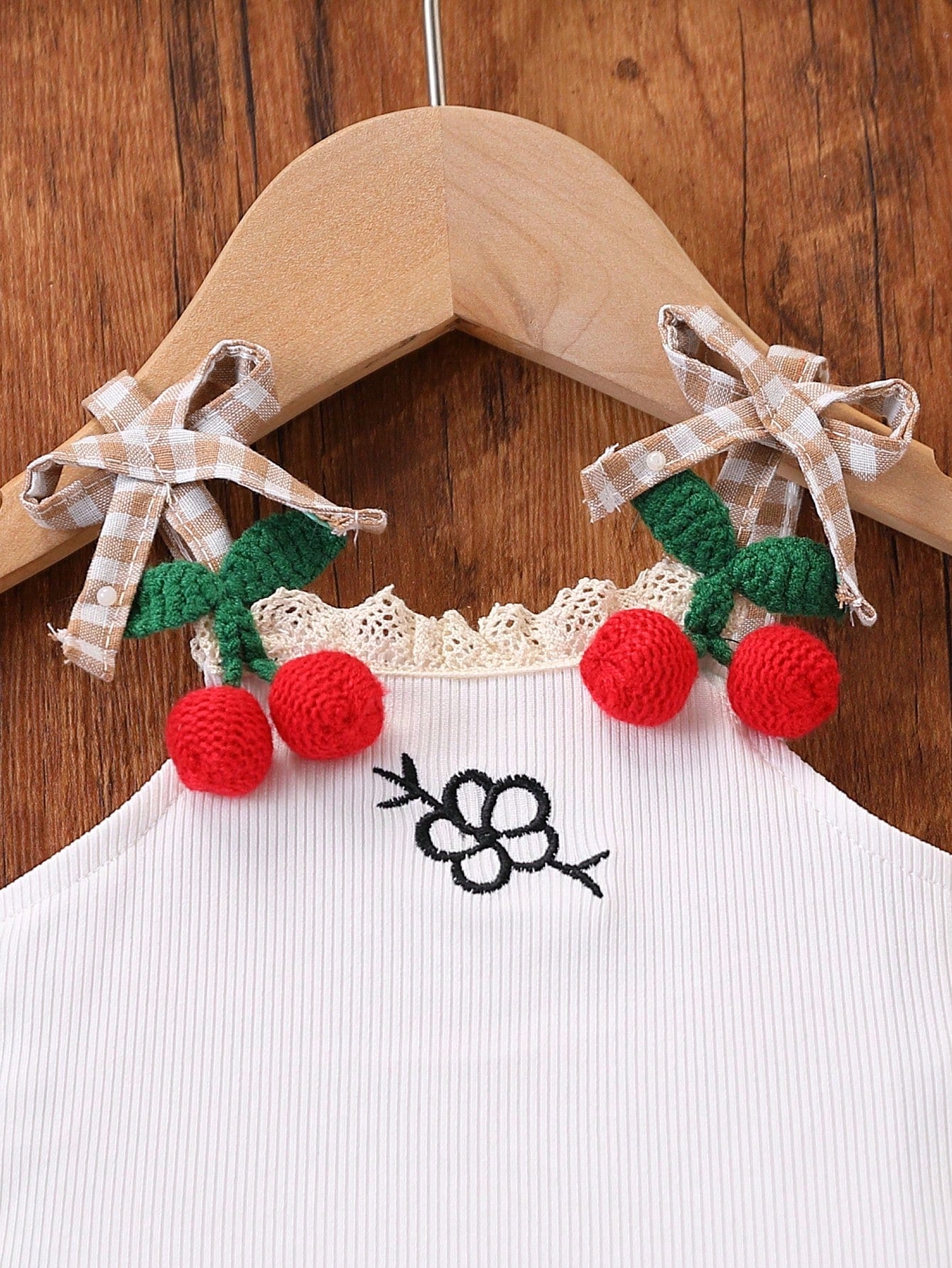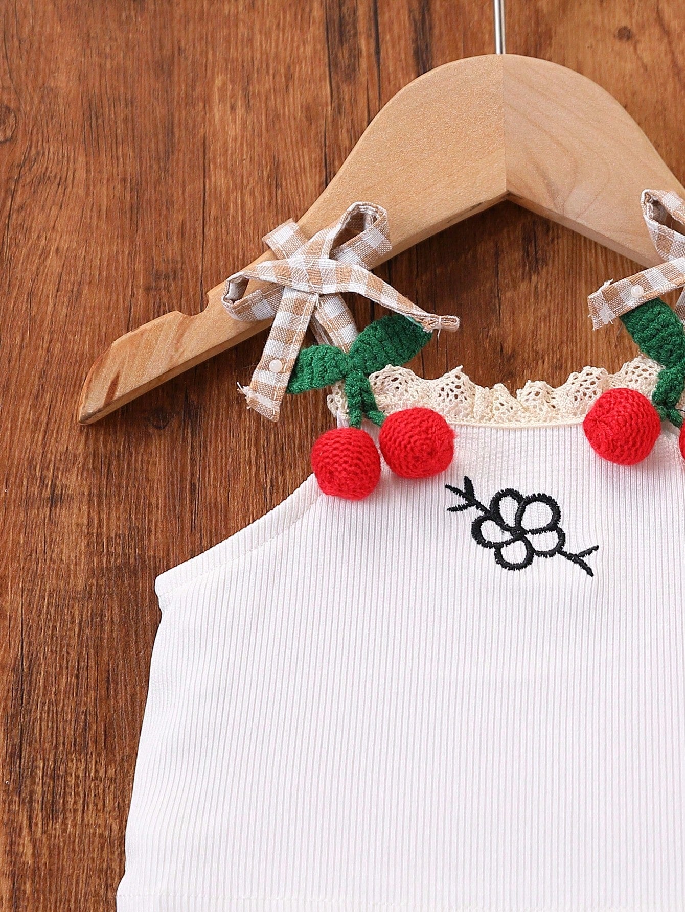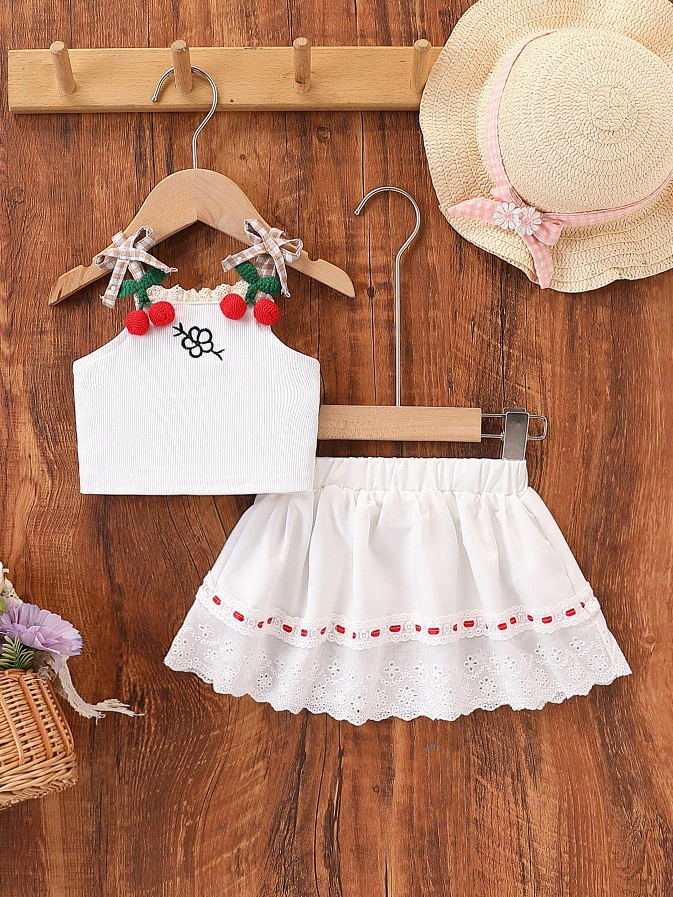 2pcs/Set Baby Girl Spring&Summer Cure,Casual Style Cherry Decoration Sleevelese Slip Top&Lace Decoration