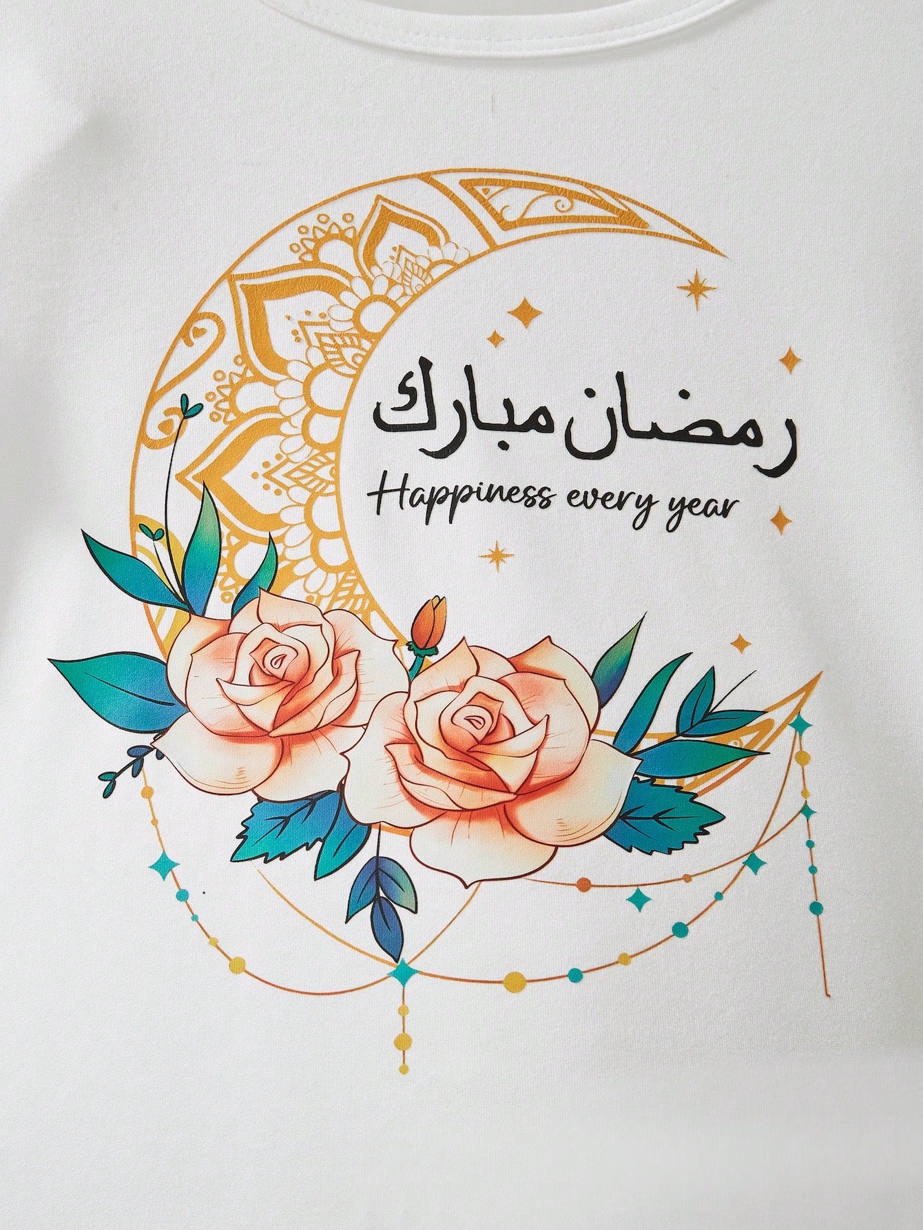 طقم مكون من قطعتين من توب بأكمام قصيرة وحافة مكشكشة وطبعة هلال رمضان للفتيات المراهقات وطبعة سماء مرصعة بالنجوم