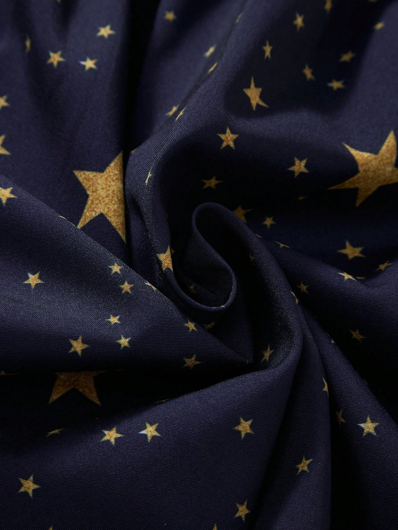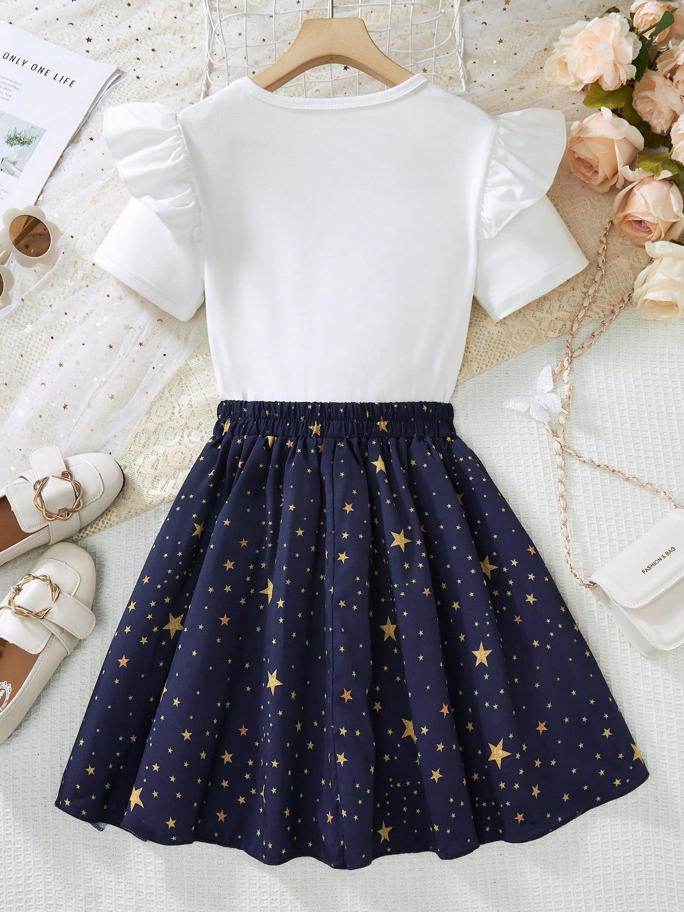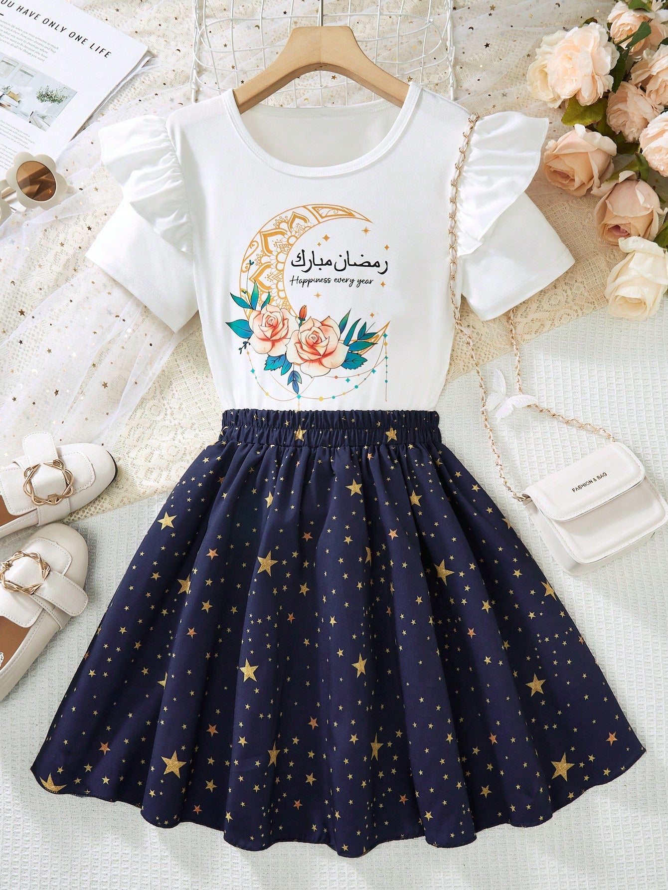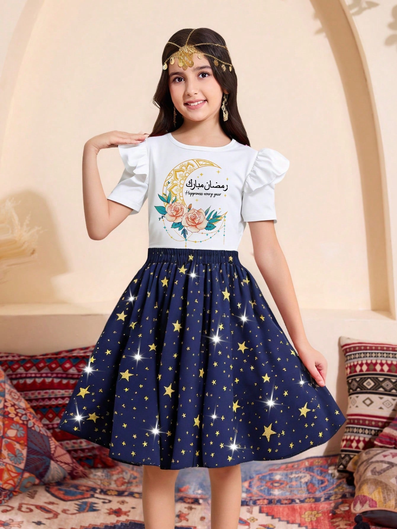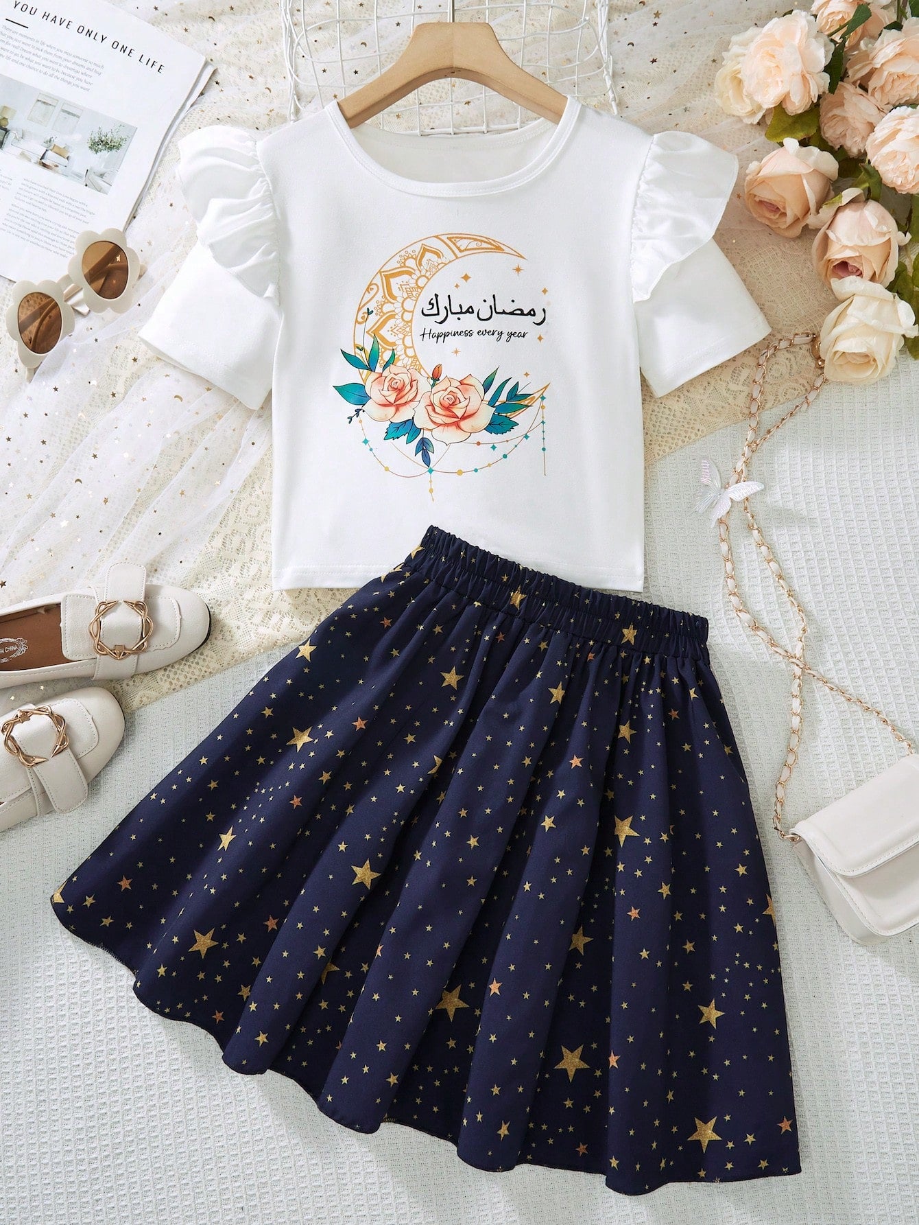 2pcs/Set Tween Girl Ramadan Crescent Moon Print Ruffle Trim Cap Sleeve Top And Starry Sky Print Mini