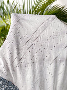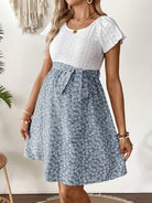 فستان حمل بوهيمي أزرق وأبيض مزين بنقوش زهور صغيرة، بياقة دائرية وأكمام قصيرة لإطلالة صيفية أنيقة