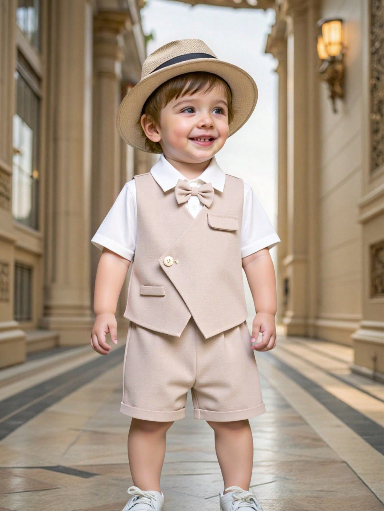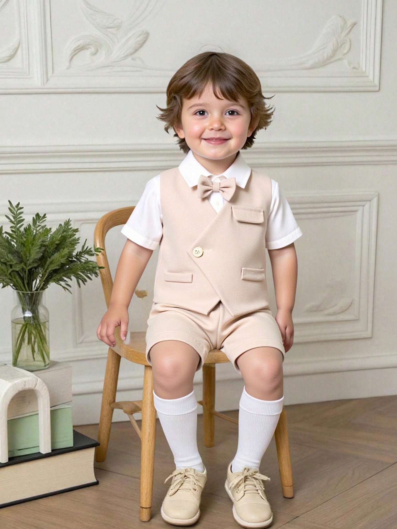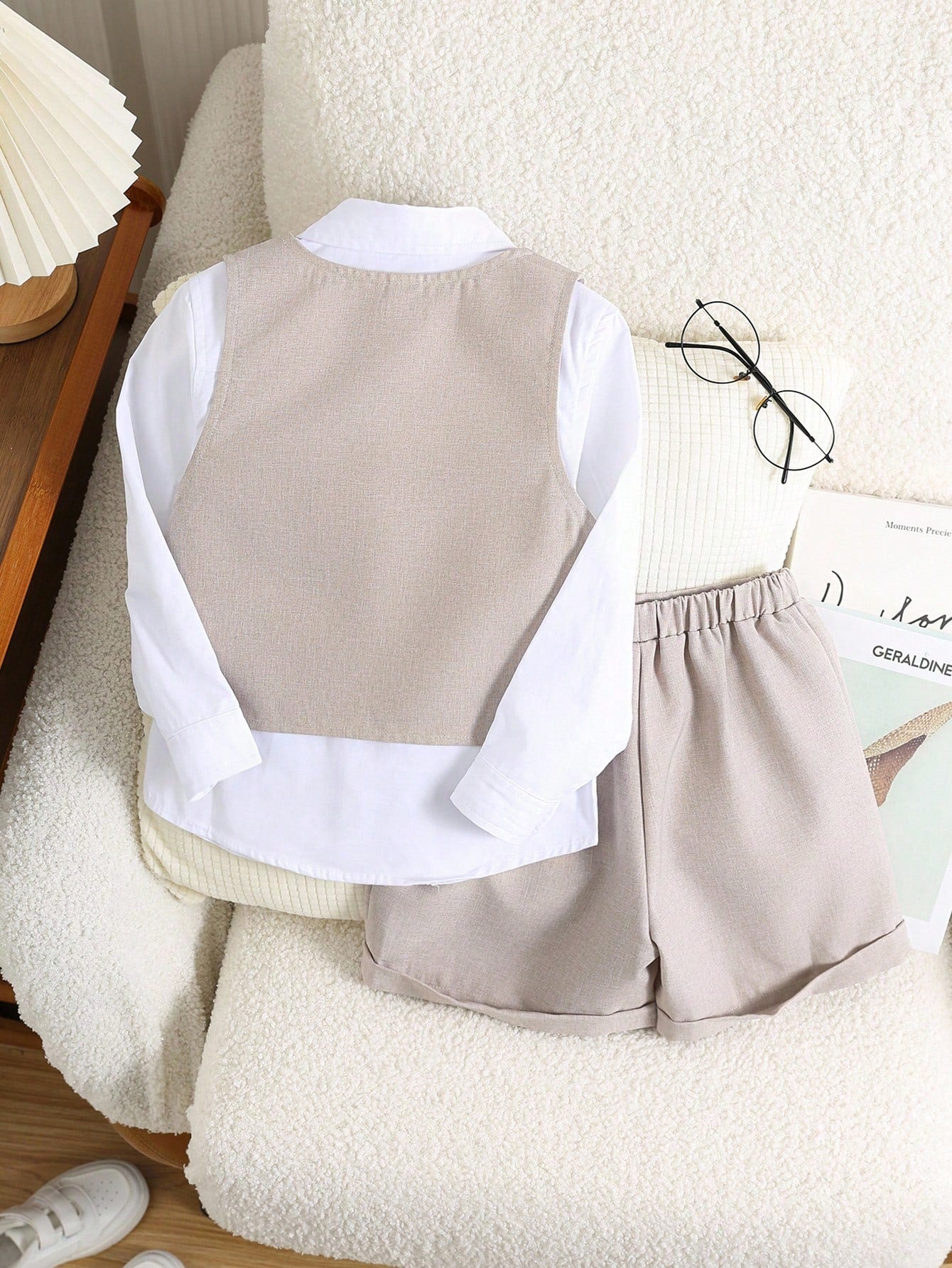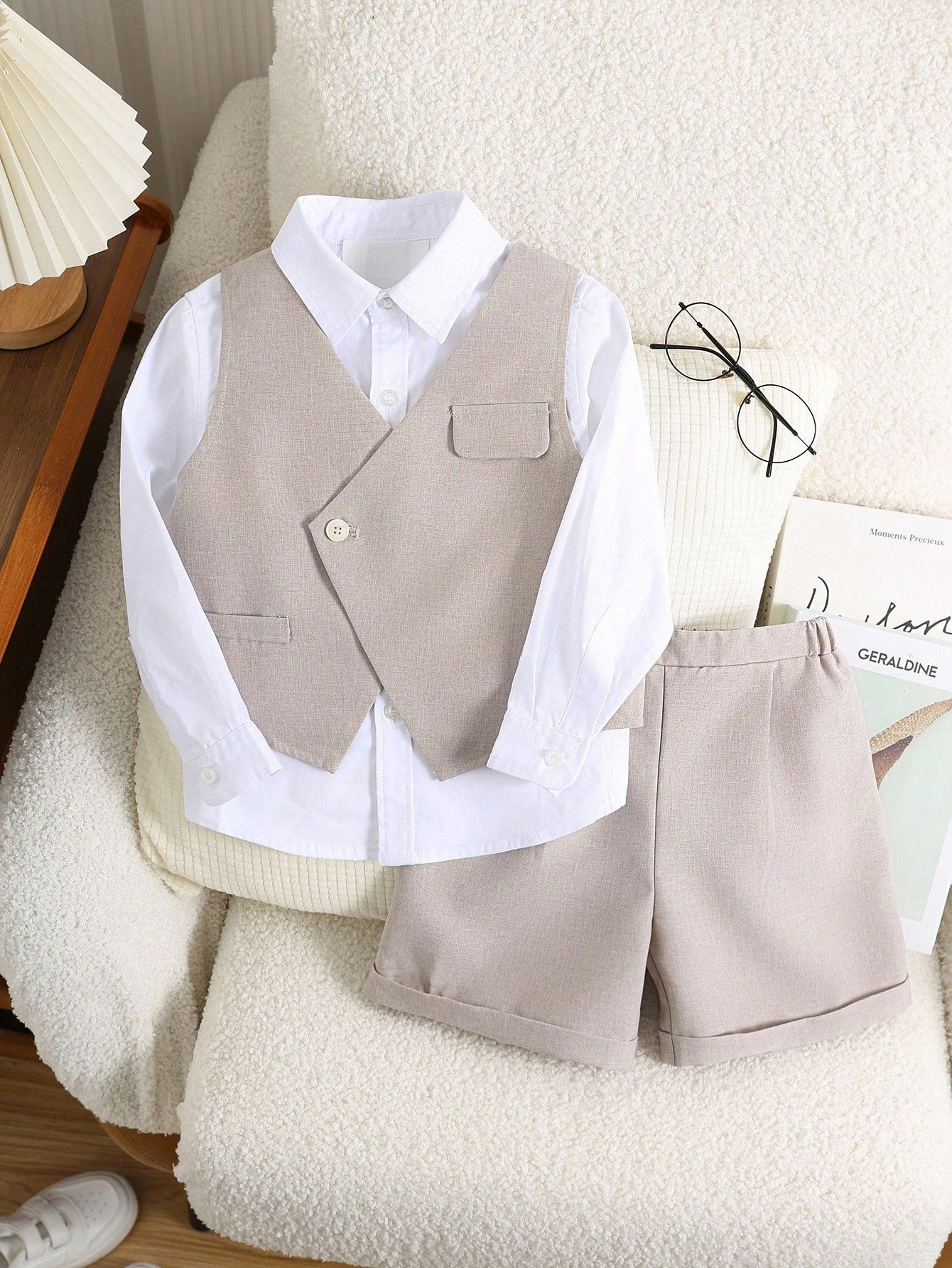 طقم ملابس كاجوال أنيق للأولاد الصغار، يتكون من سترة كاكي وشورت بخصر مطاطي