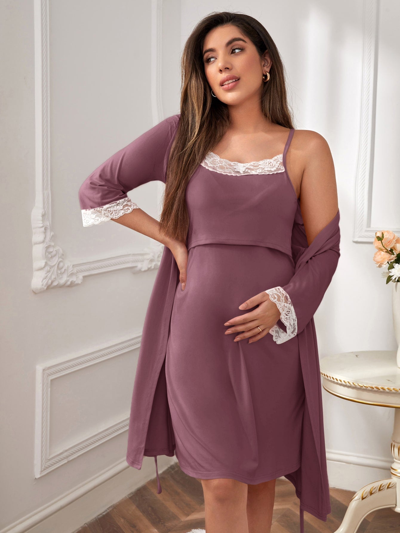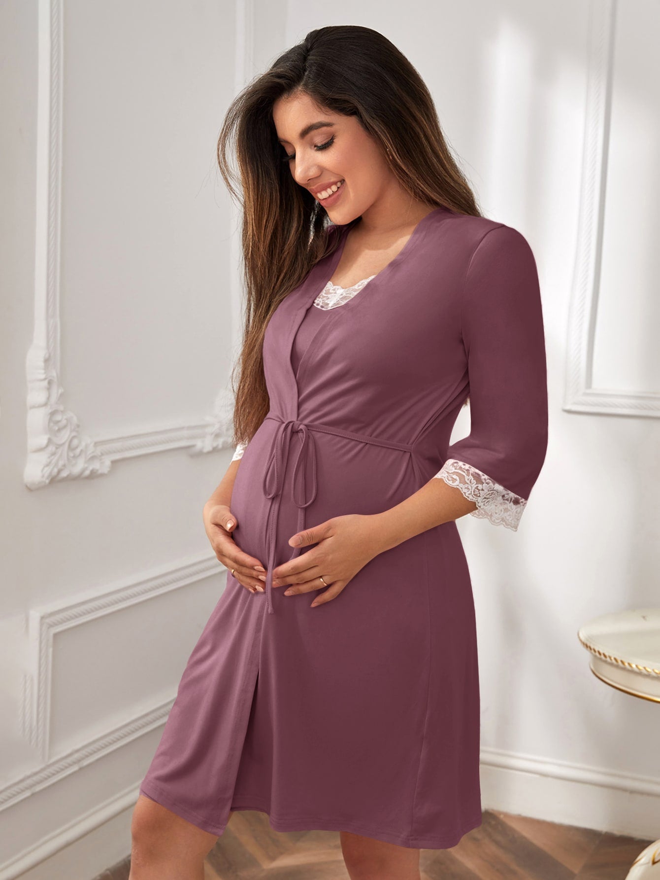روب حمل مزين بالدانتيل الزهري وفستان داخلي للأم