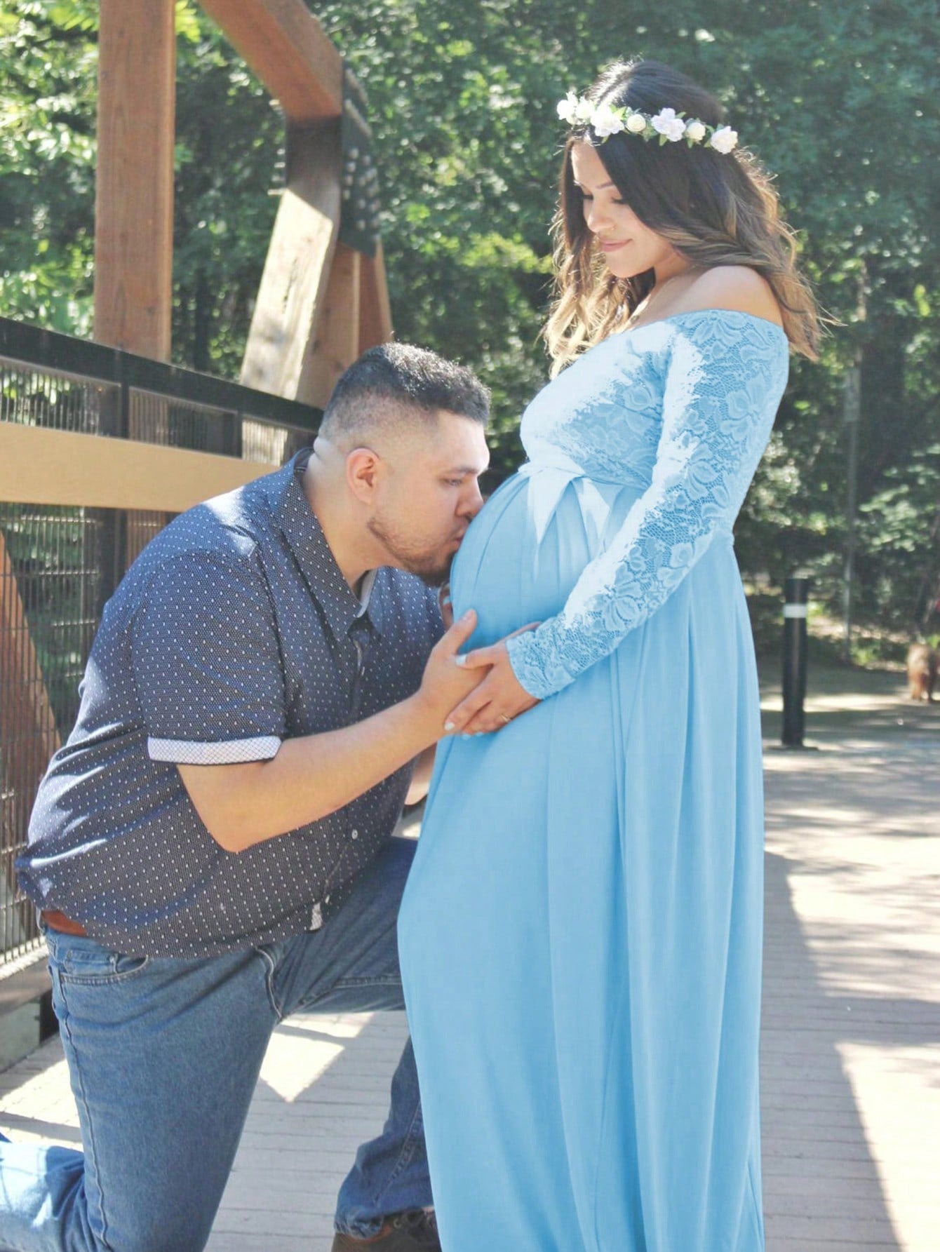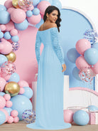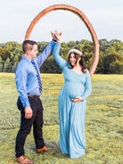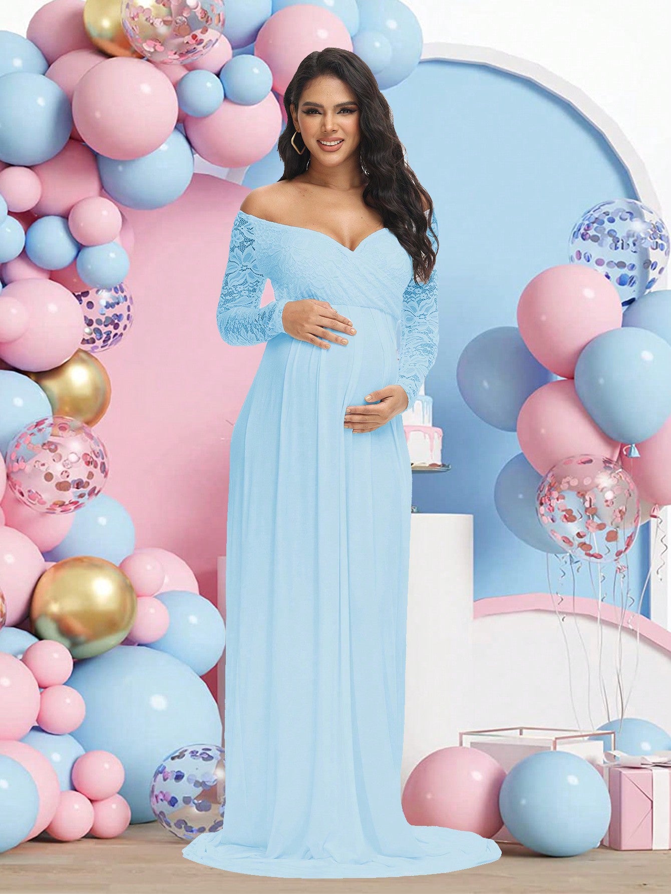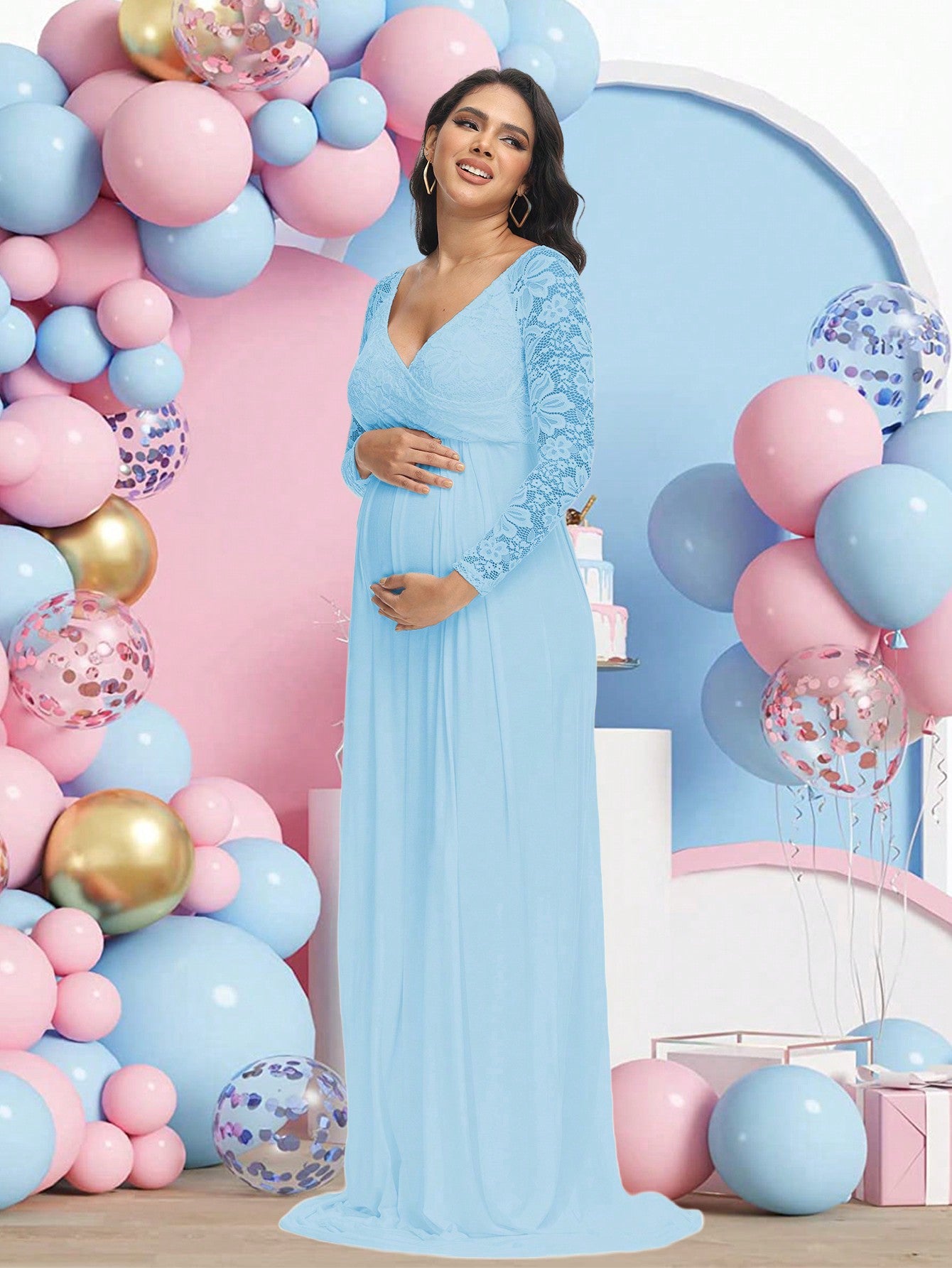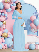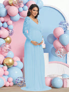 فستان حمل طويل بأكمام طويلة وفتحة رقبة على شكل حرف V من الدانتيل، مثالي لجلسات التصوير وحفلات استقبال المولود.
