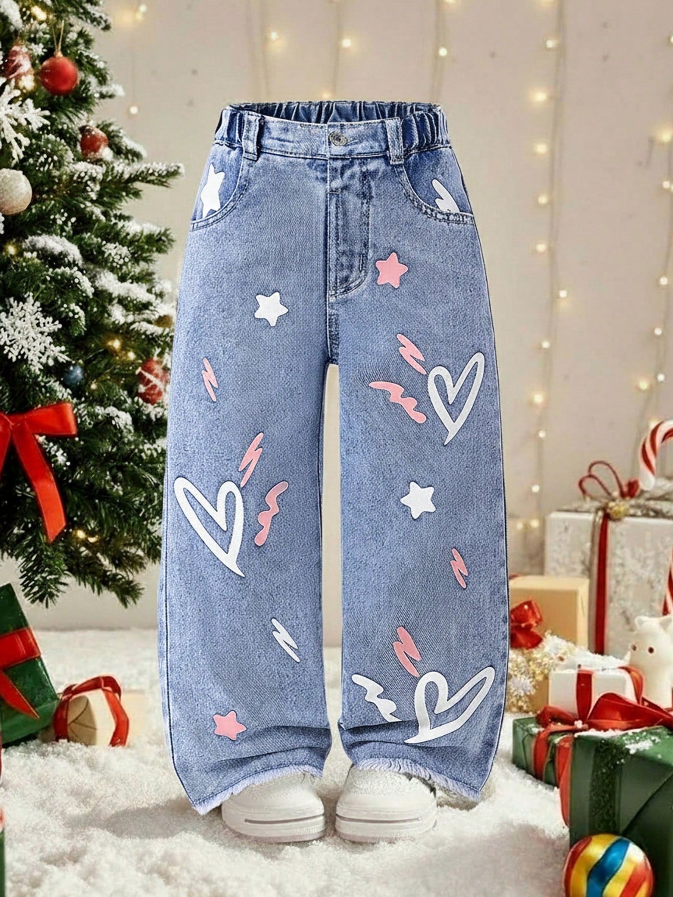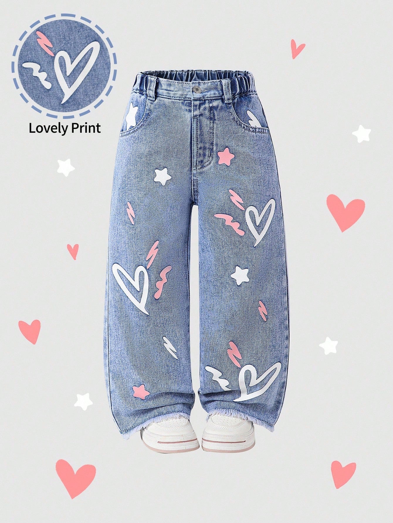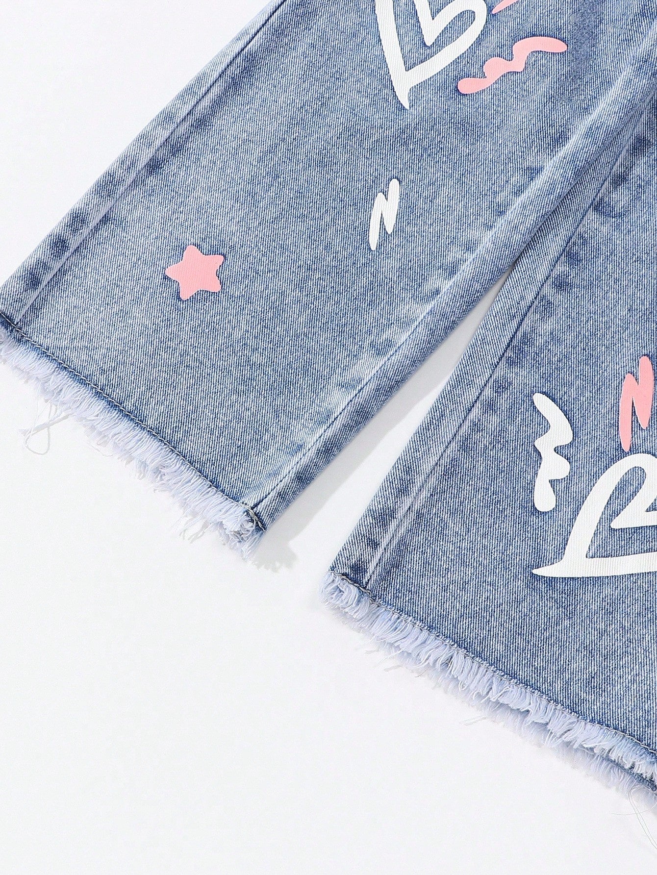 بنطلون جينز مستقيم الساق بنقشة قلوب ممزقة وحواف مهترئة للفتيات الصغيرات