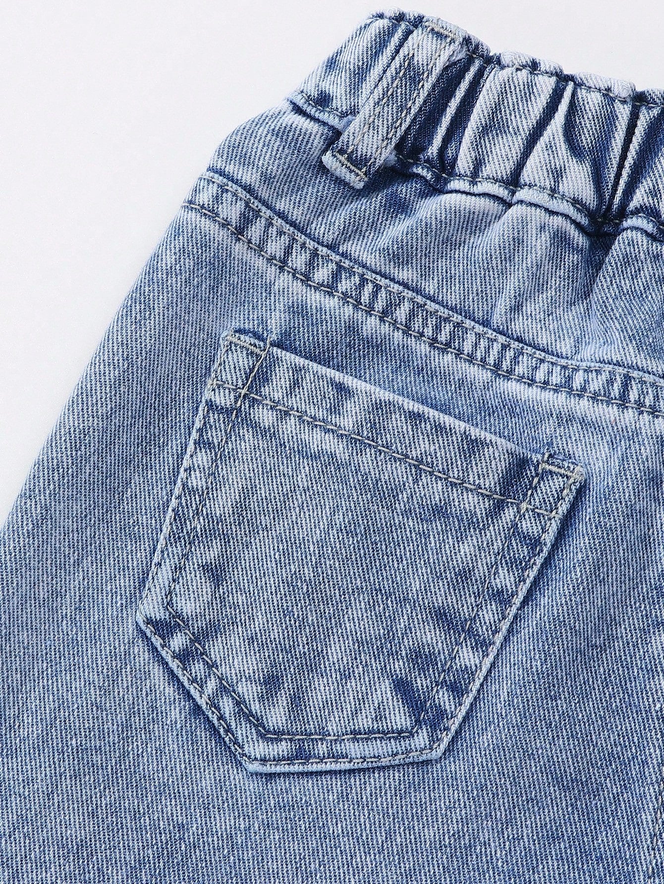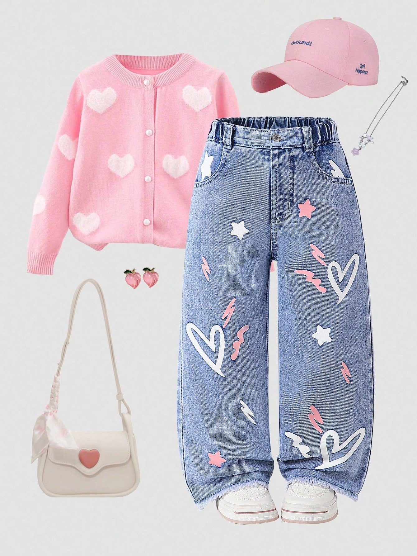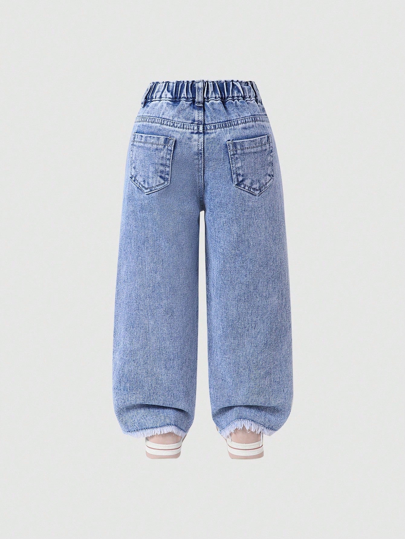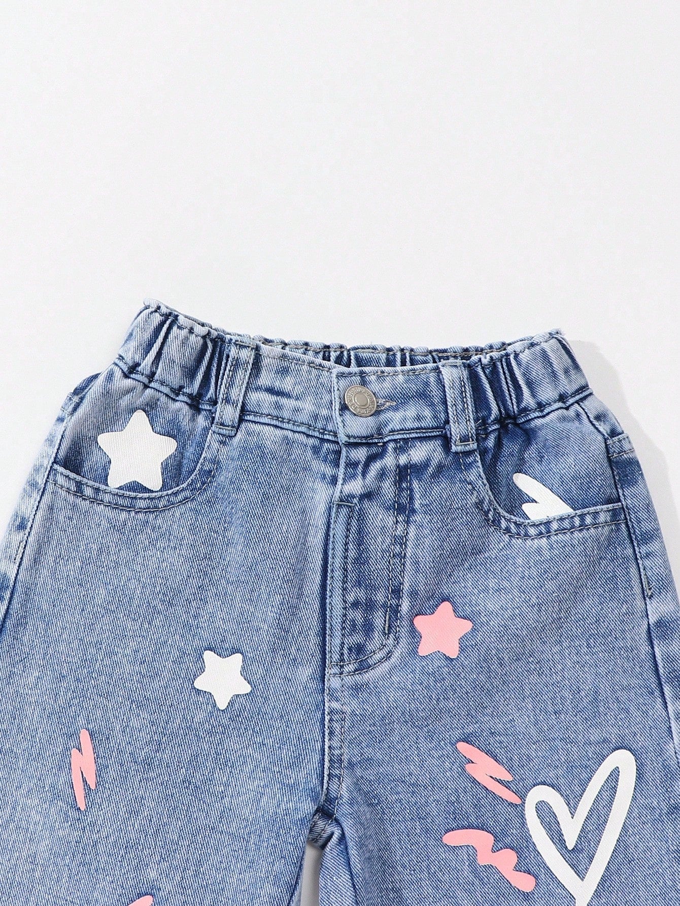 بنطلون جينز مستقيم الساق بنقشة قلوب ممزقة وحواف مهترئة للفتيات الصغيرات