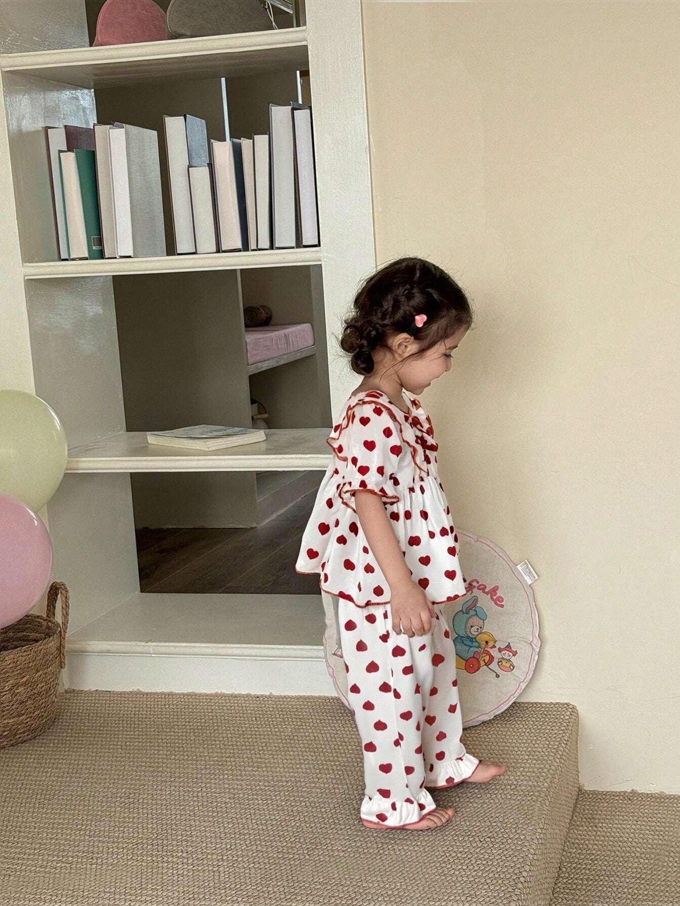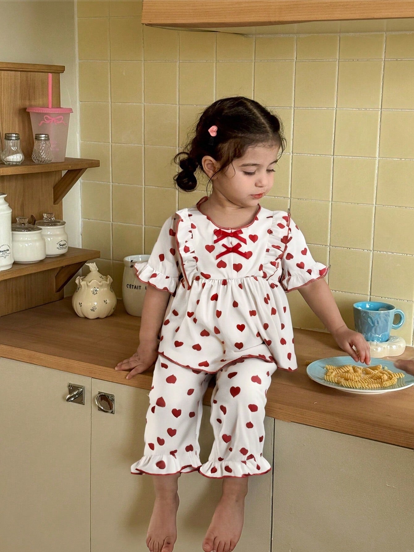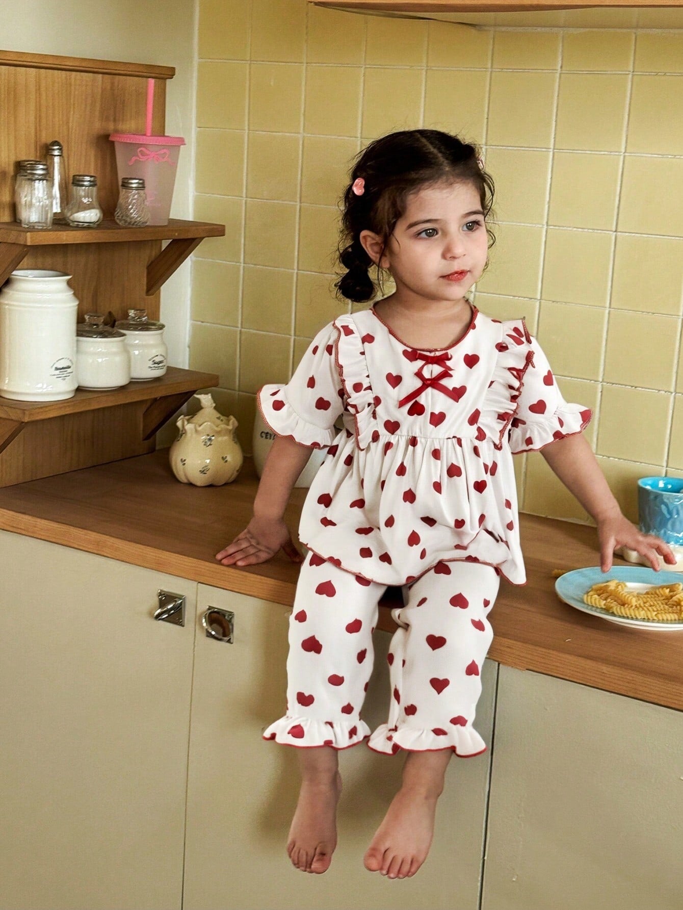 طقم بيجامة من قطعتين من SHEIN للفتيات الصغيرات بنمط قلب بسيط وجذاب مع تفاصيل كشكشة وأكمام قصيرة وبنطلون ناعم ومريح