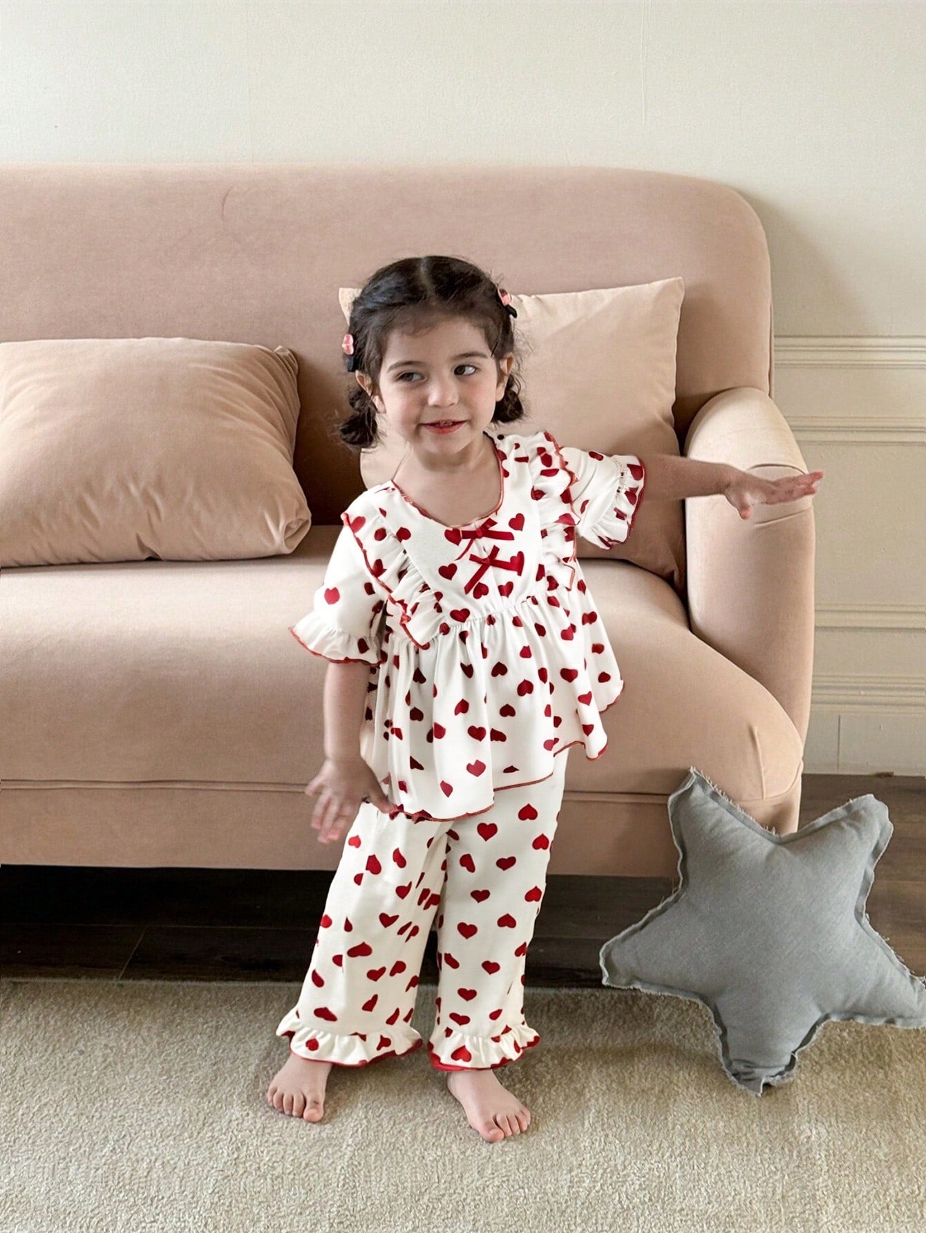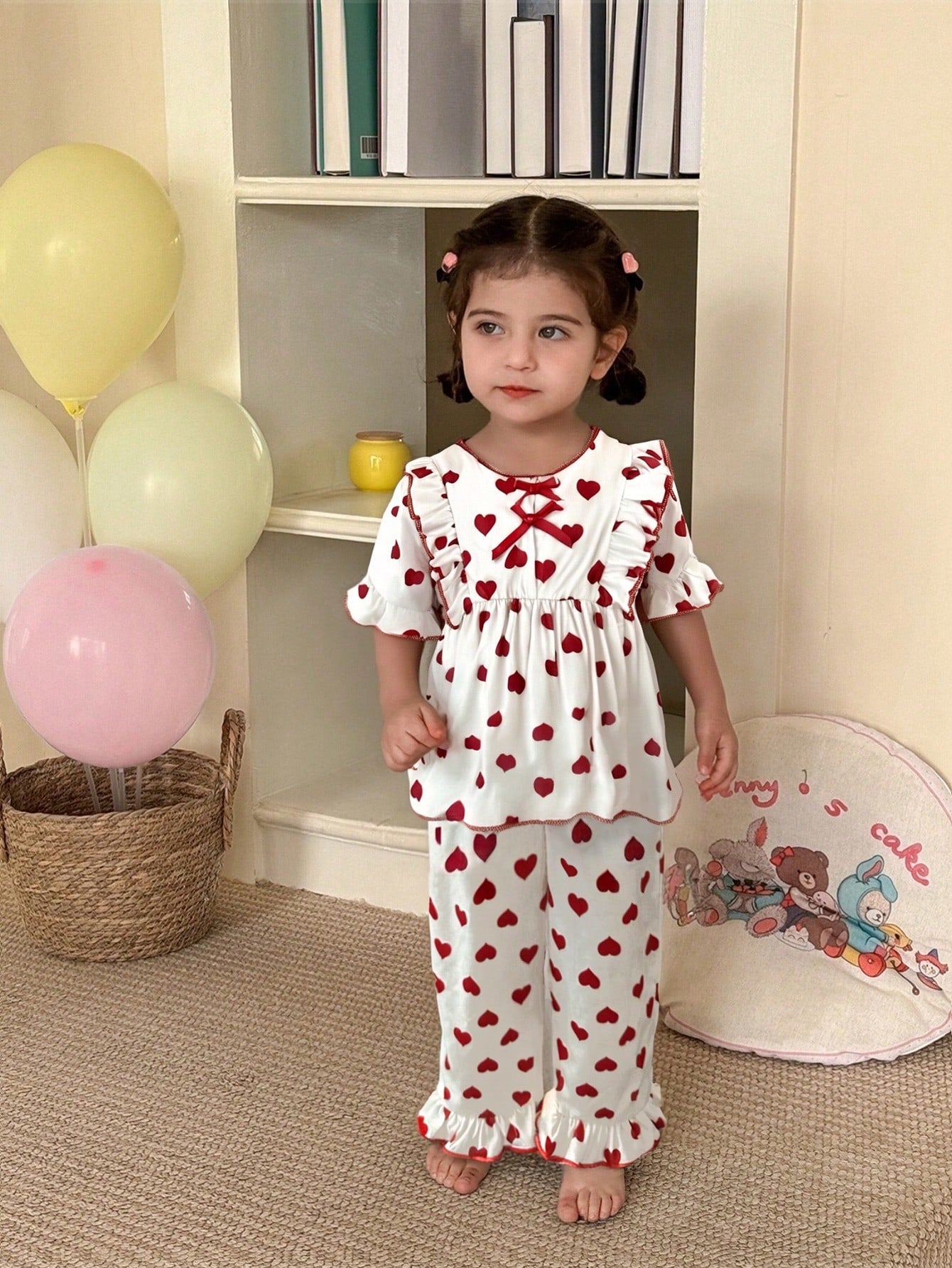 kids SHEIN 2pcs Baby Girl Baby Girl Cute Minimalist Heart Pattern Bow & Ruffle Detail Short Sleeve T-Shirt & Pants Soft Comfortable Homewear Pajama Set