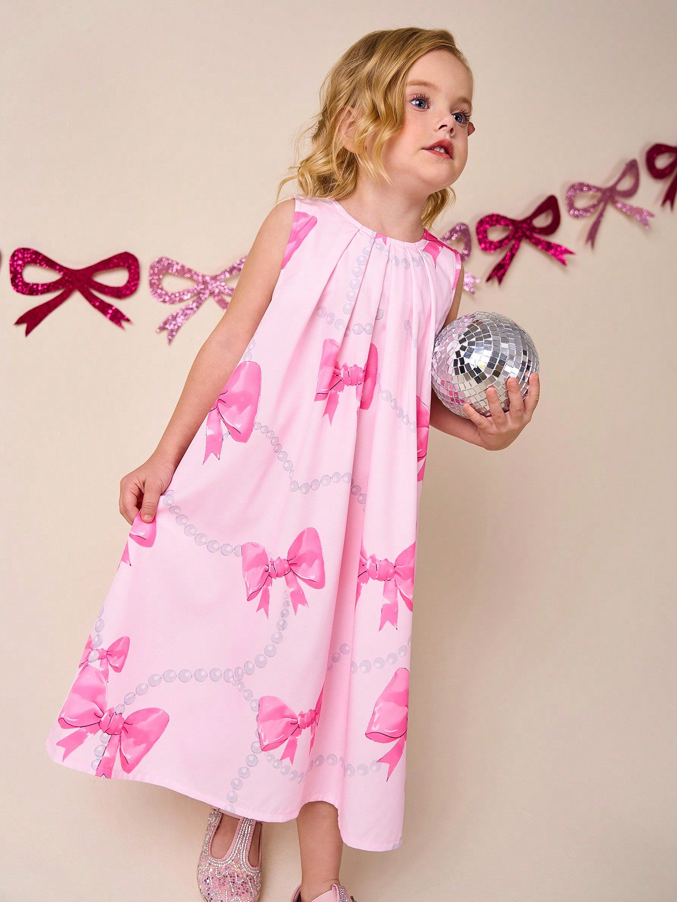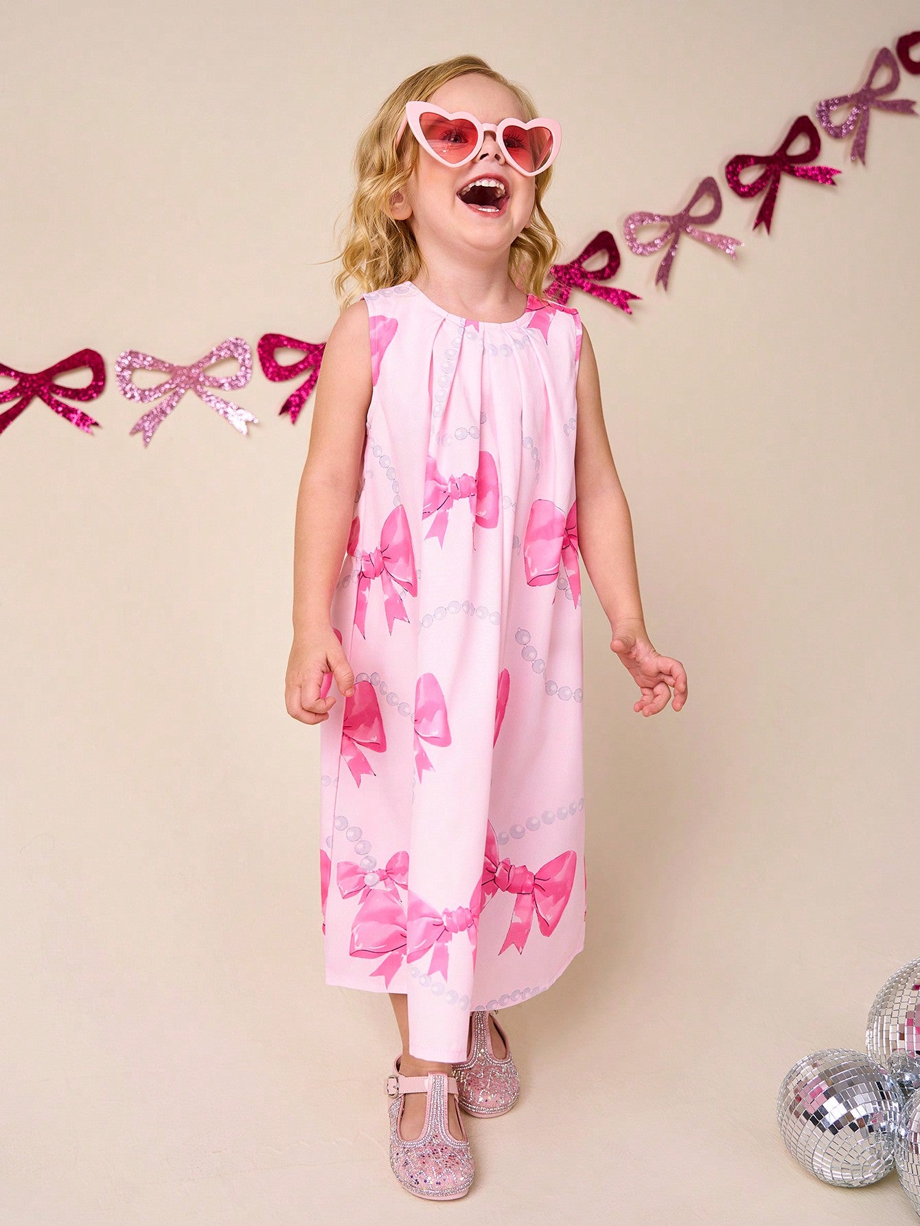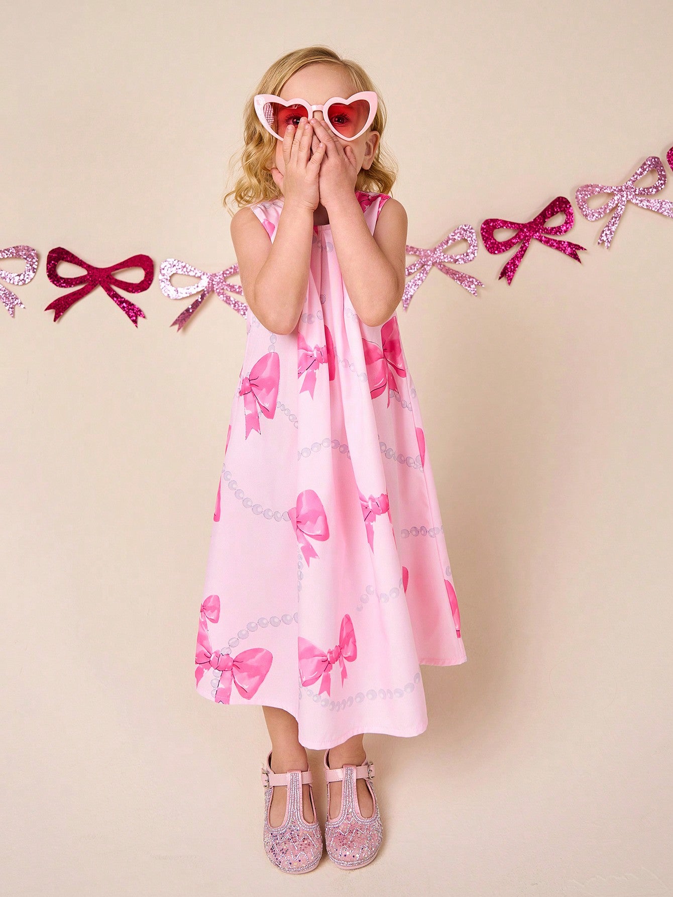 kids SHEIN Girls Valentine's Day Cute Bow & Pearl Allover Print Ruffle Detail Decor Sleeveless Dress For Young Girl