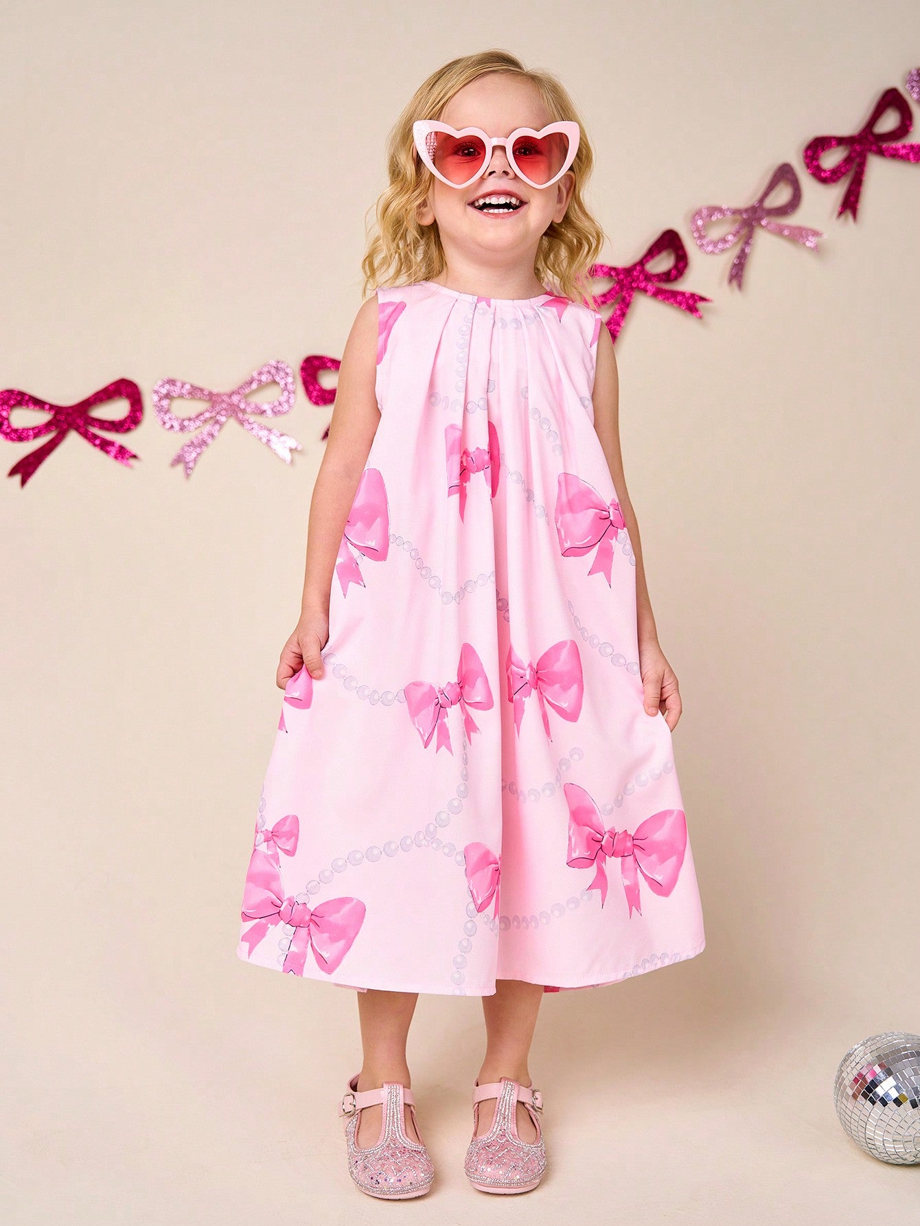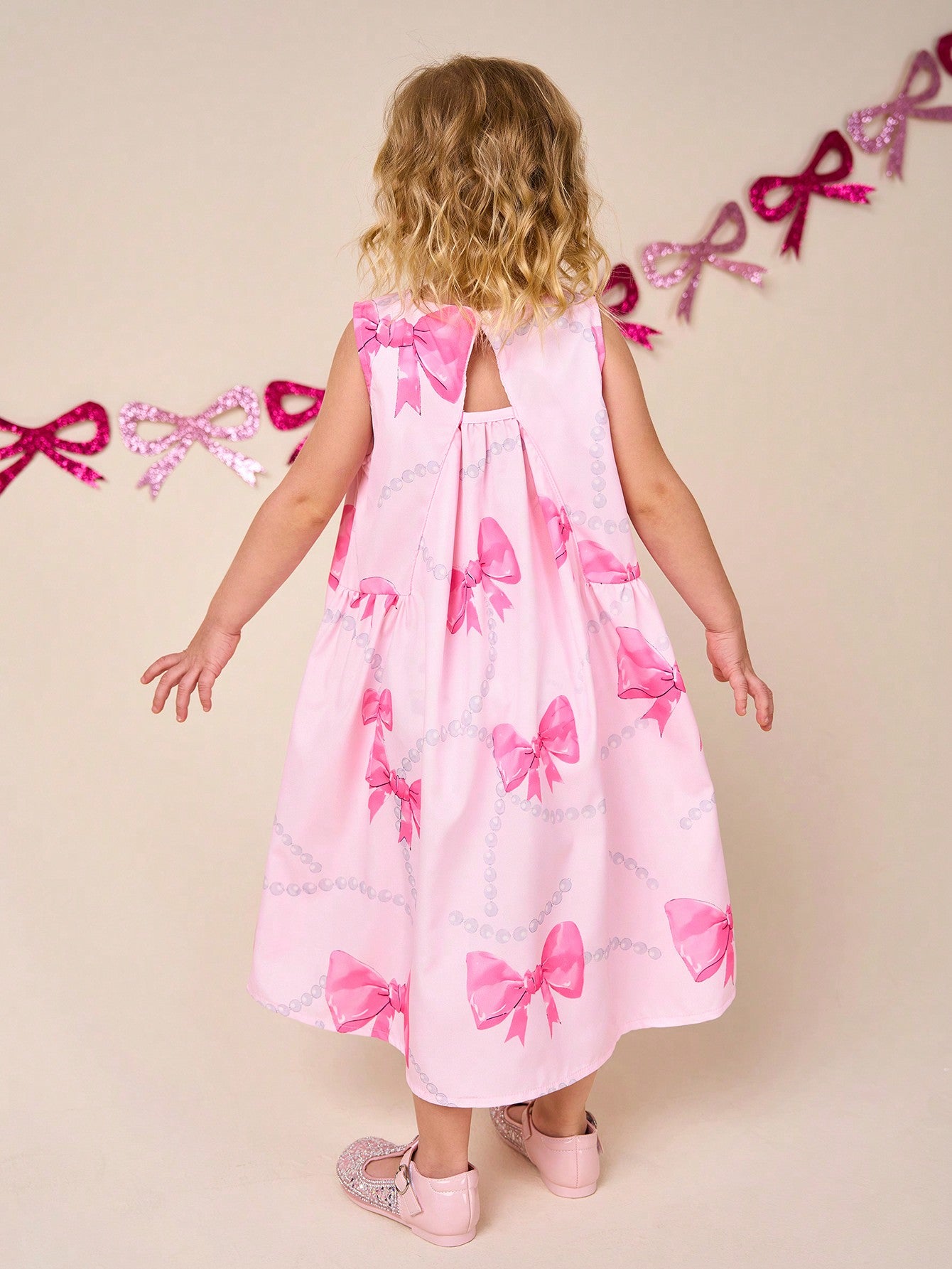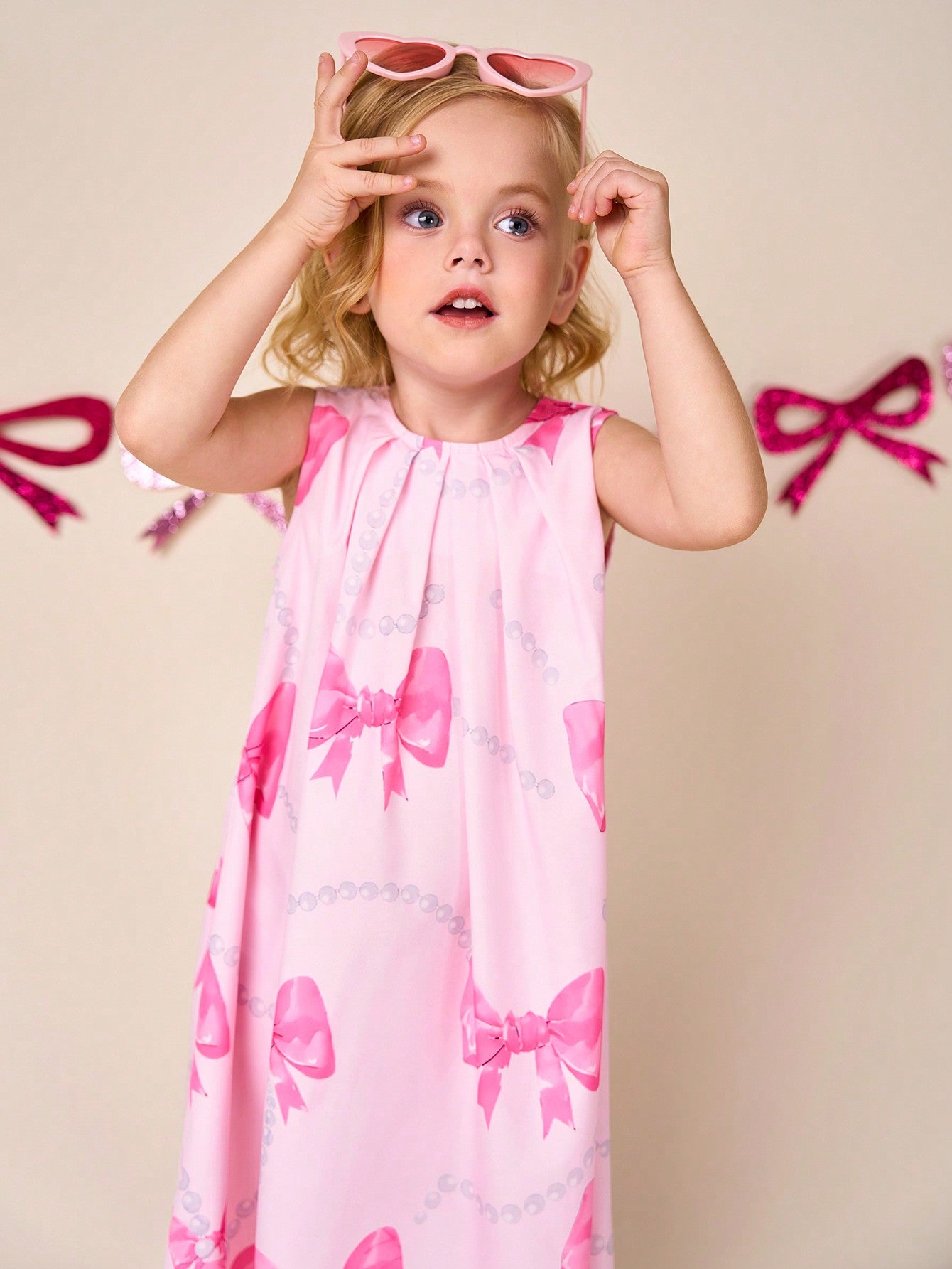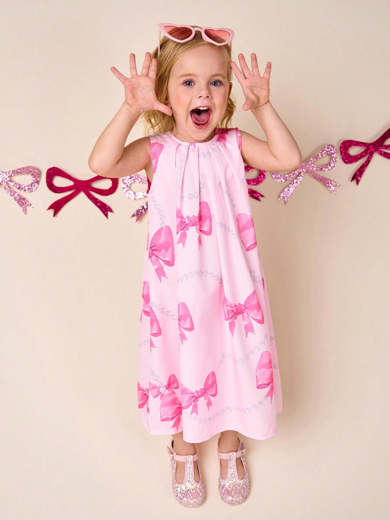 kids SHEIN Girls Valentine's Day Cute Bow & Pearl Allover Print Ruffle Detail Decor Sleeveless Dress For Young Girl