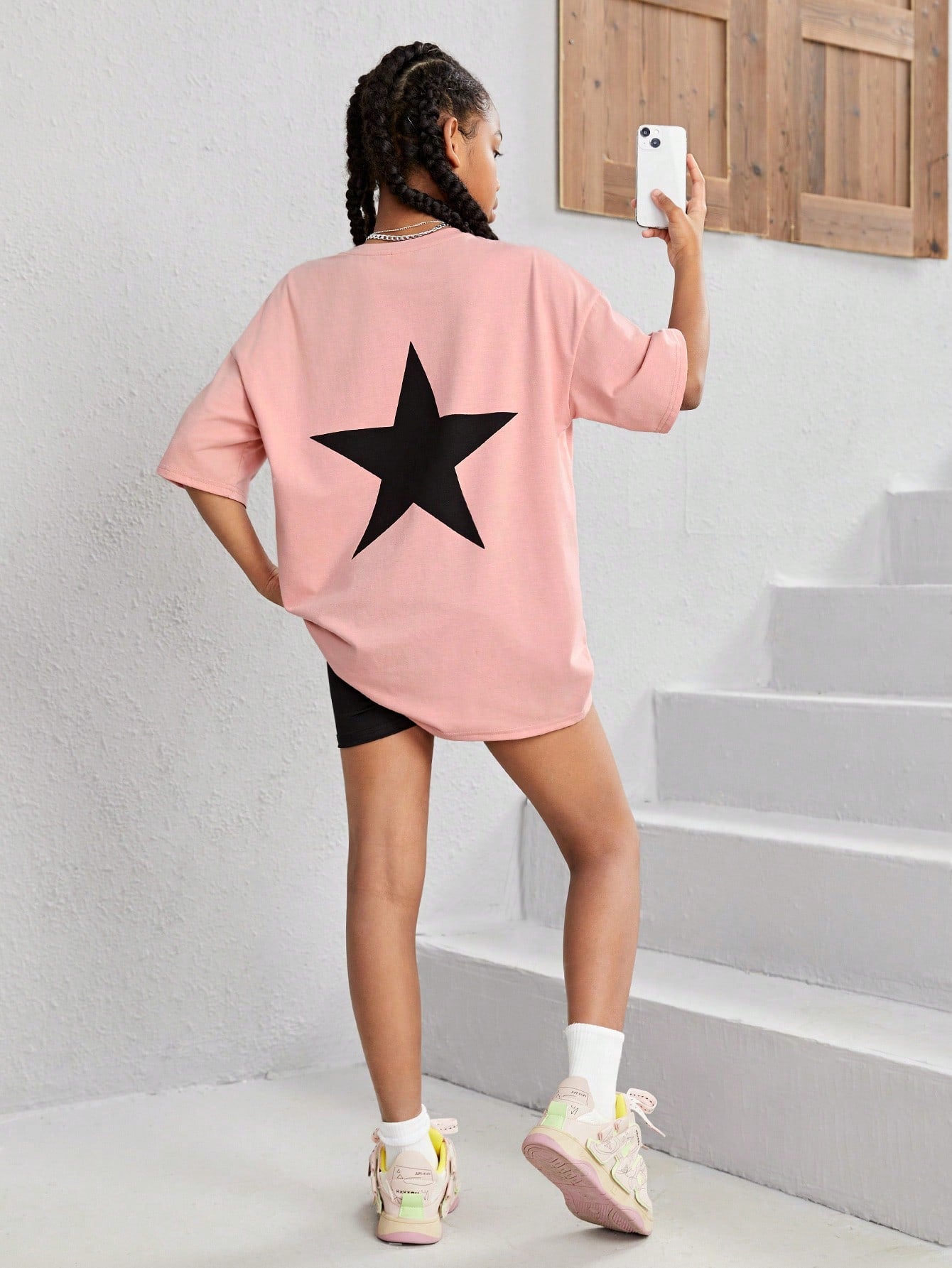 SHEIN Tween Girl Everyday Casual Knit Round Neck Star Printed Short Sleeve T-Shirt