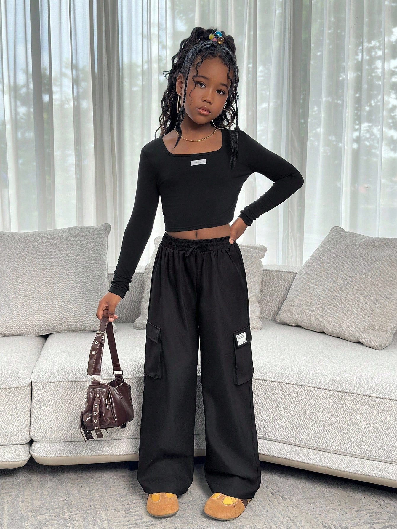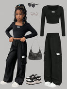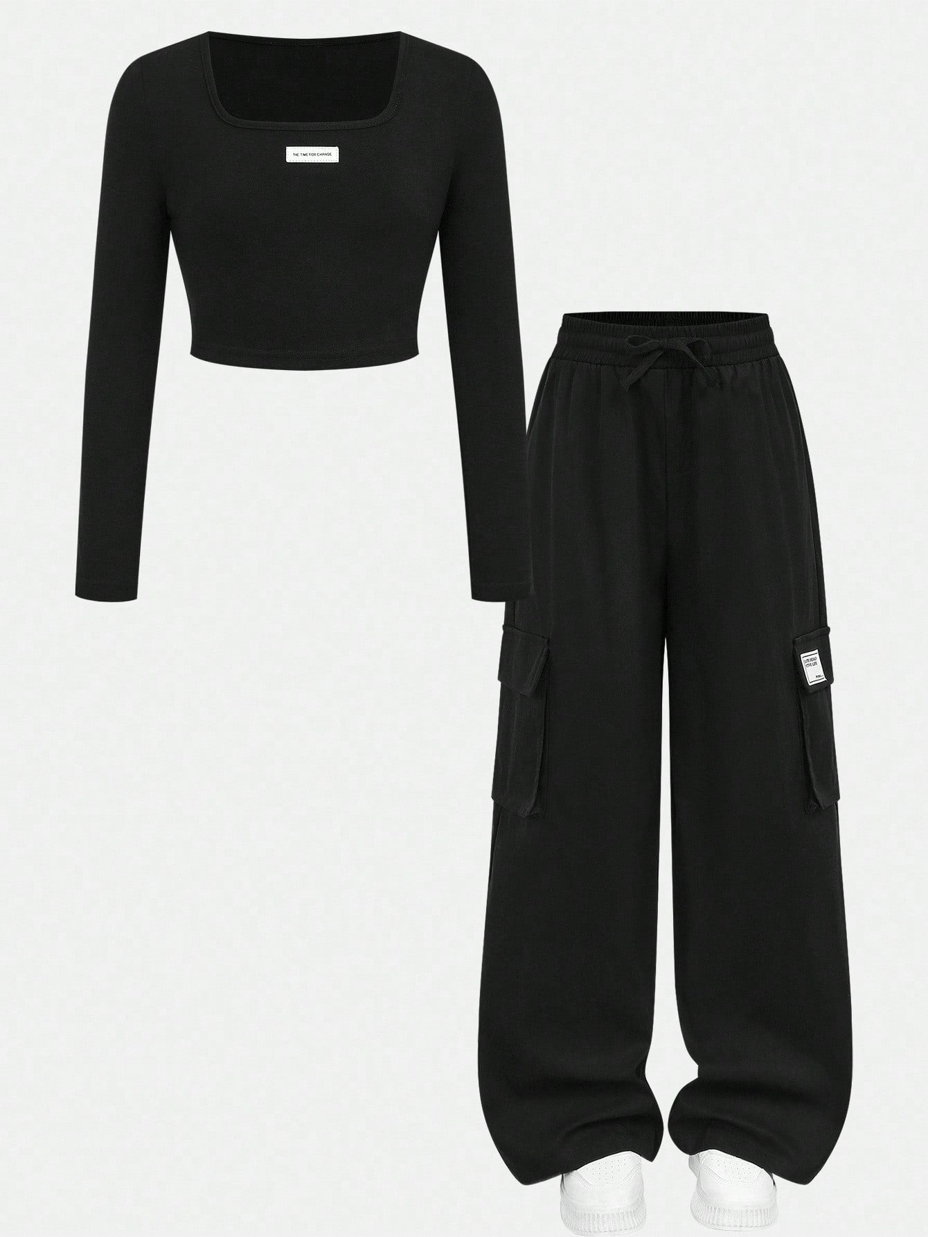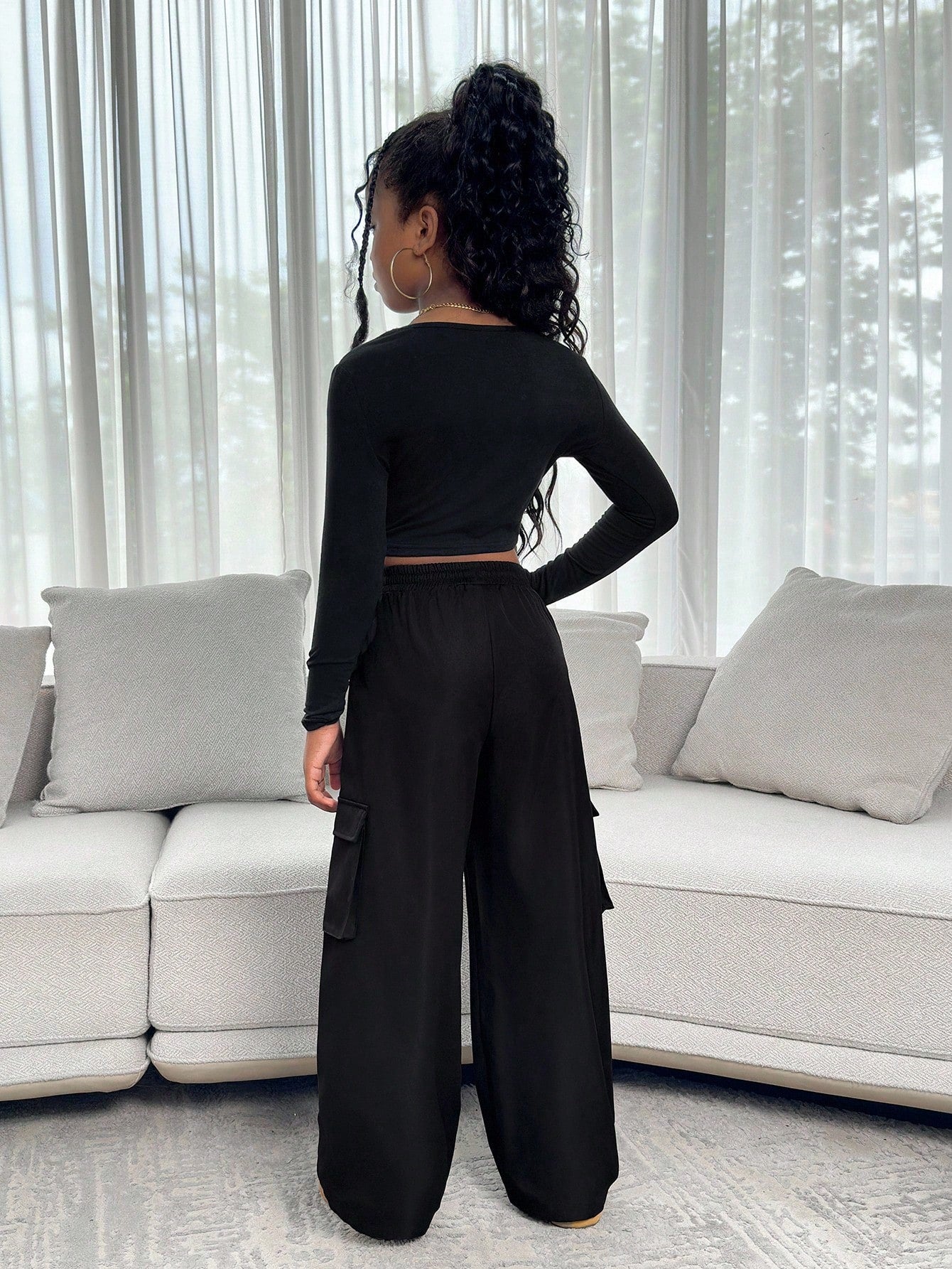 طقم ملابس كاجوال للفتيات المراهقات، يتكون من بلوزة بياقة عالية وأكمام طويلة وبنطال فضفاض بجيوب جانبية.