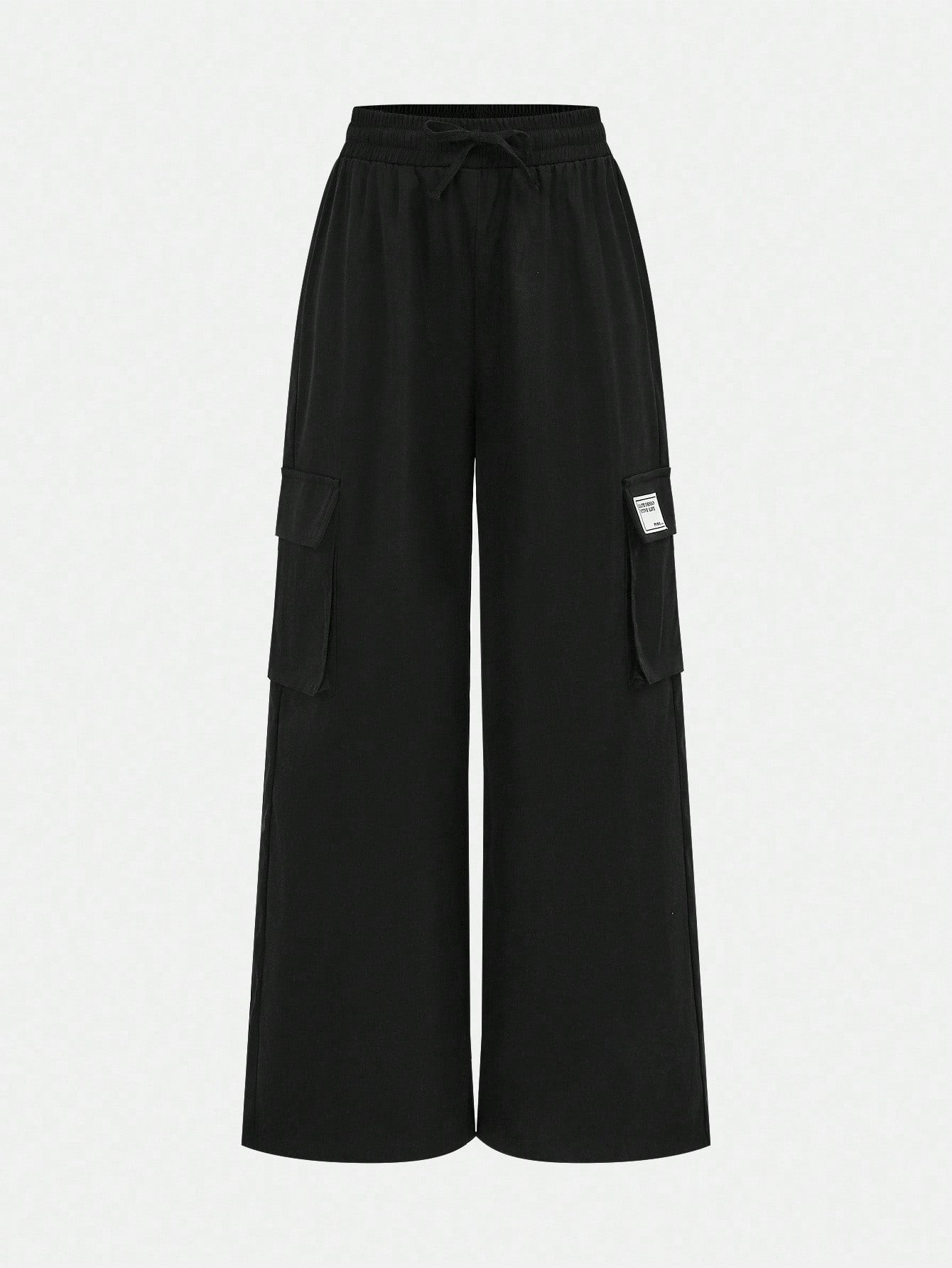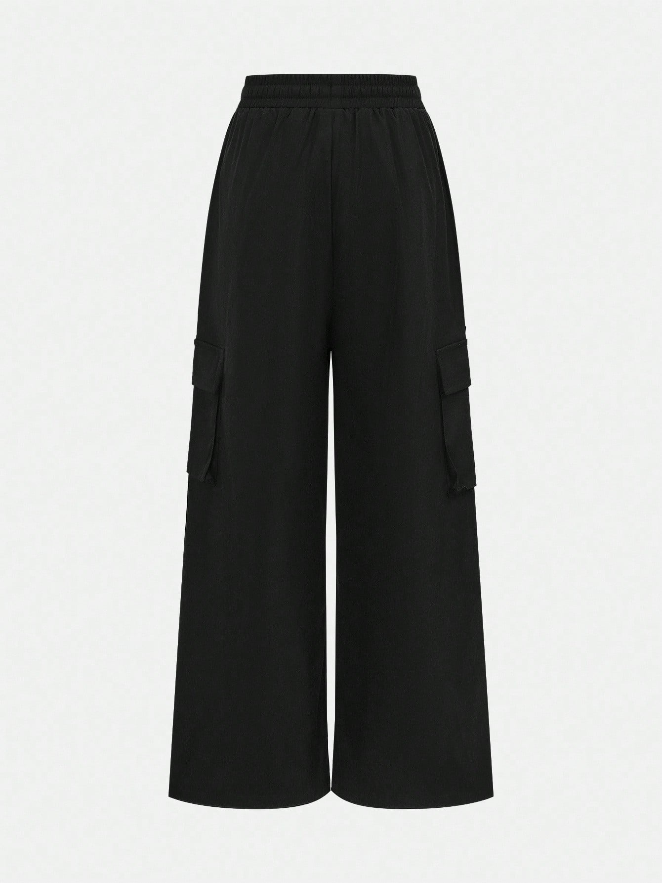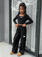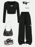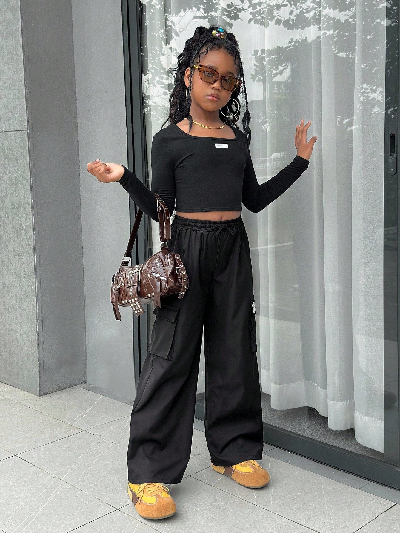 طقم ملابس كاجوال للفتيات المراهقات، يتكون من بلوزة بياقة عالية وأكمام طويلة وبنطال فضفاض بجيوب جانبية.