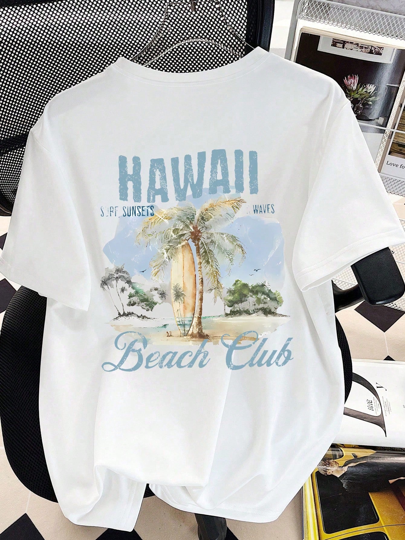 تيشيرت بسيط وعصري للفتيات الصغيرات، بنقشة شجرة جوز الهند هاواي، حروف زرقاء، تصميم مستوحى من شاطئ البحر.