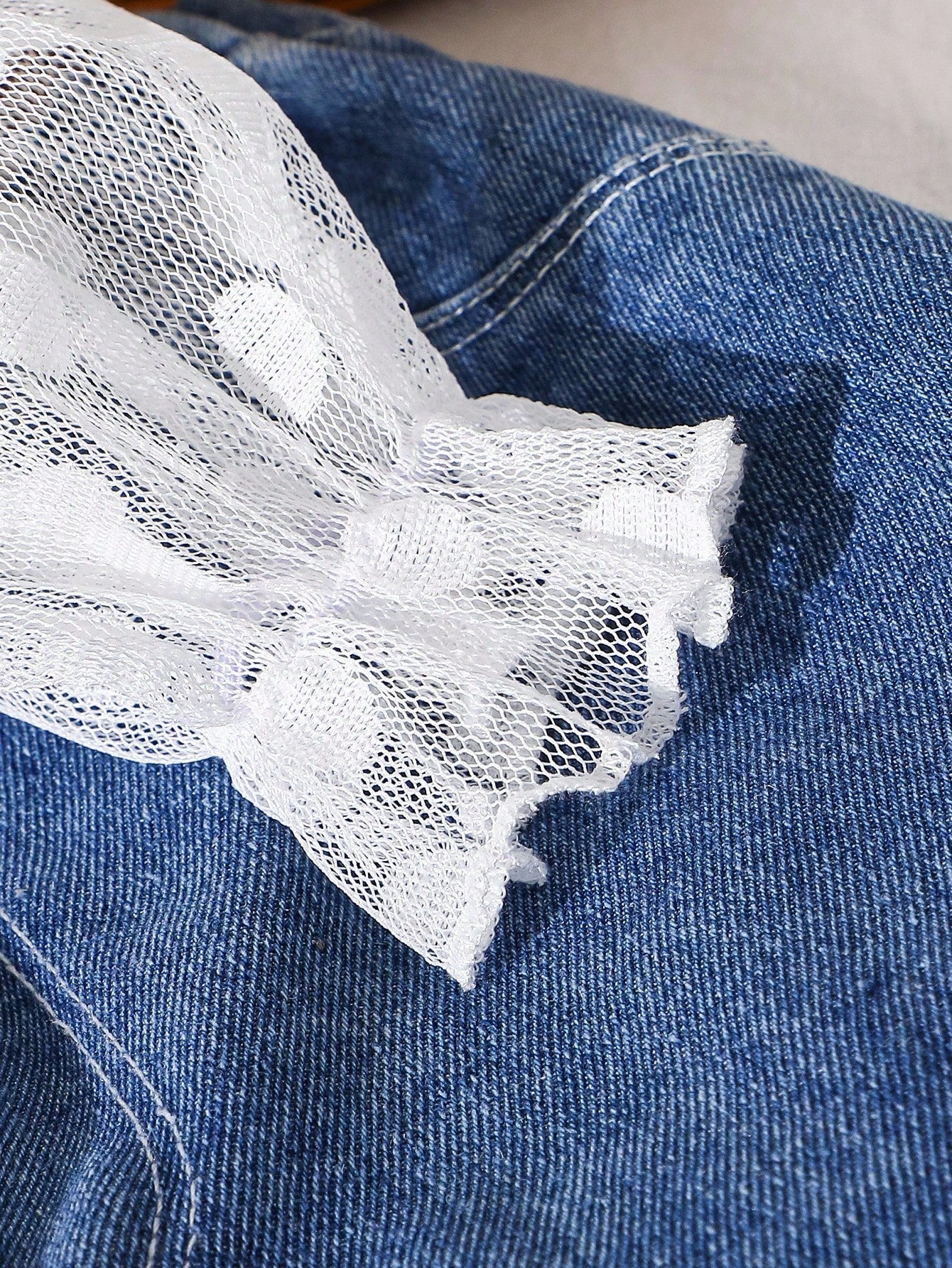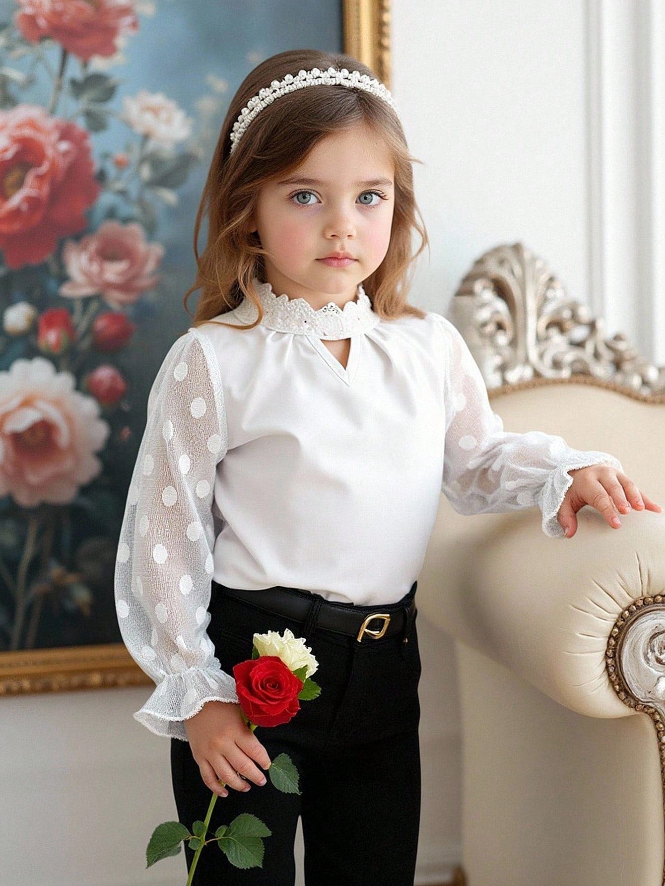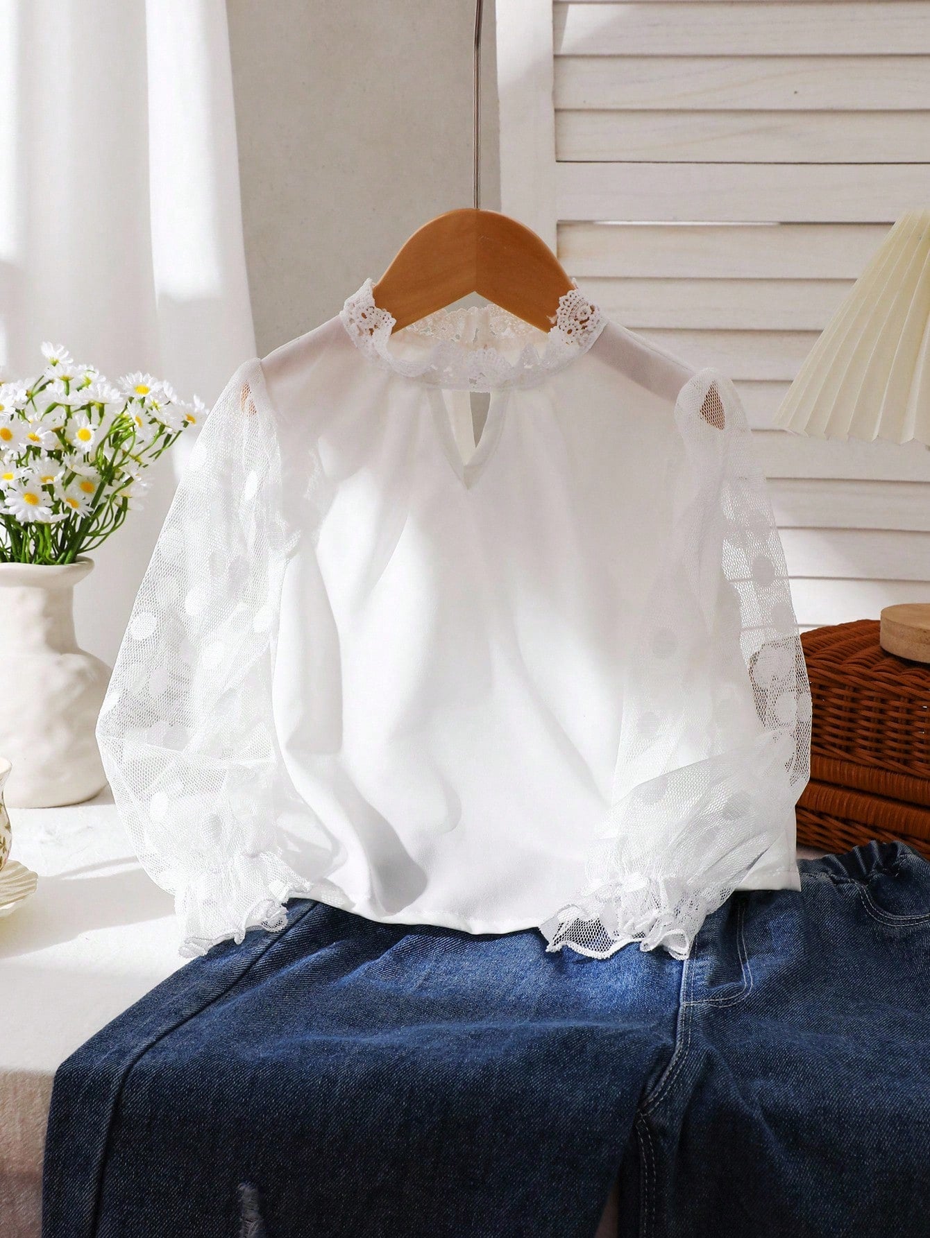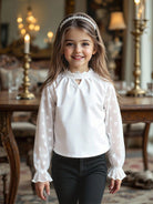 بلوزة بيضاء بأكمام طويلة منقطة من قماش شبكي ناعم ومريح بياقة مكشكشة، مناسبة للارتداء اليومي غير الرسمي للفتيات الصغيرات