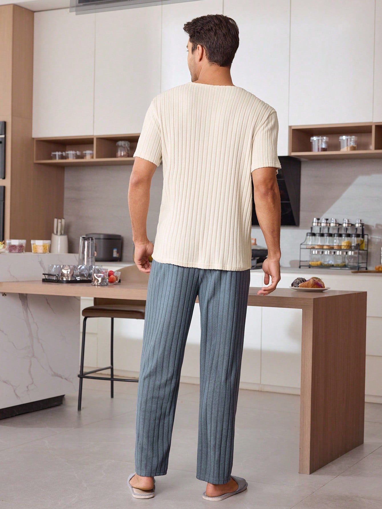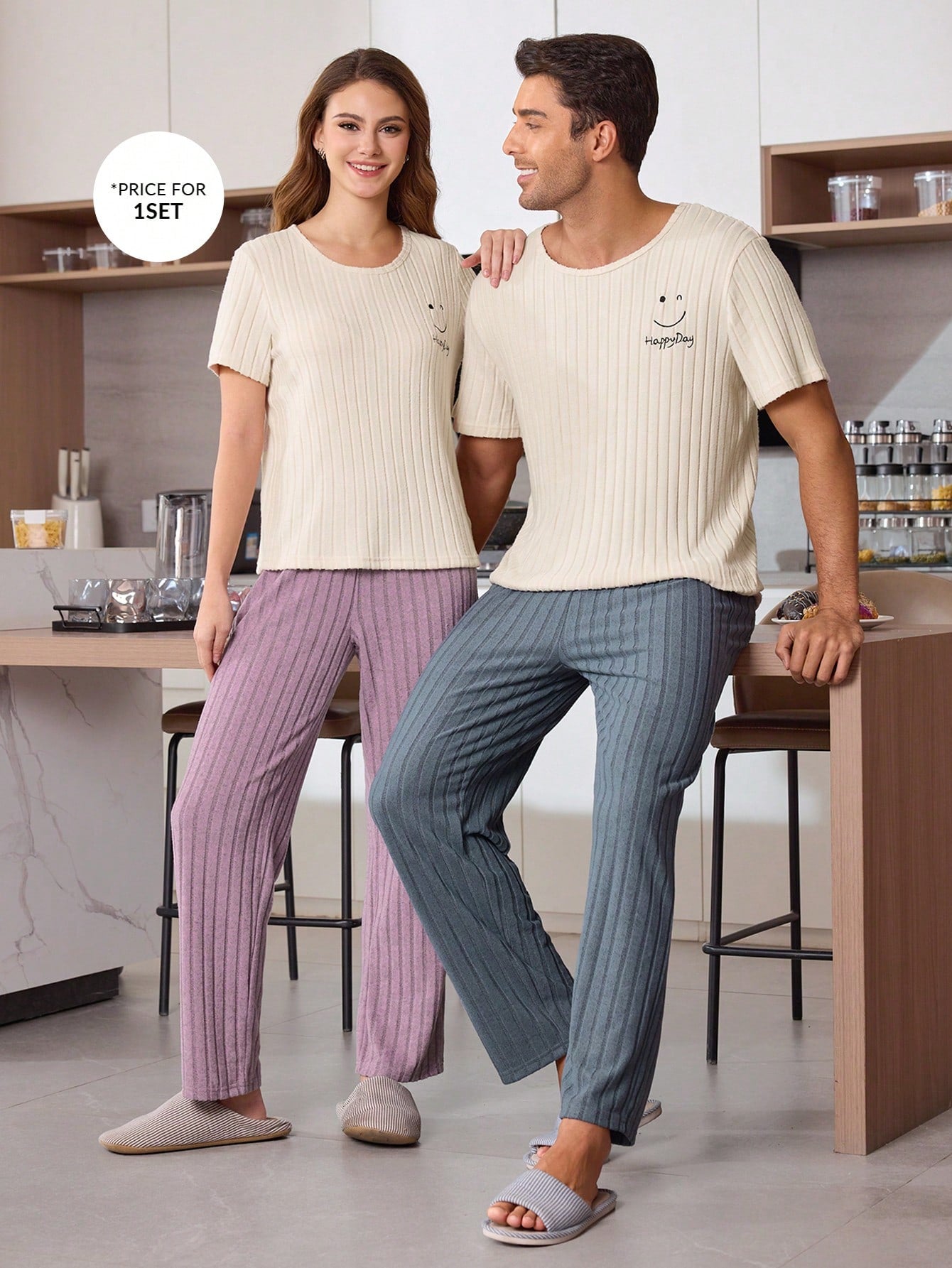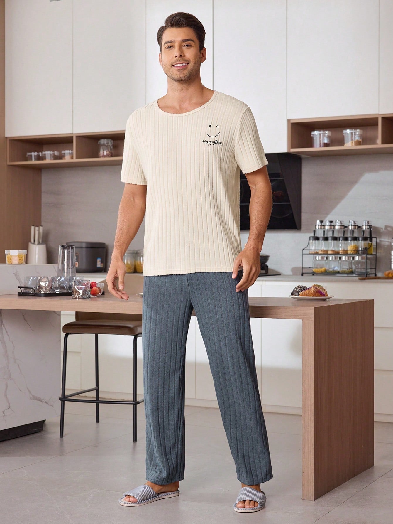 طقم ملابس منزلية رجالي من CoupledUp مكون من بلوزة بأكمام قصيرة وبنطلون طويل مع تطريز وجه مبتسم وحروف