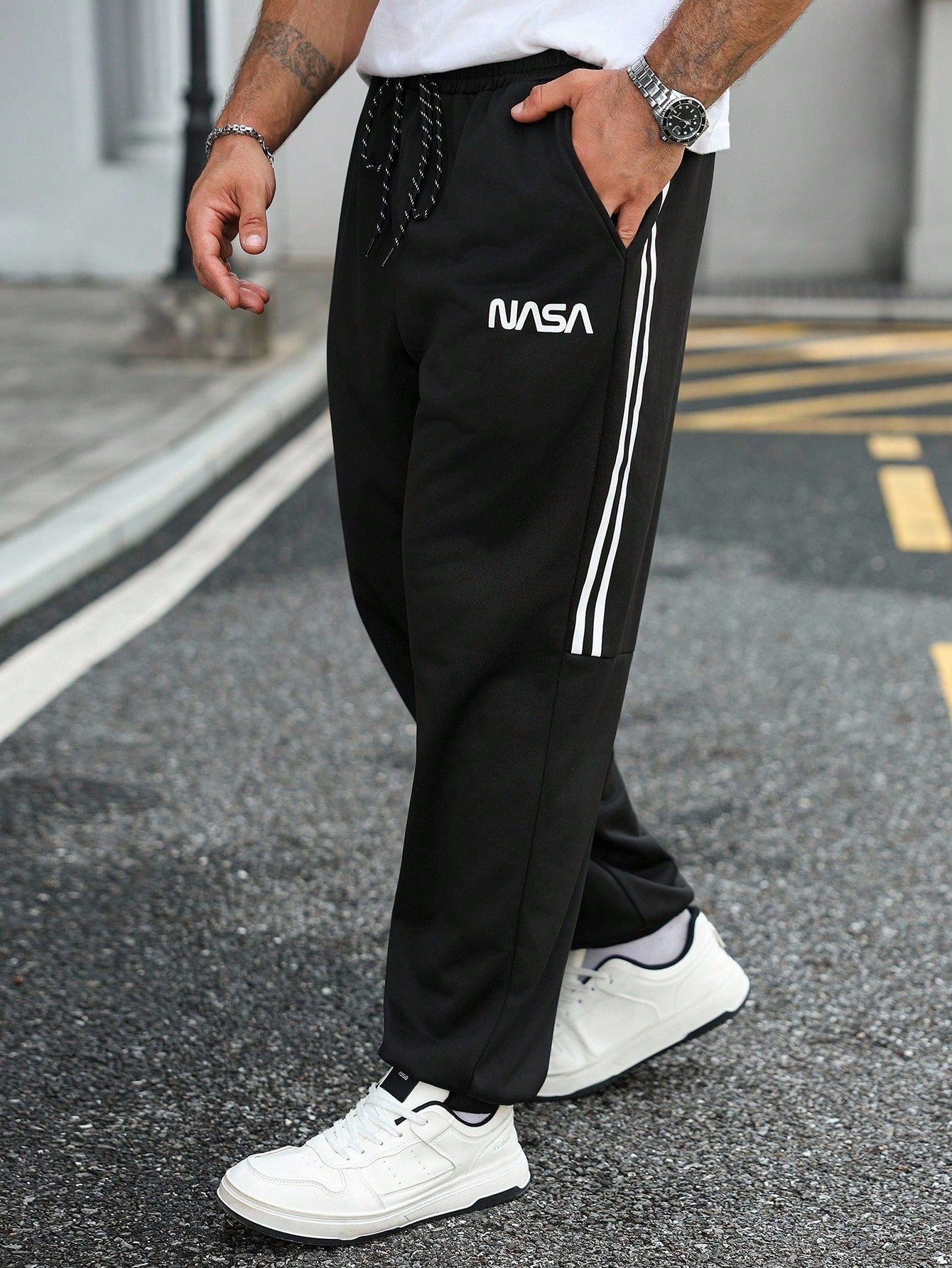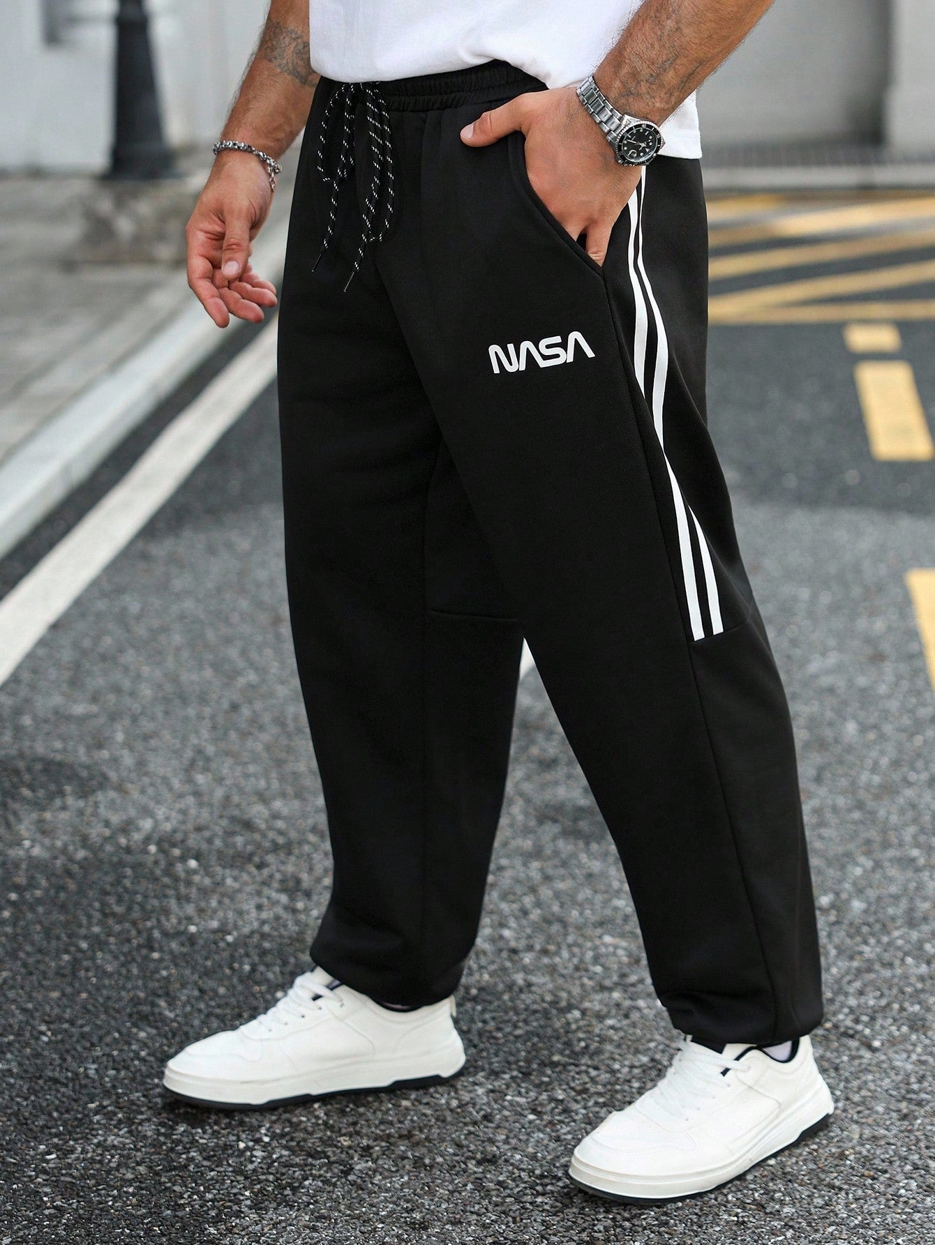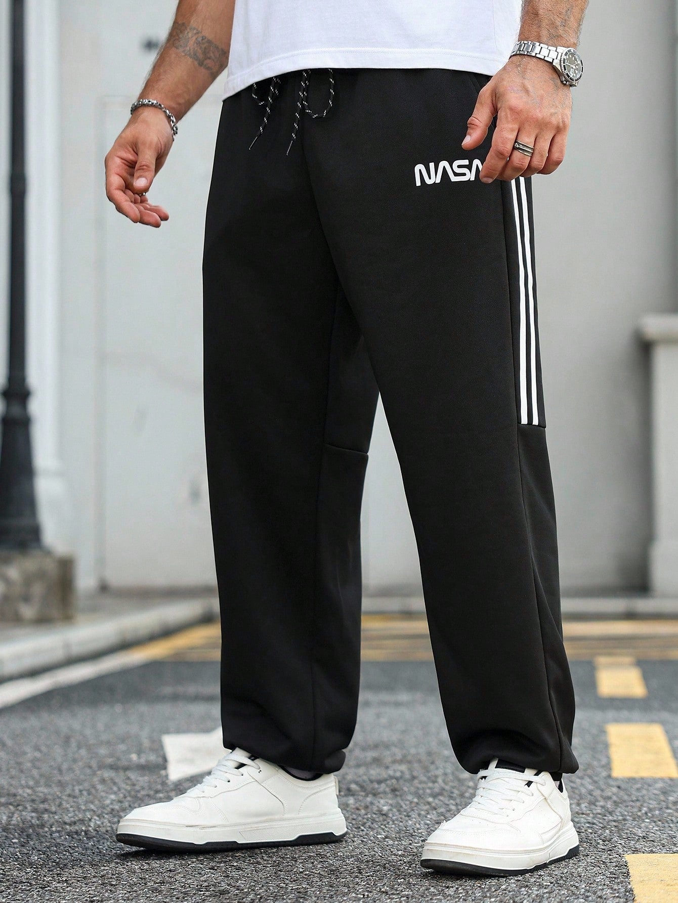 بنطال رياضي رجالي من مانفينيتي هوم، مقاسات كبيرة، كاجوال يومي، بنقشة حروف مخططة ومرقعة.