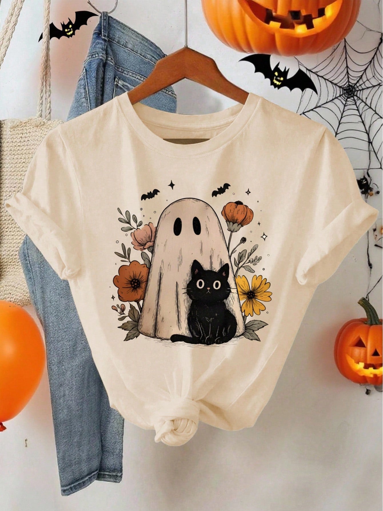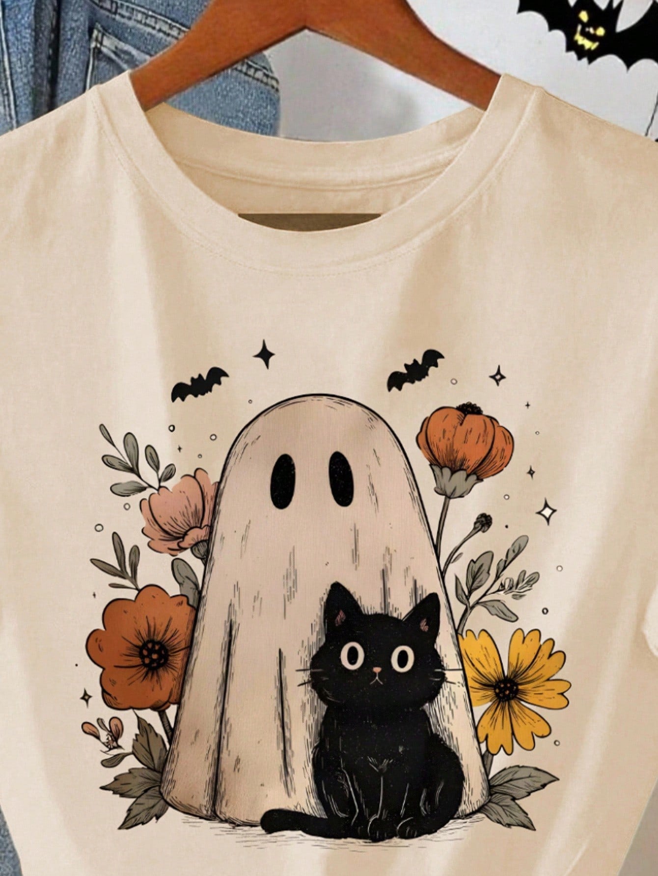 تيشيرت نسائي فضفاض بياقة دائرية مزين برسومات زهور وأشباح لطيفة للهالوين من إيمري روز